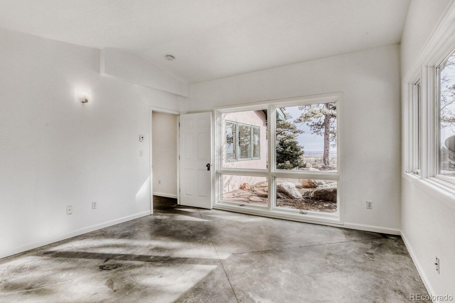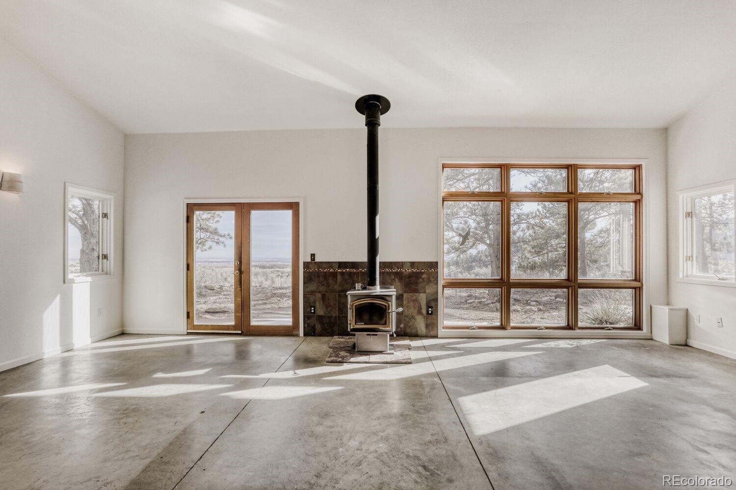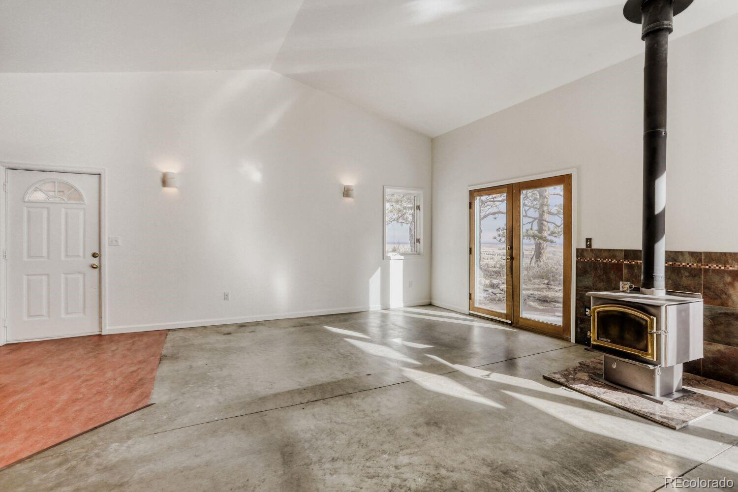 Perched at the top of a private driveway, this rare property offers unobstructed, sweeping views of the Front Range plains, foothills, and iconic Flatirons. South-facing and thoughtfully designed, the home captures abundant natural light and benefits from passive solar warmth, beautifully complemented by modern concrete flooring throughout. An open floor plan with vaulted ceilings enhances the airy feel, while the centrally located wood-burning stove adds cozy warmth and charm to the main living space. Step outside to the south-facing flagstone patio and take in the captivating, ever-changing views—perfect for relaxing or entertaining. Recent updates include a new septic tank, fresh paint, and other improvements, making this home move-in ready. With solid construction and potential to expand, this is a truly special opportunity in an exceptional setting.