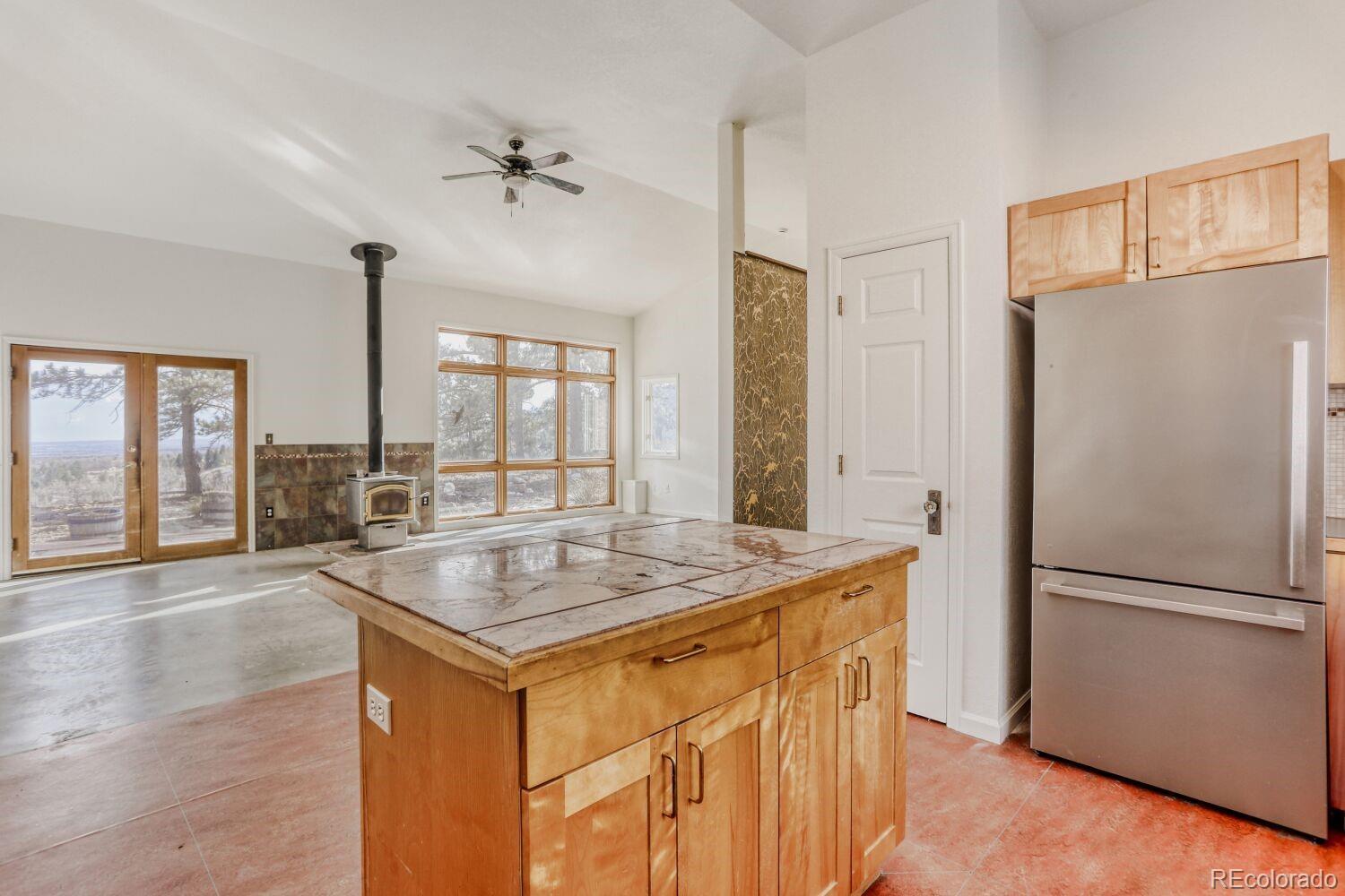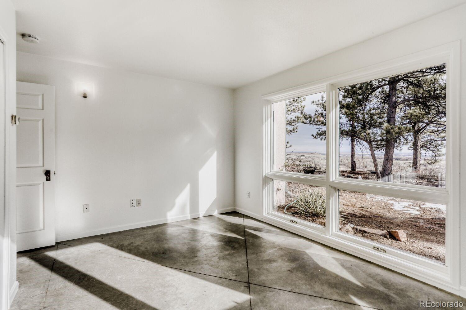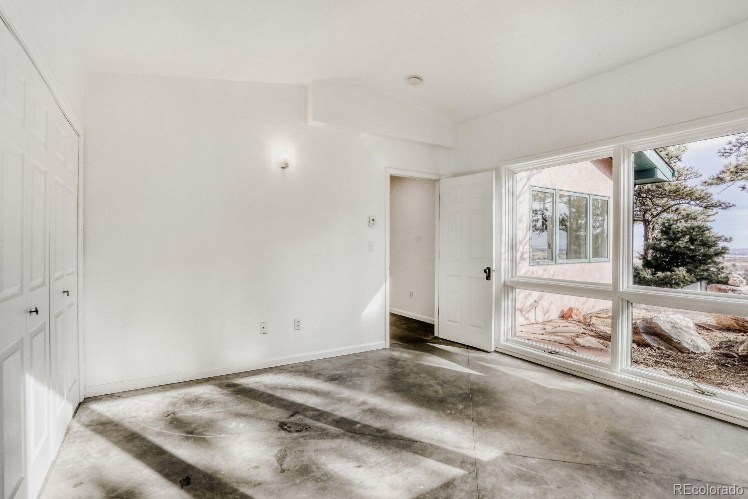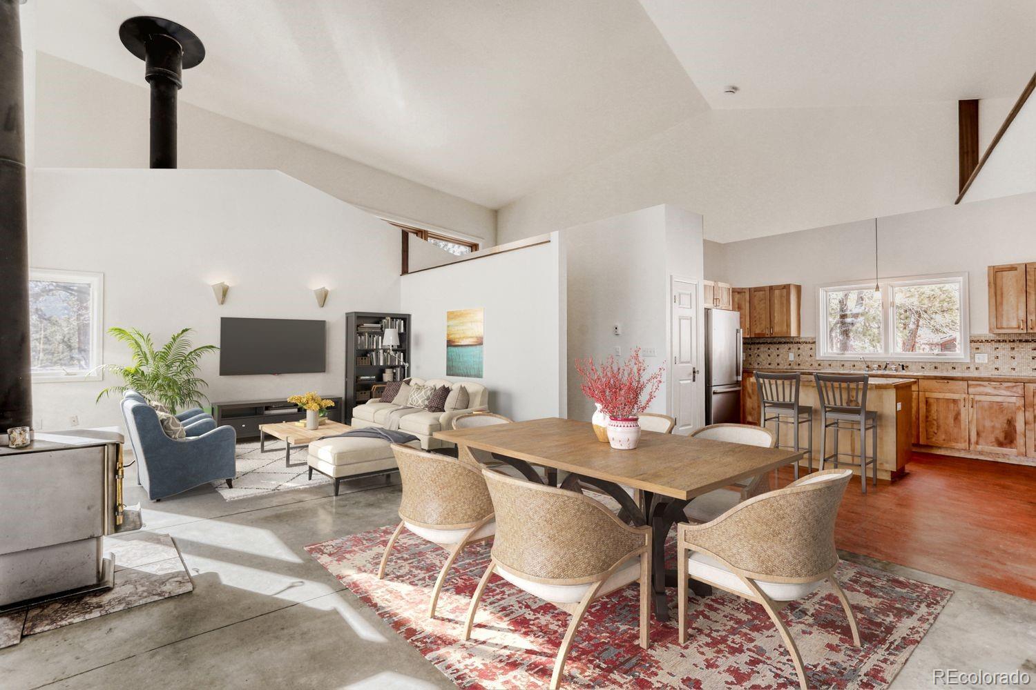 Perched at the top of a private driveway, this rare property offers unobstructed, sweeping views of the Front Range plains, foothills, and iconic Flatirons. South-facing and thoughtfully designed, the home captures abundant natural light and benefits from passive solar warmth, beautifully complemented by modern concrete flooring throughout. An open floor plan with vaulted ceilings enhances the airy feel, while the centrally located wood-burning stove adds cozy warmth and charm to the main living space. Step outside to the south-facing flagstone patio and take in the captivating, ever-changing views—perfect for relaxing or entertaining. Recent updates include a new septic tank, fresh paint, and other improvements, making this home move-in ready. With solid construction and potential to expand, this is a truly special opportunity in an exceptional setting.