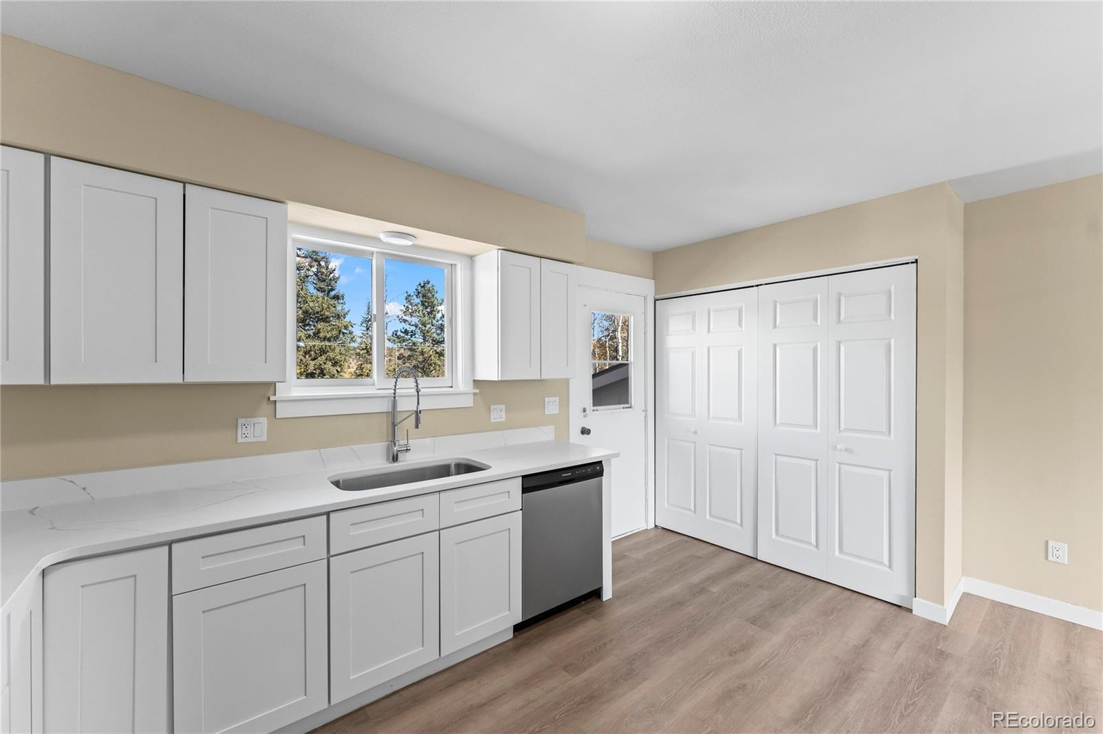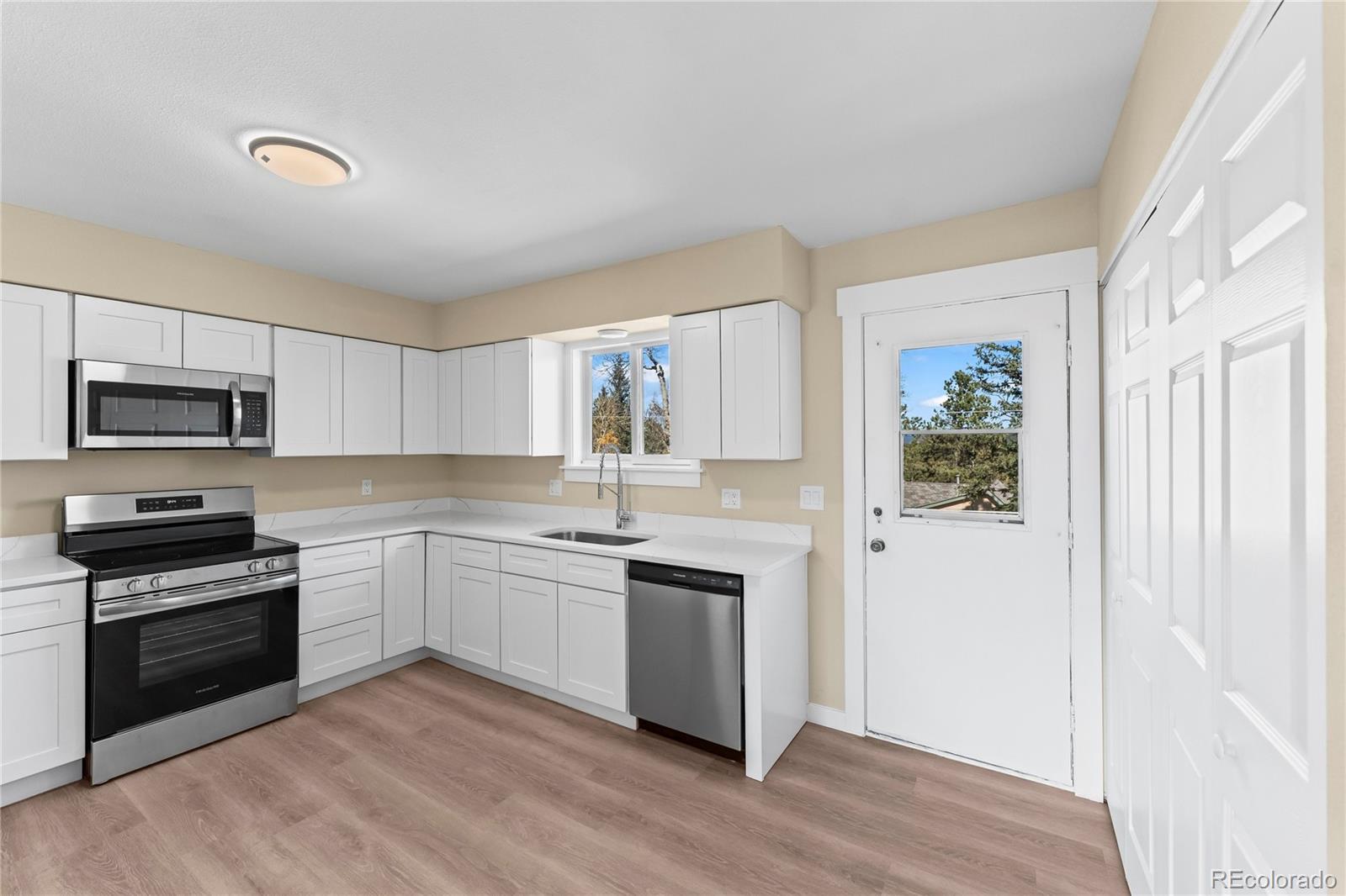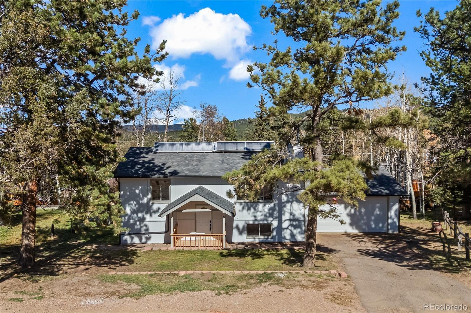 Fresh, bright, and newly remodeled in Woodland Park. Set among mature pines on a gently sloping, usable lot, this 3-bed, 2-bath split-level blends mountain living with modern finishes. The house also has a bonus room that can be used as a large walk in closet, office or additional sleeping space. Inside, brand-new LVP flooring flows throughout and new interior paint keeps everything light and airy. The all-new kitchen shines with white shaker cabinets, quartz countertops, and stainless steel appliances—an inviting hub for meals and gatherings. Both bathrooms are fully updated with dual vanities and sleek tile showers for everyday ease. Two generous living areas offer flexible space for relaxing, entertaining, or working from home. The large laundry/utility room (with sink) keeps gear and projects organized, and the attached garage adds everyday convenience. On the roof, active solar thermal panels serve the water heater with electric backup—designed for comfort and efficiency. Outside, enjoy a spacious yard under towering pines plus a deck for grilling and stargazing. Westwood Lakes Community residents enjoy access to a private lake. Walk to the college, and reach local shops, dining, and healthcare—including the hospital—within a short drive. Trails, lakes, and endless Pike Peak–area recreation are close at hand. Schedule your showing today!