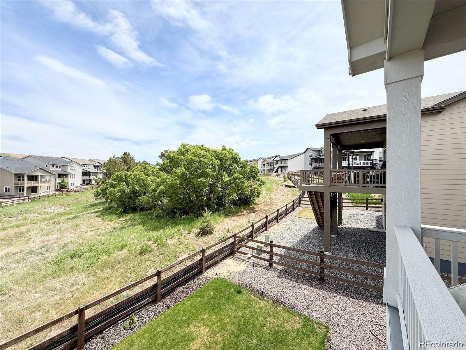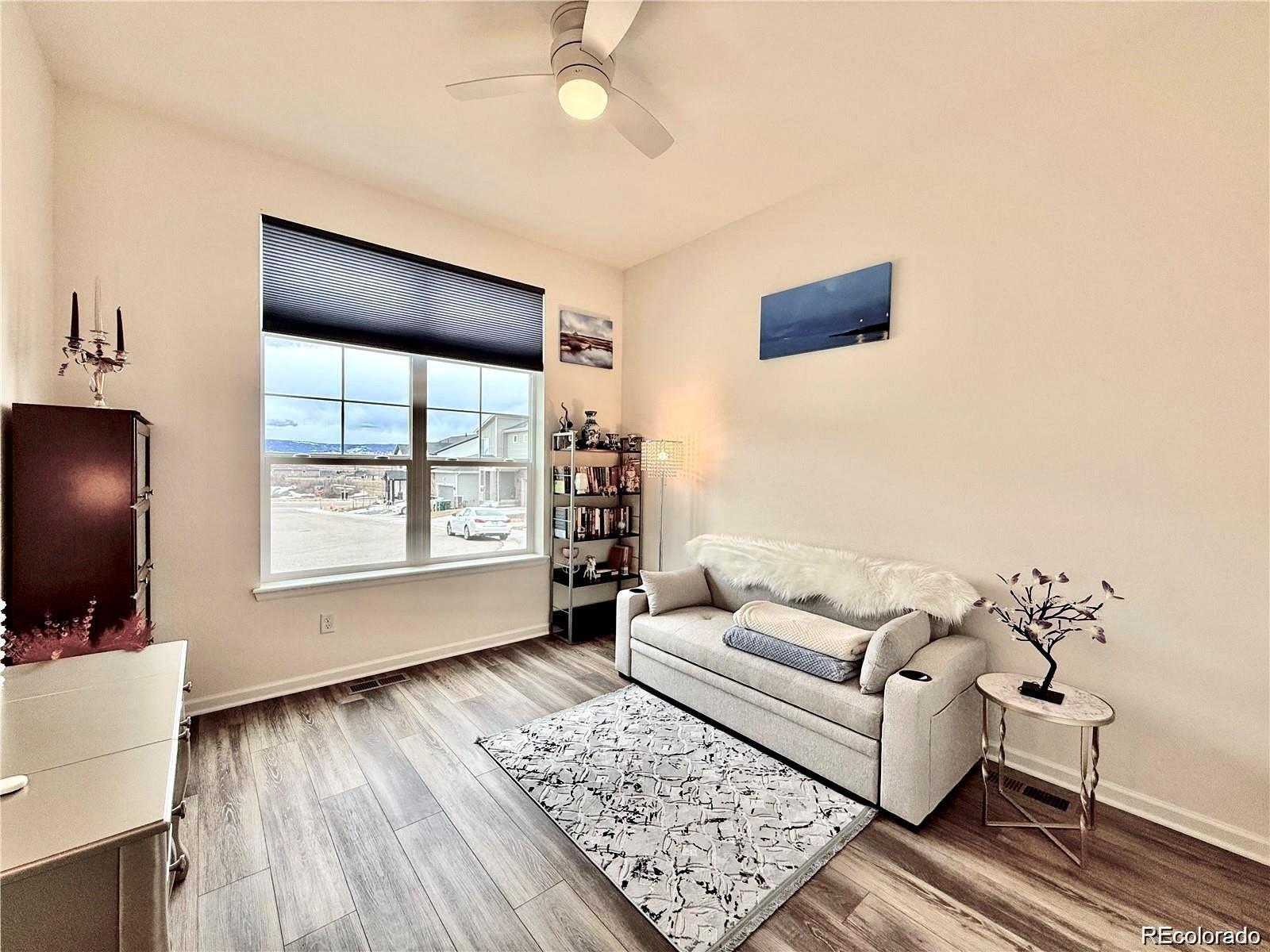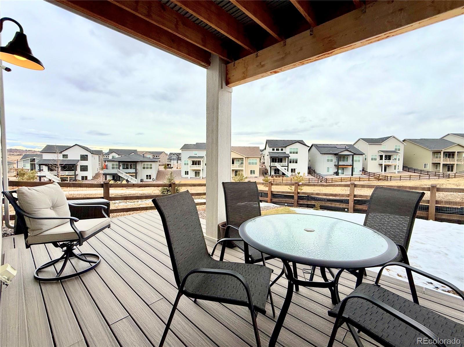 Perfectly positioned on a corner lot backing to open space, this beautifully upgraded ranch-style home offers privacy, scenic views, and exceptional livability in one of the community’s most desirable locations. The main level features three bedrooms, one of which is a flexible study/bedroom with its own closet (the original base model included three main-level bedrooms; French doors can easily be added), plus an additional bedroom in the walkout basement—providing excellent versatility for guests, multigenerational living, or work-from-home needs. As you step inside, a spacious entry opens into an open-concept great room designed for both comfort and style. To the left, a versatile room with a closet works perfectly as a home office, library, or creative space and can easily be converted into a private study with elegant French doors or an additional main-level bedroom. One of the home’s standout features is the upgraded extra-light 4-panel sliding door spanning an entire wall, flooding the living area with natural light and framing beautiful panoramic views. Eight-foot interior doors throughout enhance the airy, expansive feel. The northeast-facing backyard provides welcome shade during warm summer days, allowing year-round enjoyment of the surrounding scenery from inside and out. The upgraded primary bathroom is a true retreat, featuring a freestanding soaking tub and a spacious walk-in shower. Motorized blinds in both bedrooms add a touch of modern luxury and convenience. Designed for both relaxation and entertaining, the walkout basement includes a generous bedroom, a large great room, a small gym with mirrors, and a dedicated space with electrical in place for a future sauna. The community itself is amenity-rich, offering a newly built recreation center with a pool, sauna, tennis courts, and a fully equipped gym. With new shops and services emerging west of I-25, this location delivers an exceptional blend of convenience, lifestyle, long-term value.