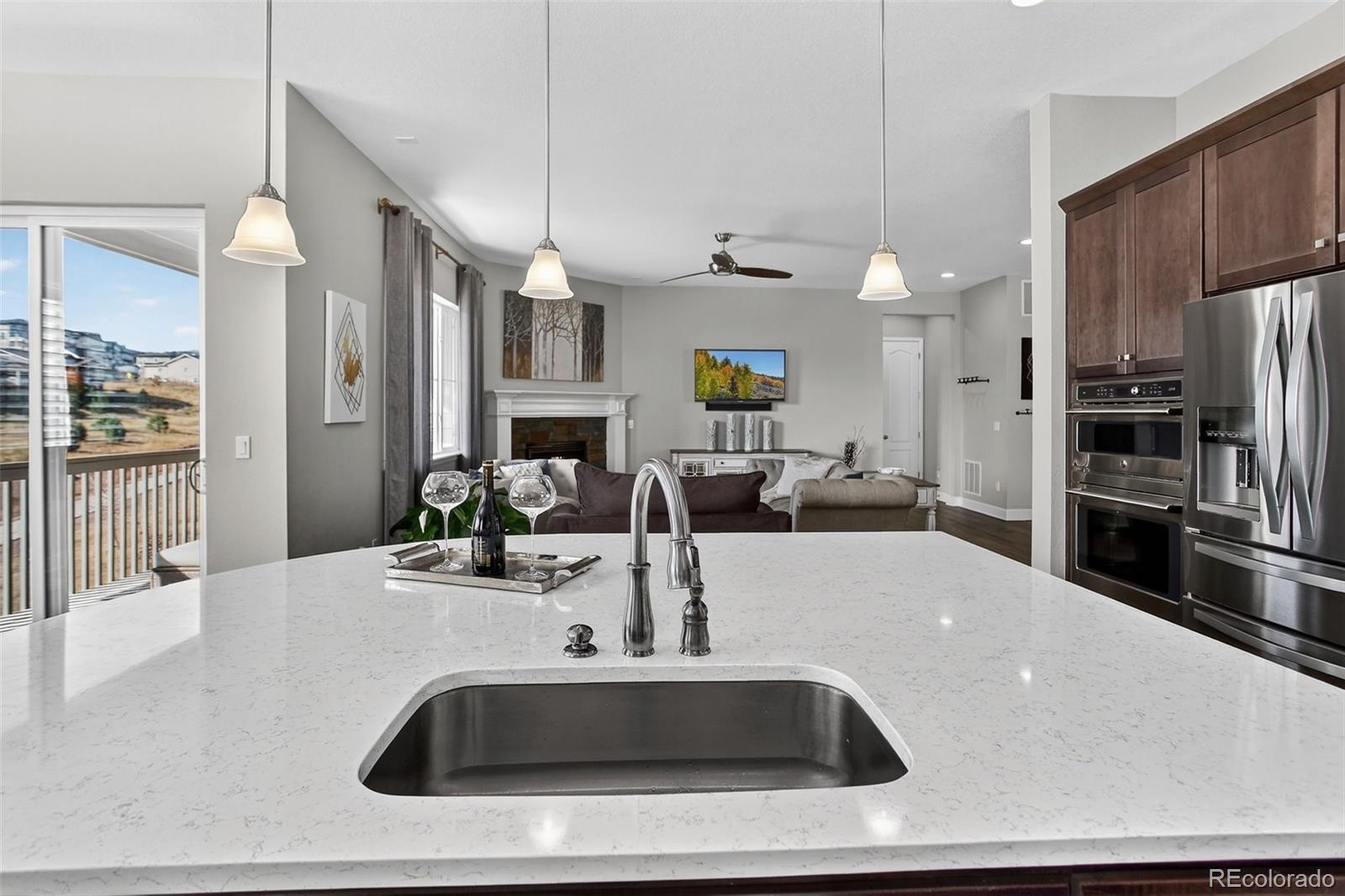 Solar System PAID OFF. This beautiful ranch home delivers a rare multigenerational and income-friendly layout that works for families, investors, or anyone needing extra flexible space. The main level features an open kitchen with quartz counters, upgraded appliances, and a large island flowing into a bright living room with backyard views. The primary suite includes a spacious bath and walk-in closet, plus a second bedroom and full bath on the same level. A standout feature is the private main-level suite with its own exterior entrance, kitchenette, full bath, and dedicated laundry. Use it as a mother-in-law suite, guest quarters, home office/business space, or a short-term rental for additional income. The finished walkout basement adds two more conforming bedrooms, a full bath, an office, and a full kitchen, offering even more possibilities for extended living or rental potential. Outside, enjoy a peaceful setting backing to open space, mature landscaping, and a covered outdoor living area. A 24-panel, 5.5 kW owned solar system keeps utility costs low. Three-car garage and access to Candelas amenities including pools, fitness centers, trails, and parks.