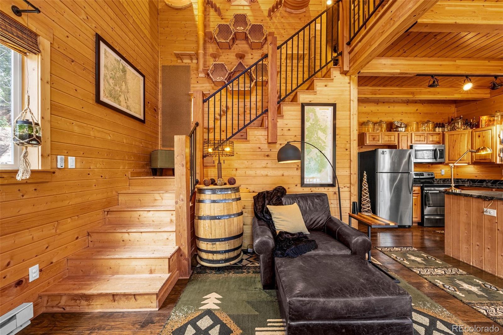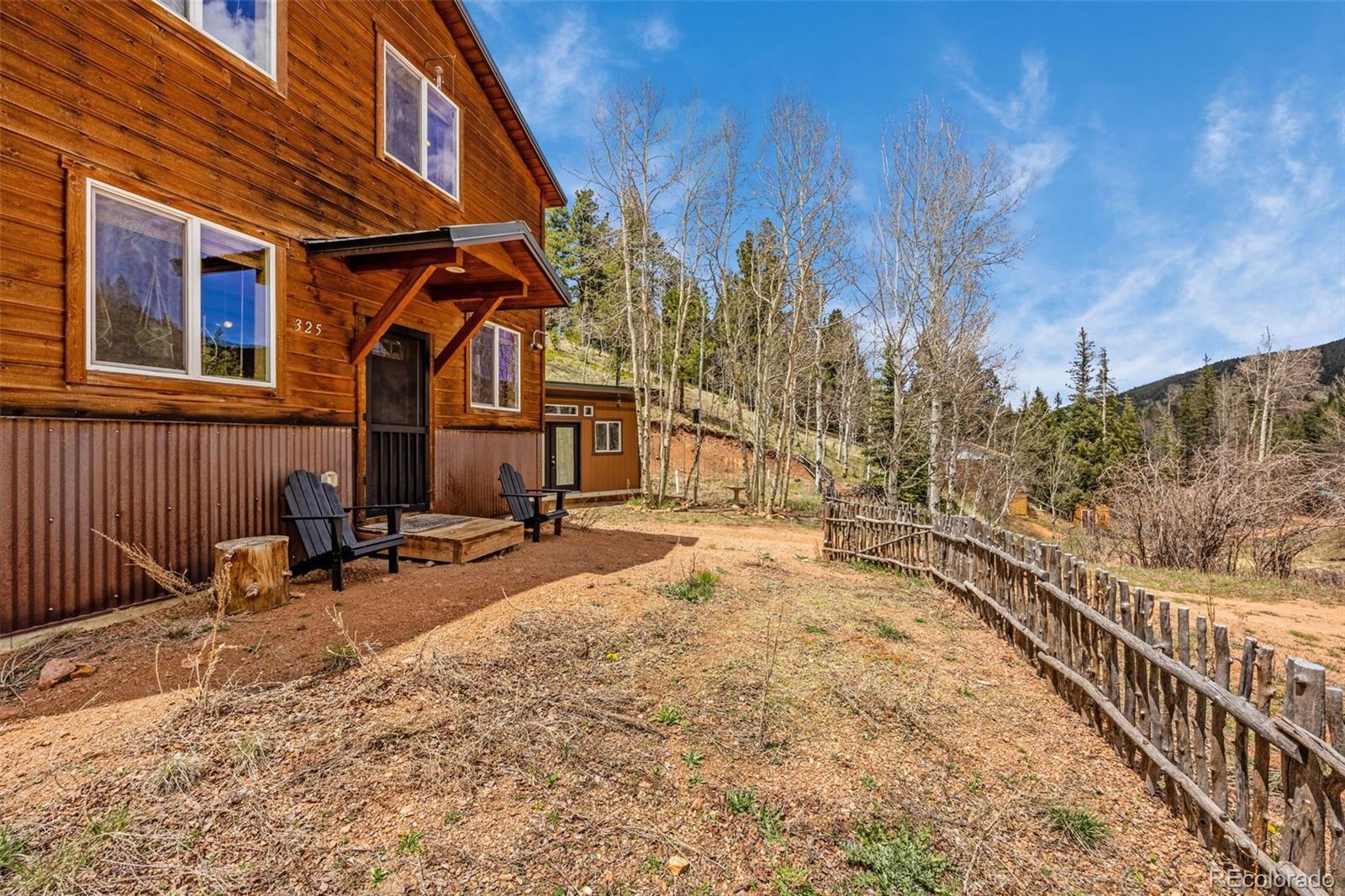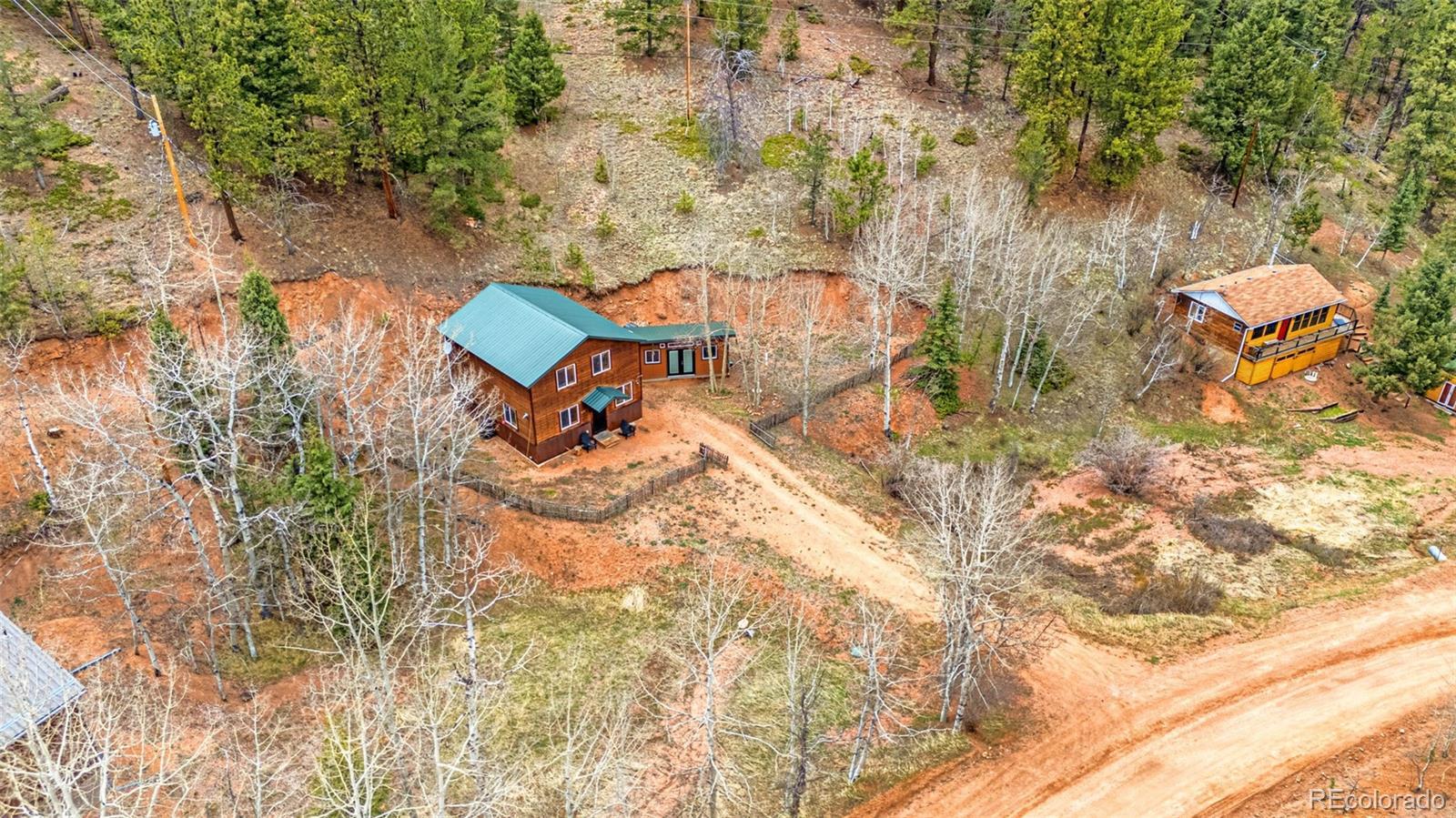 Welcome to this stunning Colorado Mountain cabin retreat nestled on a private, wooded hillside in the heart of Rainbow Valley. Very well meticulously maintained, this home blends rustic charm with modern finishes. Cedar siding, vaulted ceilings, and natural wood paneling set the tone, while a cozy wood-burning stove and sleek black steel railings bring a contemporary touch. The open-concept layout includes a well-appointed kitchen with stone countertops and woodpaneled accents, perfect for everyday living or entertaining. One bedroom is located on the main level, while the upstairs primary suite features a corrugated steel accent wall, full ensuite bath, walk-in closet, and direct access to a spacious loft that can flex as a guest space, office, or media area. An oversized work shed provides excellent storage or workshop potential. Tucked among towering pines with few neighbors in view, this home offers seclusion without sacrificing convenience. Enjoy easy access to Highway 24, Cripple Creek, Mueller State Park, the Crags, and miles of nearby hiking trails and fishing ponds. This is mountain living with modern appeal — a rare gem in a peaceful, soughtafter location.