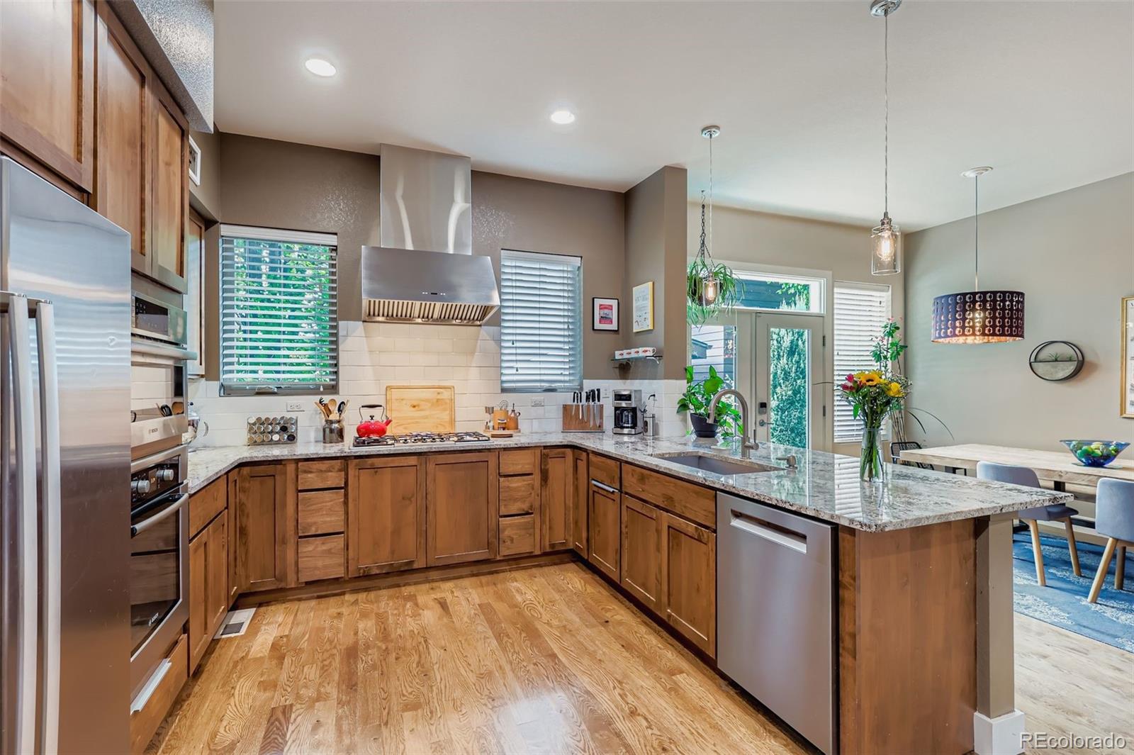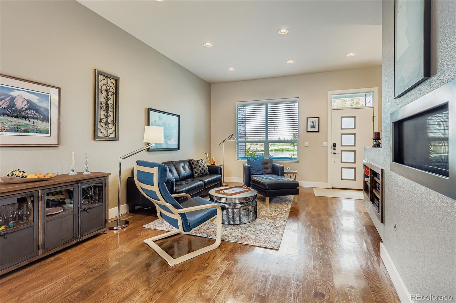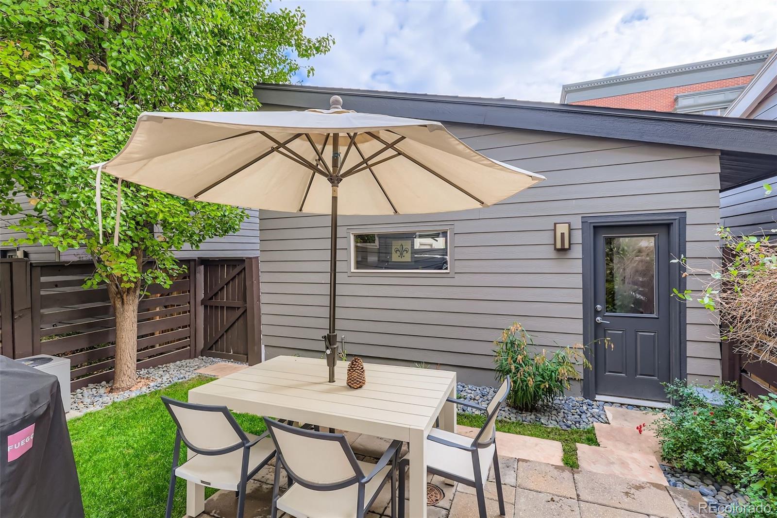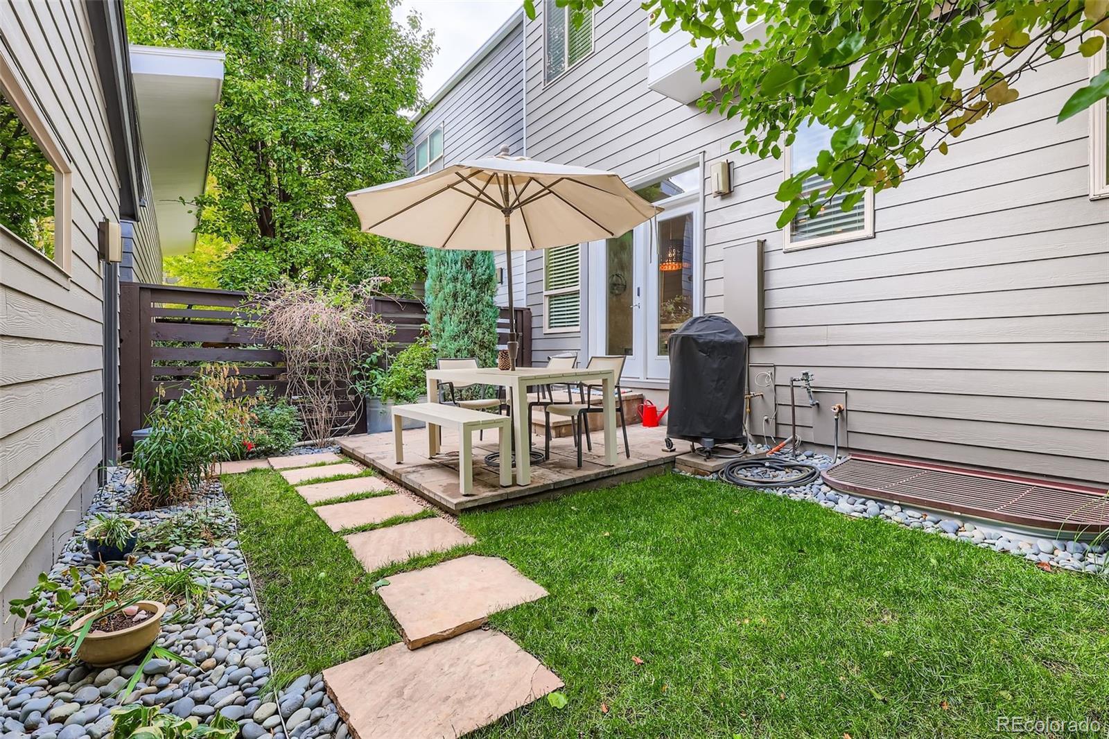 Welcome to 8734 Martin Luther King Blvd, this stylish contemporary townhome is ideally located directly across from Central Park. The large pave-stone patio welcomes you to this stunning 3 bed, 4 bath home replete with thoughtful updates, tasteful finishes, and a layout that lives effortlessly across three levels. The main floor features hardwood floors throughout this open floor plan which includes a spacious living room with 10' ceilings, cozy fireplace and, custom shelving. The adjoining dining area is bright and open with access to the outdoor patio and additional seating at the island bar. The kitchen boasts granite counters, professional 5-burner gas cook-top and hood, built-in convection oven with microwave and 42" walnut cabinetry. The private fenced patio is ideal for a serene morning coffee, or hosting gatherings with family. Upstairs, the primary suite features two walk-in closets and en-suite 5-piece bath with oversized tub, tile floor/shower surround. Relax on the private balcony with views of the park and a glimpse of the mountains! The second bedroom, a second full bath, plus a loft office area which would also serve quite nicely as a reading nook, plus the laundry closet with a full sized washer and dryer and storage affords ultimate convenience and completes the upper level.The fully finished basement features a family room and a very comfortable guest quarters with a bedroom, a walk-in closet, and an egress window, plus a 3/4 bath. A two car detached garage offers additional storage and there is ample guest parking in front on a private street. The new owners will enjoy the close proximity of Stanley Marketplace, Eastbridge Town Center as well as the Town Center on 29th. Central Park residents also have access to community amenities which include a sprawling 43-acre park, an extensive network of trails and bike paths, a clubhouse, fitness center, parks, pools, and tennis courts. Don't miss this incredible opportunity!