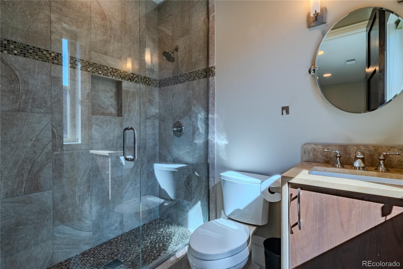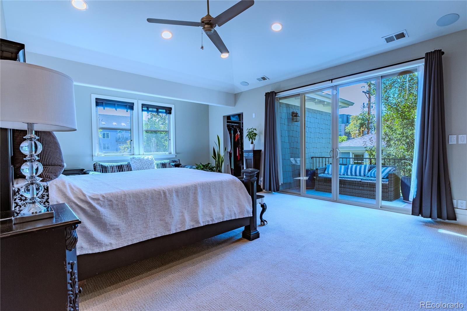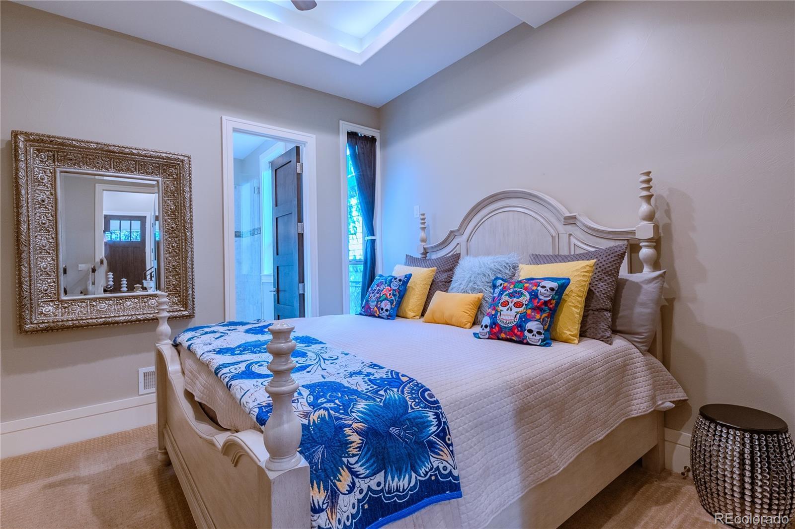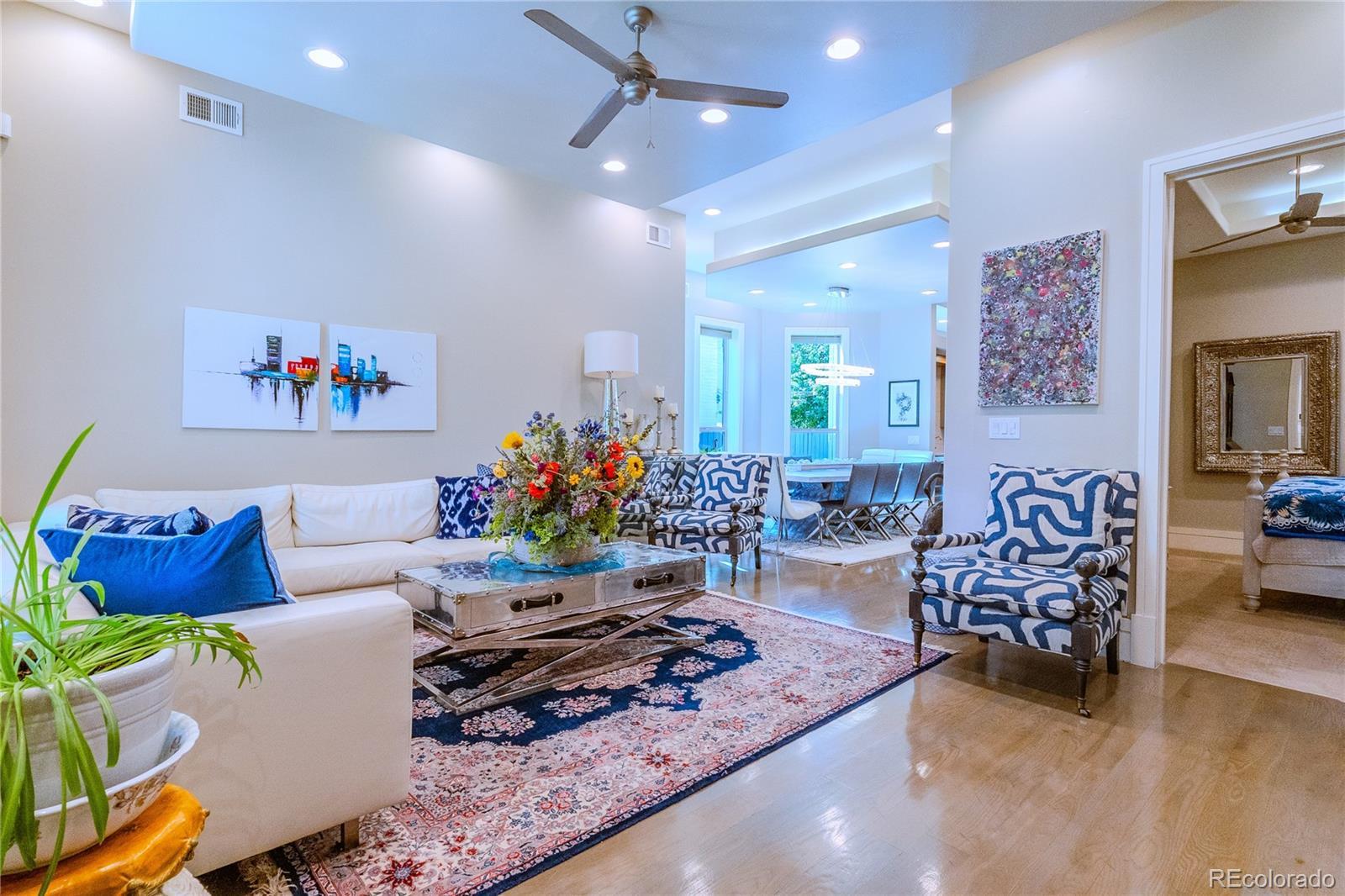 A commercial-grade masterpiece exquisitely redesigned and built in 2016. Located on a serene, tree-lined street with an exceptional walk score, this home is steps from Denver’s best dining, shopping, and entertainment. Thoughtfully expanded to 4,756 sq ft, this 6-bedroom, 7-bathroom residence is modern luxury, featuring soaring 11’ ceilings on the main floor, 9’ upstairs, and 8’ in the finished lower level. Sunlit 7’ windows illuminate 5” white oak floors with radiant heating, complemented by custom 2” solid wood doors and 9” baseboard moldings for a stately, timeless appeal. Chef’s Kitchen: A culinary haven with a 6-burner gas range, griddle, double ovens, range hood, 2 dishwashers, and butler’s pantry with a wet bar, wine fridge, and ample storage. A multi-slide patio door opens to a low-maintenance turf courtyard, perfect for entertaining. Main Floor: Welcoming guest suite with an ensuite ¾ bath and a powder room for visitors. Upper Level: Three spacious bedrooms, each with ensuite baths. The primary suite boasts a private balcony, vaulted ceilings, and a spa-like bath with a steam shower, soaker tub, and two custom closets, including a dressing room with a vanity and chandelier. A second laundry closet adds convenience. Lower Level: Expansive rec room with an 11’6” custom-built wet bar, flexible space with an egress window, a ¾ bath, and a commercial-grade mechanical room. Smart Design: Dual-zone HVAC, updated windows, roof, sewer, and water lines; whole-home speaker system; smart thermostats; soft-close cabinetry; custom closets; and comfort-height vanities and counters. Laundry/Mudroom: Features a built-in desk, second fridge, and direct courtyard access for seamless living. Turnkey Income Opportunity A private Airbnb suite above the 3-car garage generates over $60,000 annually, offering passive income while preserving homeowner privacy.