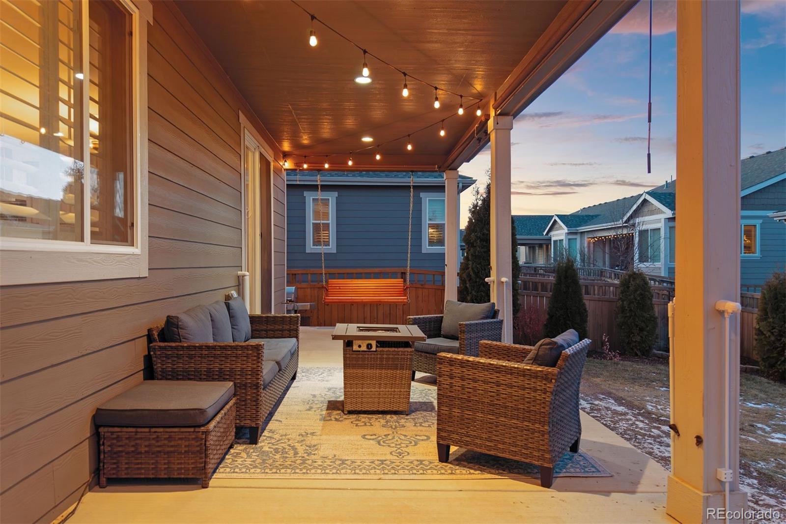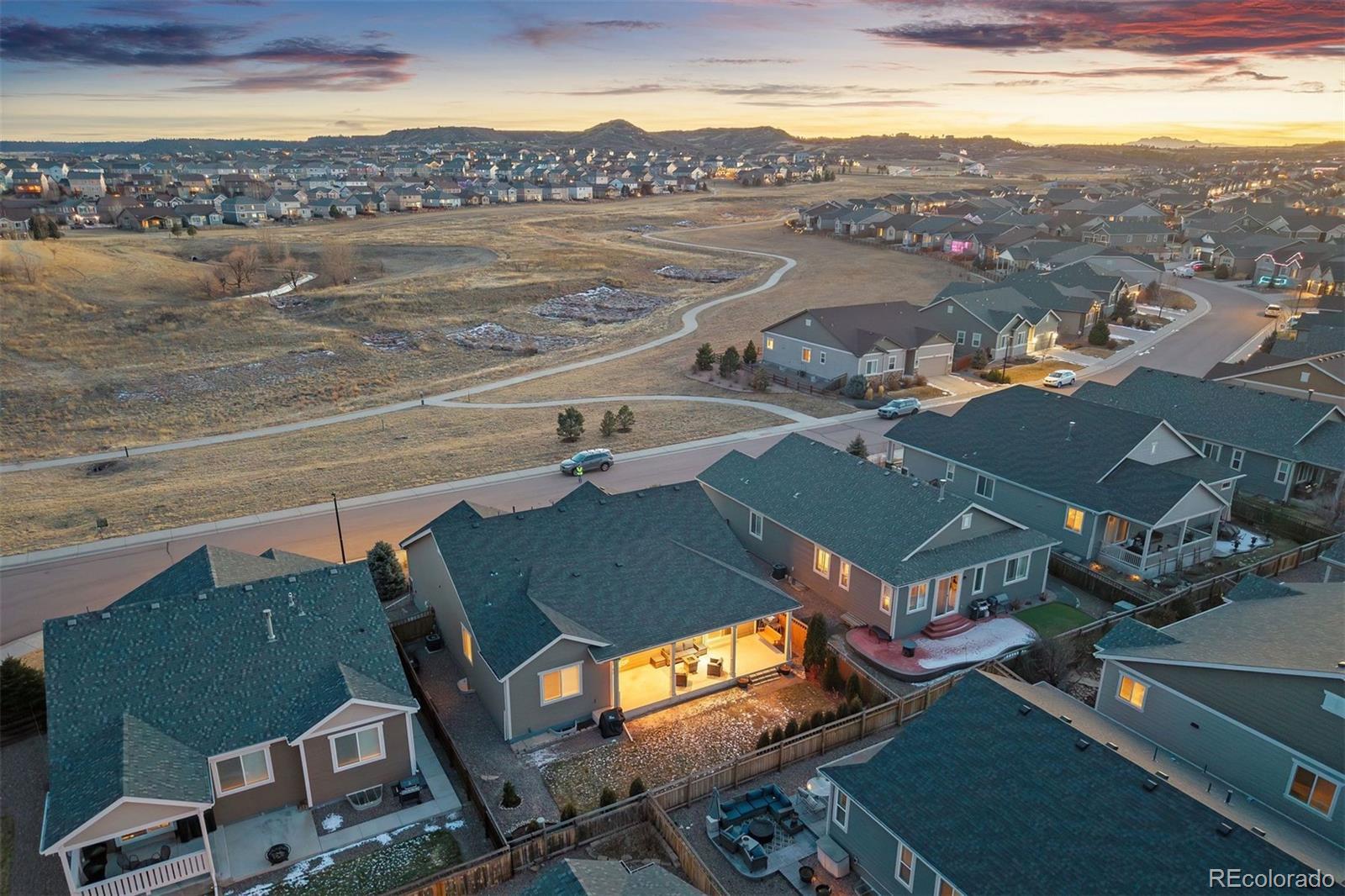 Perfectly positioned across from open space in the heart of Cobblestone Ranch, and within walking distance to Cobblestone playground and community amenities, this ranch floorplan home offers an ideal blend of comfort and functionality. With 3 bedrooms, 3 full bathrooms, and a finished basement, the layout is as versatile as it is inviting. The open main level welcomes you with a spacious entry and conveniently located office | den with glass-paneled French doors. The eat-in kitchen, featuring warm wood cabinets, stainless appliances, 5-burner gas range, and walk-in pantry, opens seamlessly to the dining room and large living area. Access to the covered patio, complete with privacy | sun shades, a cozy swing, and gas grill hookup, provides the indoor | outdoor Colorado feel that is perfect for both everyday living and entertaining. The primary suite serves as a relaxing retreat, featuring a spacious walk-in closet and a well-appointed en suite bath with a soaking tub and glass-enclosed shower. Plantation shutters and engineered wood flooring also complement the upper level, complete with a 2nd bedroom, 2nd full bathroom, and laundry room. Downstairs, the expansive finished basement is designed for hosting and relaxation, highlighted by a custom wet bar with stone accent wall, beverage fridge, and counter seating. The family room, including ceiling-mounted projector and gas fireplace, provides ample space for media or gaming, and with a large additional guest bedroom, 3rd full bathroom, and large storage | unfinished space (currently used as workout space), consider all of the boxes checked! Cobblestone Ranch residents enjoy a community pool, a new park and playground, new pickleball courts, and extensive trails that connect directly to the Cherry Creek Trail system. Located within the Douglas County School District and offering easy access to both Castle Rock and Parker, this home is truly move-in ready and perfectly situated for an active Colorado lifestyle.