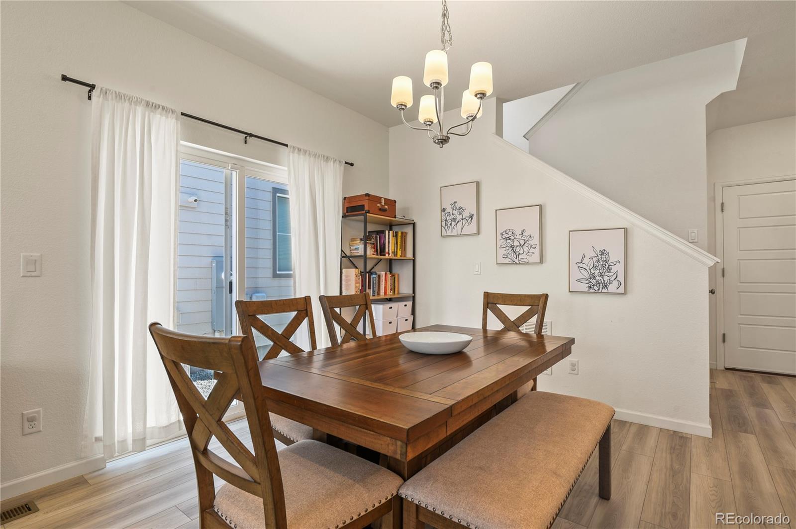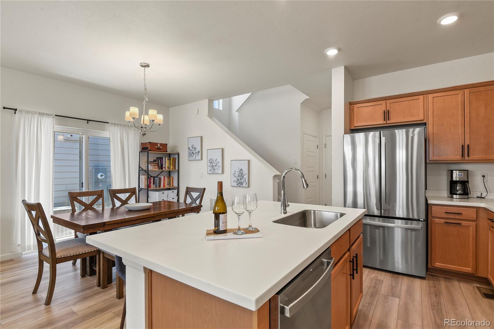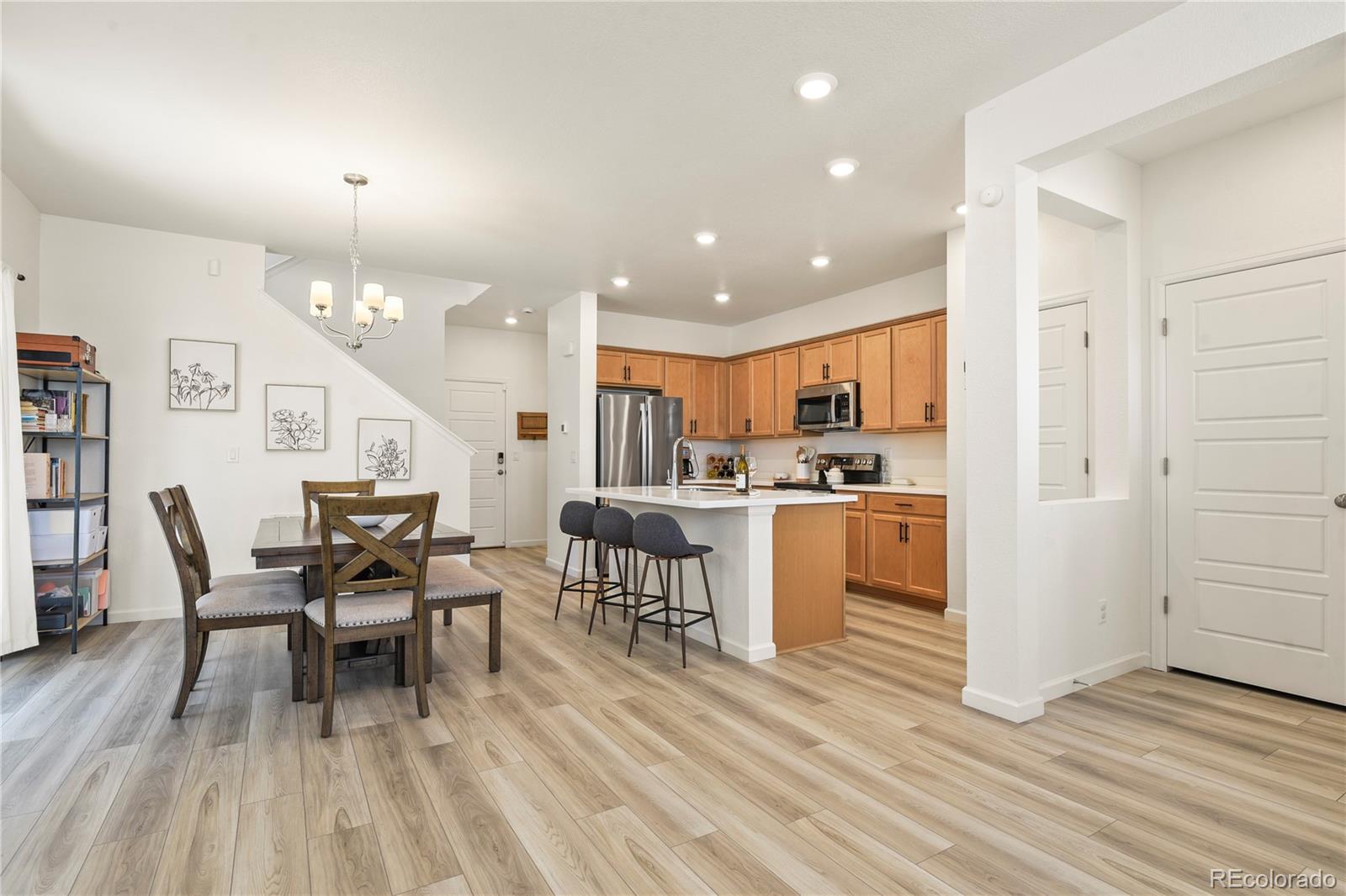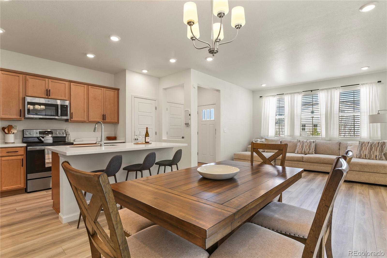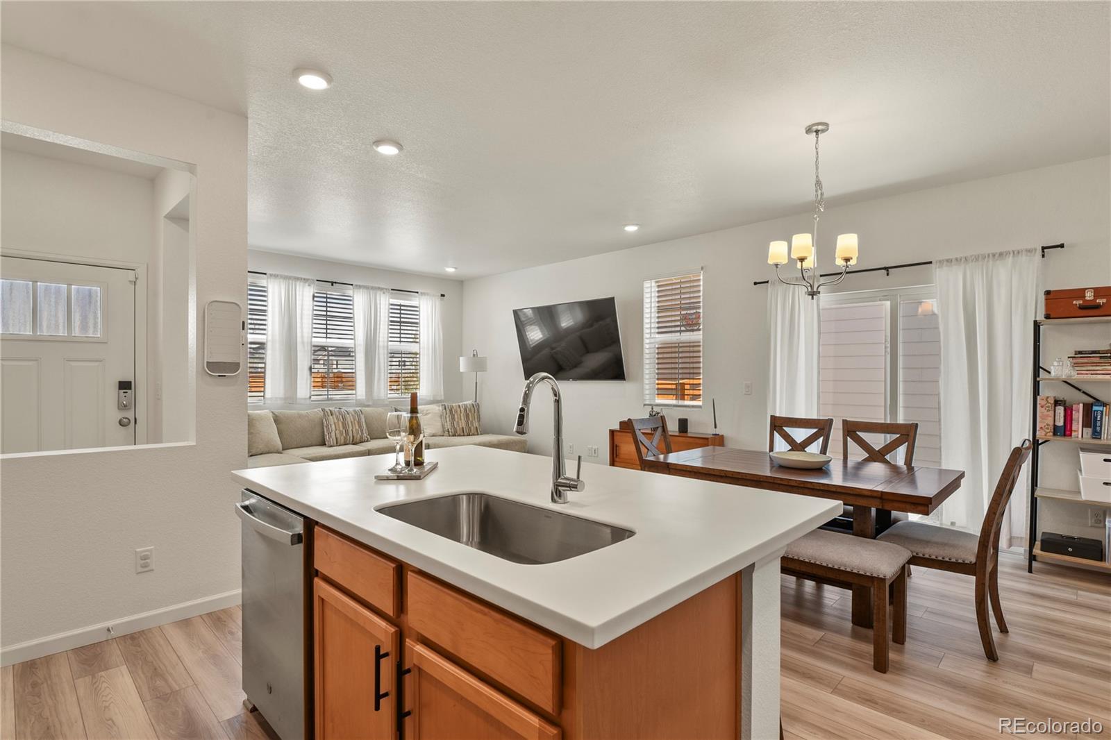 **PRICED $79,000 BELOW THE BUILDER** Welcome to this stunning, low-maintenance home with an open floor plan and move-in ready amenities. Set in a perfect location with plenty of parks and open space nearby. Featuring approximately $30,000 in upgrades, this 3 bedroom/3 bath home includes refrigerator and Sony TV already mounted in the living room. Living room sectional is negotiable. Natural light floods the living room highlighting the upgraded plank floors on the main level. The floorplan seamlessly connects the living room to the dining room and kitchen. Makes an inviting space for casual dinners or hosting a group. Large pantry, stainless appliances and center island add to the appeal and value of the kitchen. Designer touches have been added like window treatments and upgraded trim at kitchen cabinets. Electrical upgrades include a ceiling fan in family room with additional lighting. Upstairs, the primary suite features a luxury bath with dual sinks, large shower and a walk-in closet. Both secondary bedrooms have walk-in closets as well. Laundry room is conveniently located near all bedrooms on the upper level. Fenced side yard and xeriscape design with irrigation system. Adjacent to community pocket park. Easy access to community trails. The Aurora Highlands is a fantastic neighborhood and is just minutes away from The Aurora Highlands Town Center, restaurants and shopping. Conveniently located near the new community school. This home is a must-see! Copy the link and click on the house to view the showcase video - https://t.ly/MIEgY