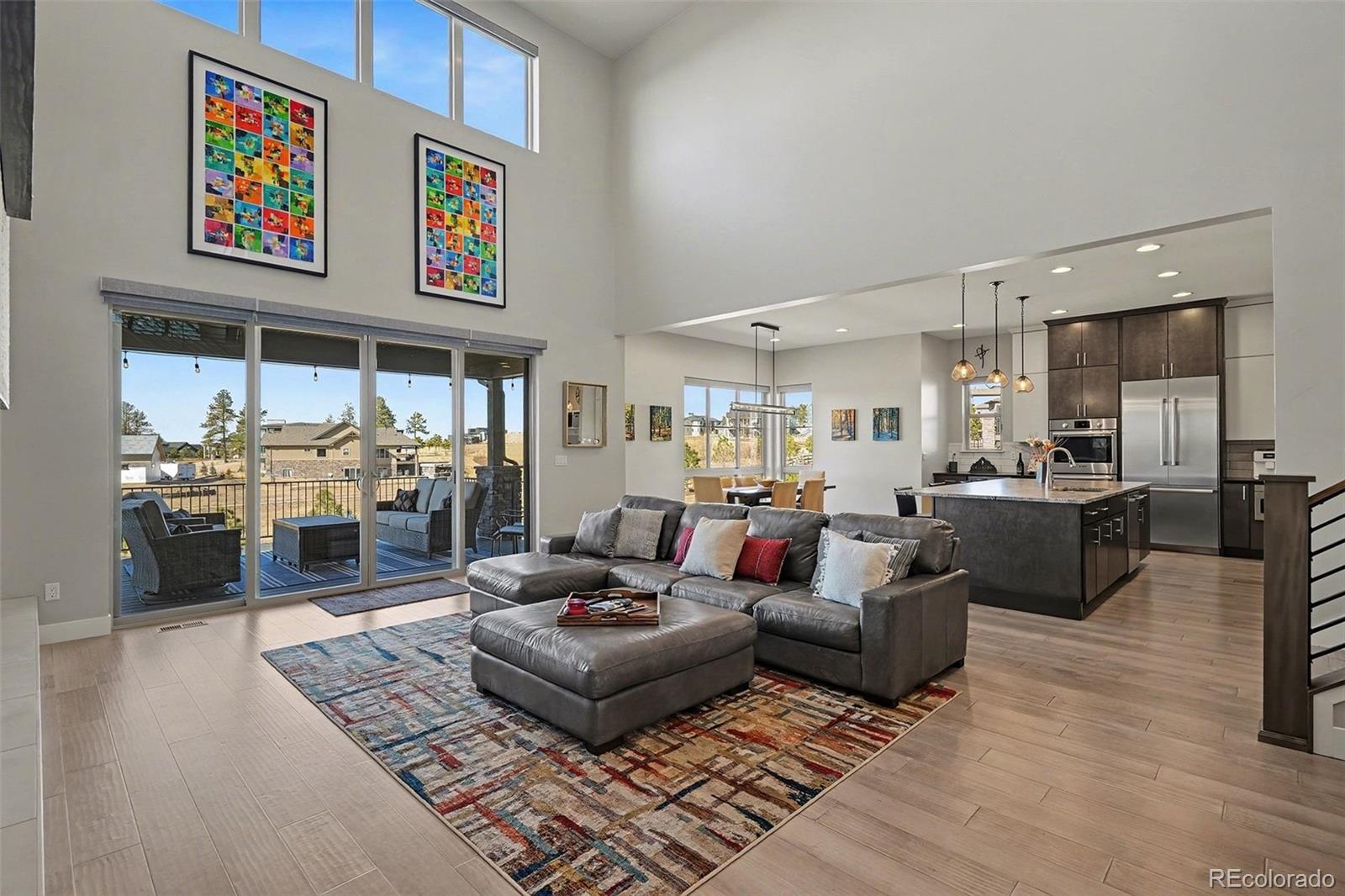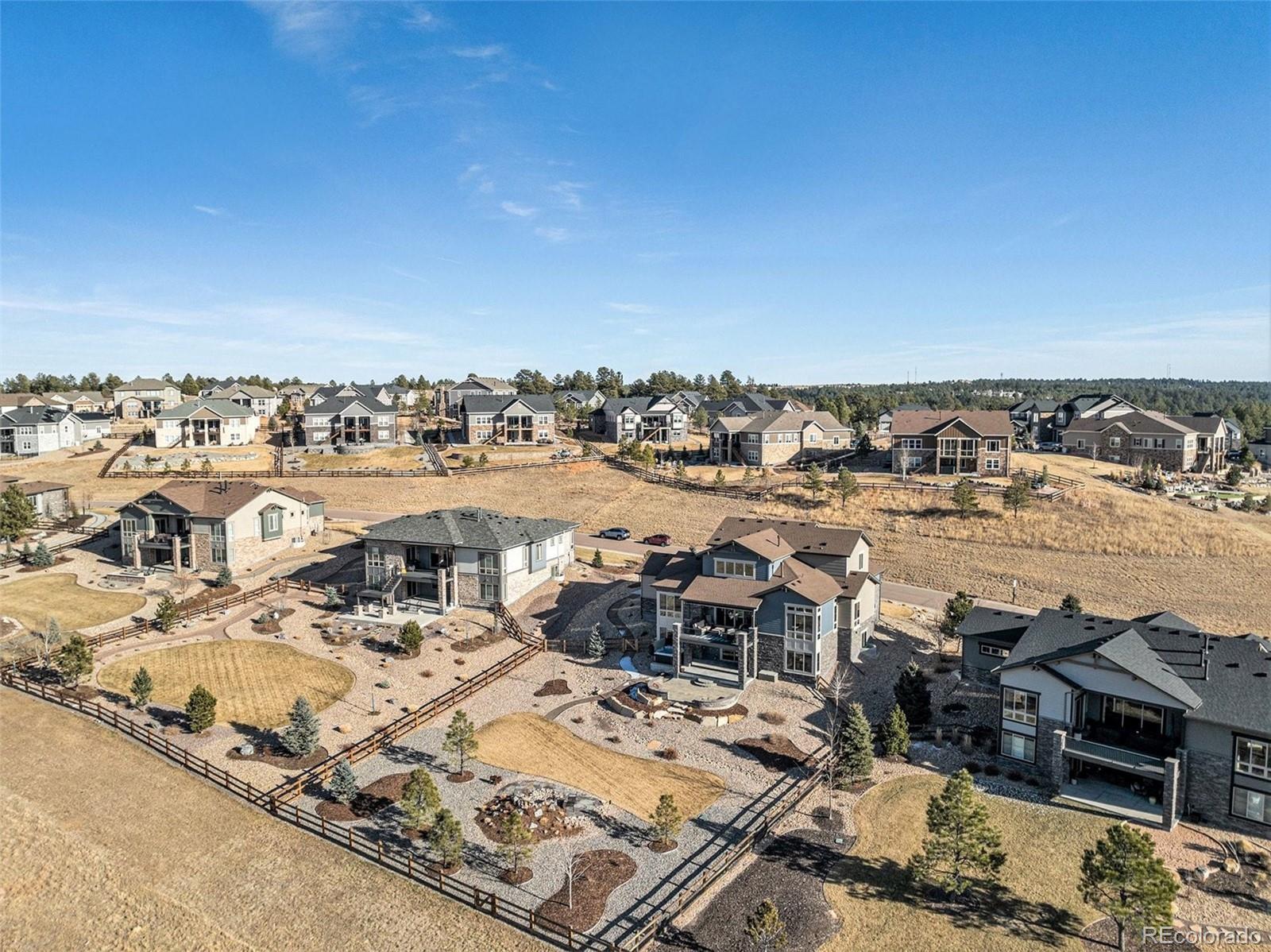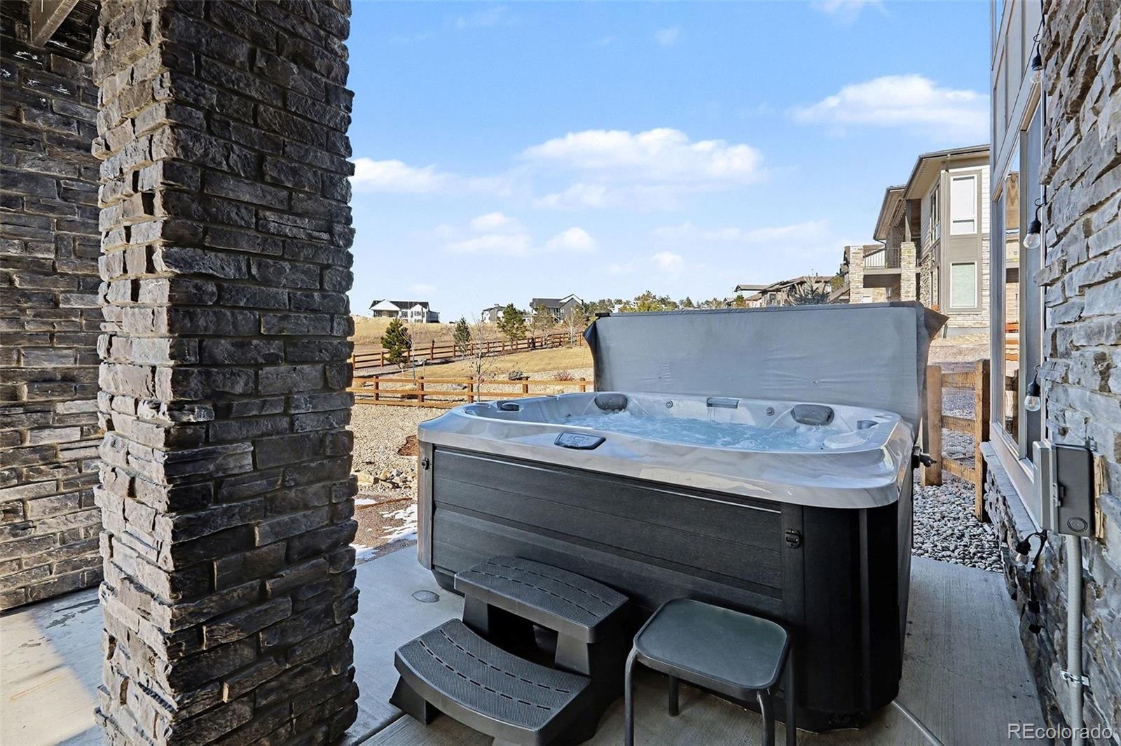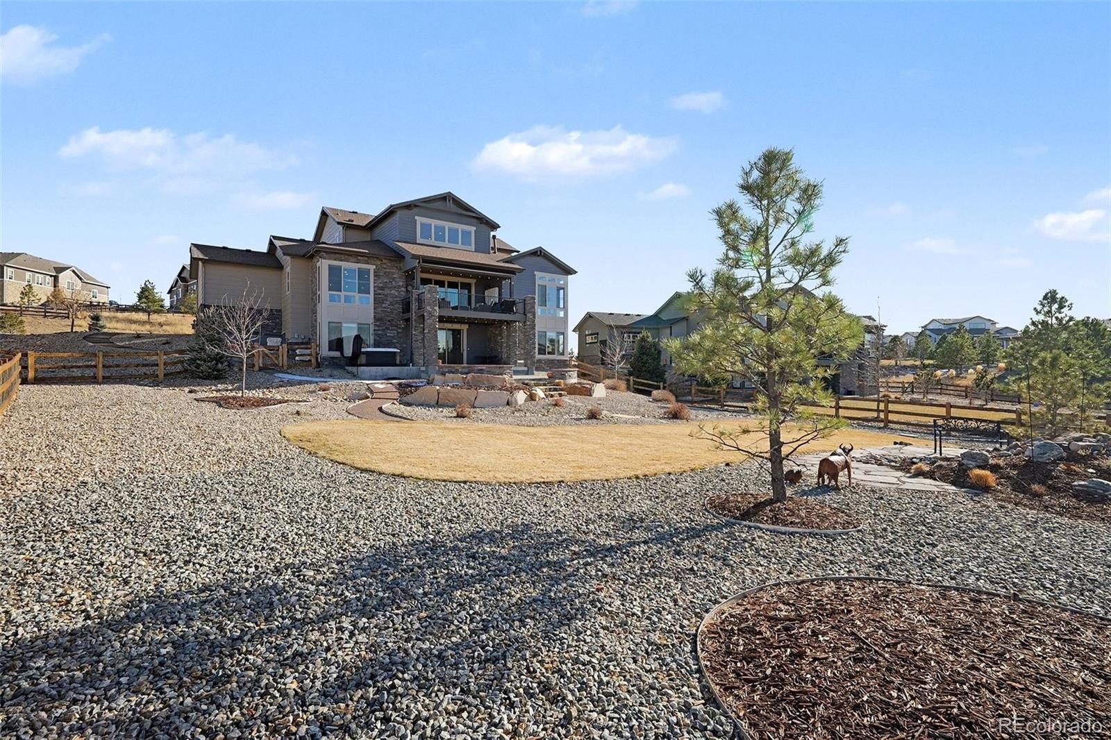 An exceptional opportunity to own in the highly sought-after Timbers at The Pinery, perfectly situated on a premier lot backing to open space. This stunning 5-bedroom, 5-bath residence seamlessly blends sophisticated design with a true Colorado resort-style atmosphere and features a coveted main-floor primary suite. High-end, tasteful finishes shine throughout the open floor plan, complemented by soaring ceilings and expansive picture windows that capture breathtaking views. The gourmet kitchen is a showstopper, boasting slab leathered granite, double ovens, a gas range, and premium Bosch appliances. The inviting great room centers around a beautiful fireplace and flows effortlessly onto a private deck with mountain views, complete with a retractable awning -perfect for indoor-outdoor living. Upstairs, you’ll find two spacious bedrooms with ensuite baths, along with a custom workout area.The expansive walk-out lower level is designed for entertaining, featuring a large custom bar, theater area, game space, and two additional bedrooms. Step outside to the serene half-acre lot with over $100,000 in professional landscaping, including a fire pit and hot tub, ideal for enjoying the peaceful setting and mountain views. Truly better than new, this home offers luxury living on one of the community’s finest lots.