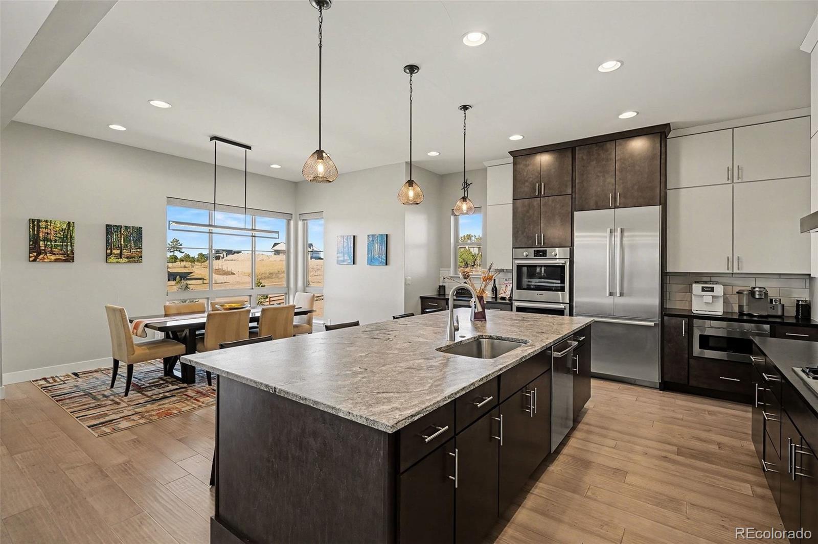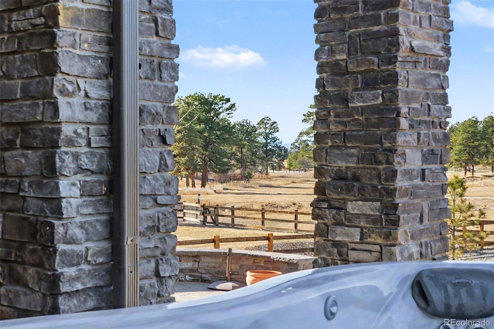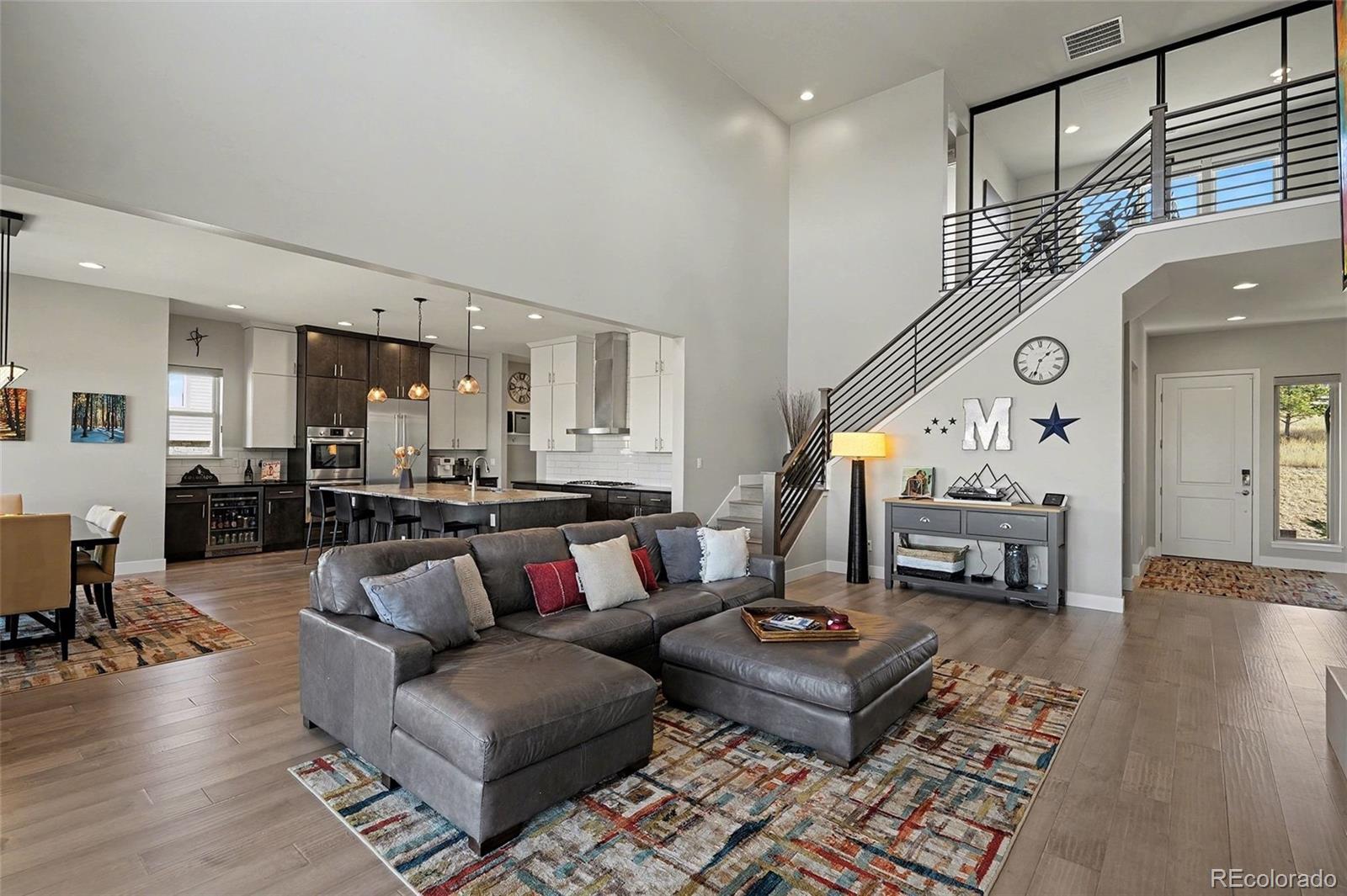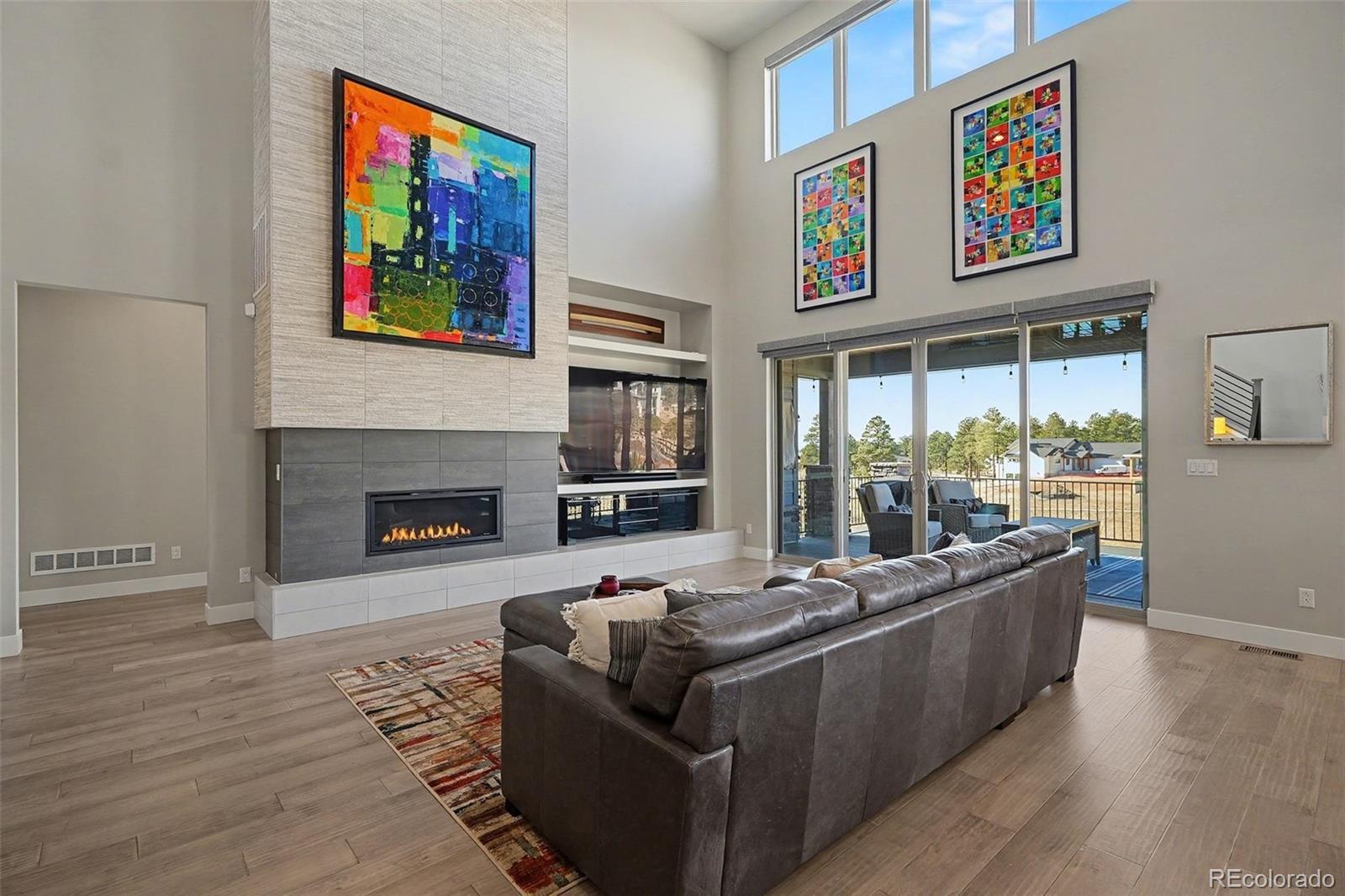An exceptional opportunity to own in the highly sought-after Timbers at The Pinery, perfectly situated on a premier lot backing to open space. This stunning 5-bedroom, 5-bath residence seamlessly blends sophisticated design with a true Colorado resort-style atmosphere and features a coveted main-floor primary suite. High-end, tasteful finishes shine throughout the open floor plan, complemented by soaring ceilings and expansive picture windows that capture breathtaking views. The gourmet kitchen is a showstopper, boasting slab leathered granite, double ovens, a gas range, and premium Bosch appliances. The inviting great room centers around a beautiful fireplace and flows effortlessly onto a private deck with mountain views, complete with a retractable awning -perfect for indoor-outdoor living. Upstairs, you’ll find two spacious bedrooms with ensuite baths, along with a custom workout area.The expansive walk-out lower level is designed for entertaining, featuring a large custom bar, theater area, game space, and two additional bedrooms. Step outside to the serene half-acre lot with over $100,000 in professional landscaping, including a fire pit and hot tub, ideal for enjoying the peaceful setting and mountain views. Truly better than new, this home offers luxury living on one of the community’s finest lots.