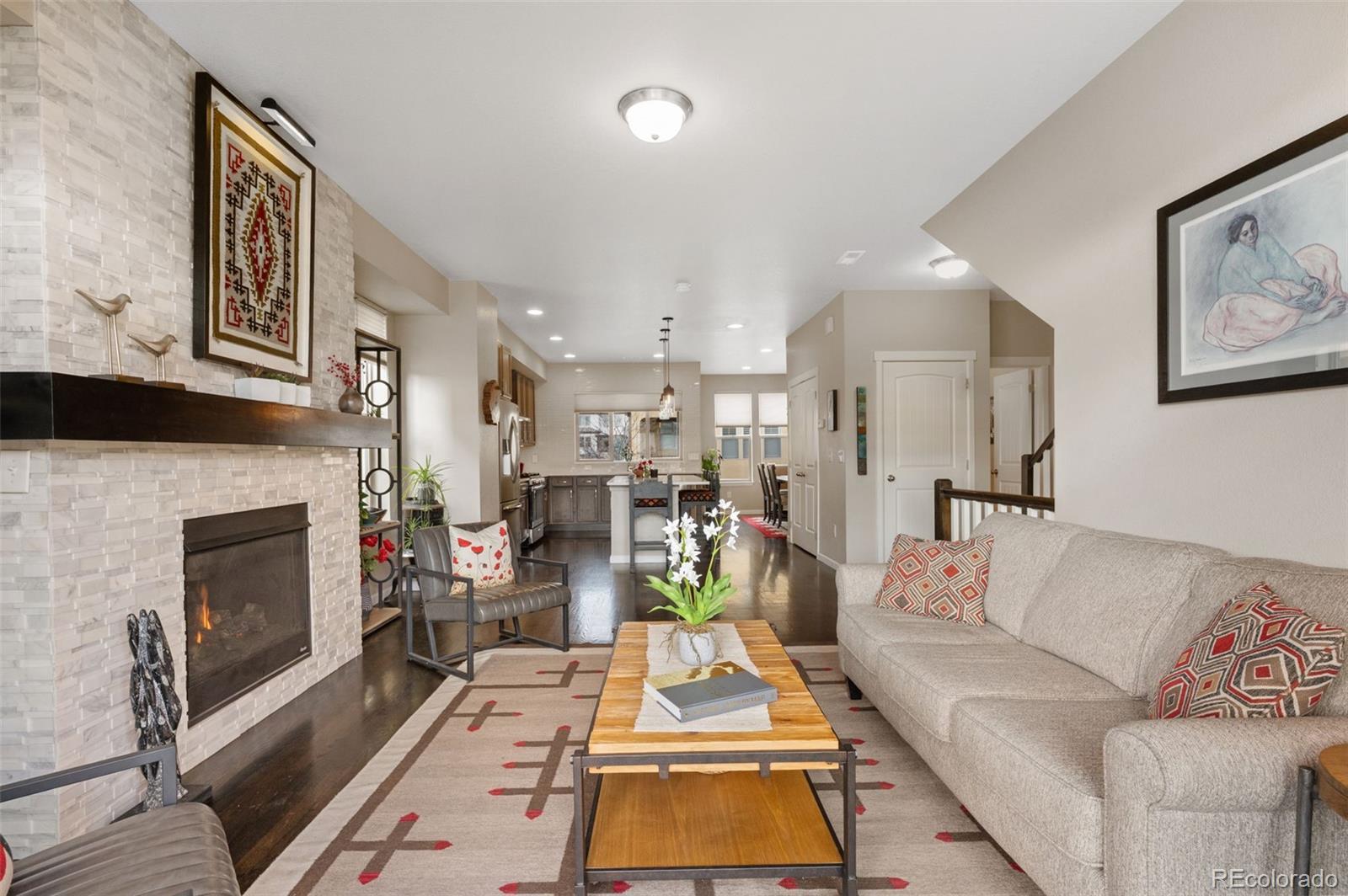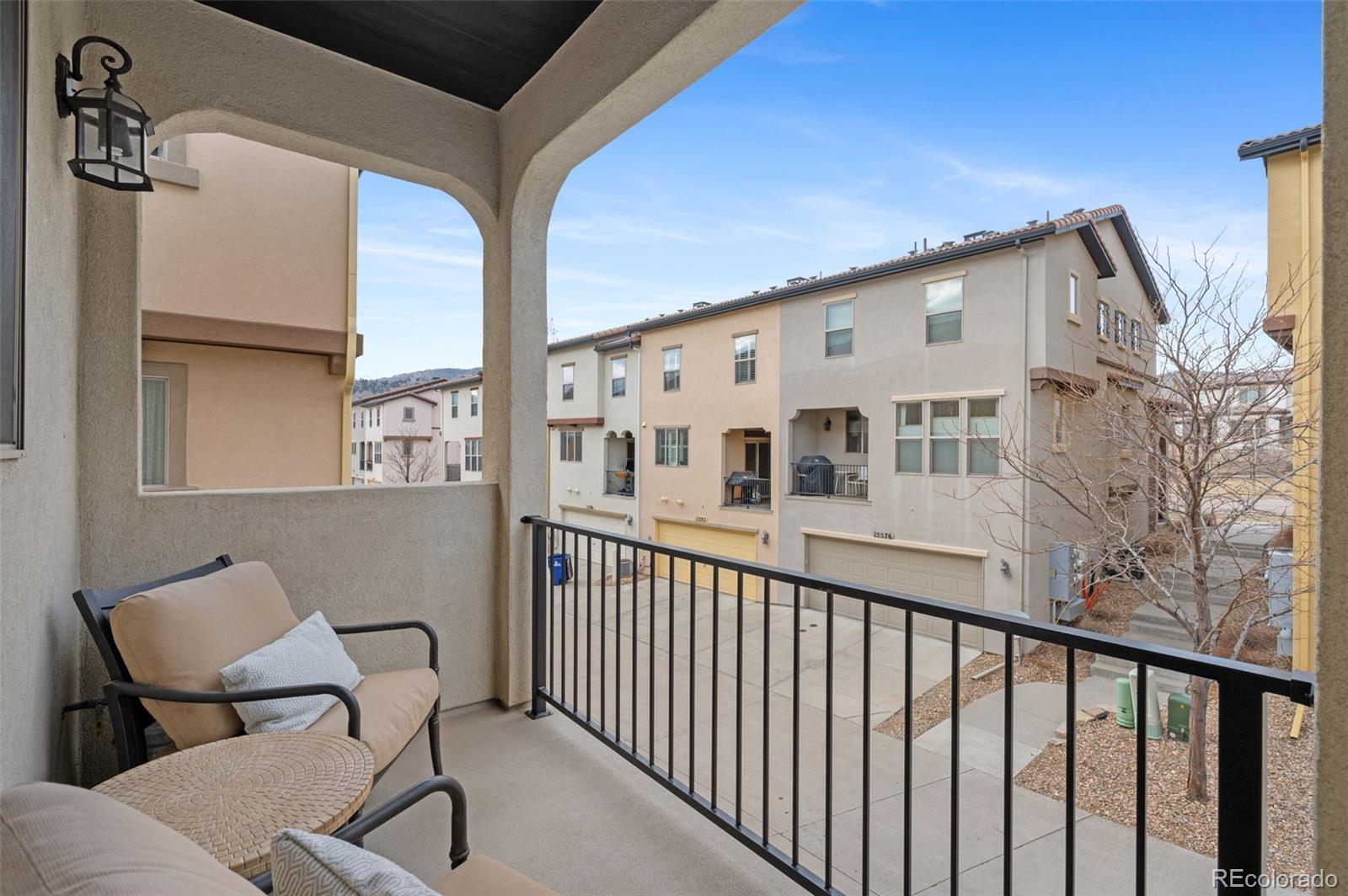 Located in the desirable Solterra neighborhood, this 3 bedroom, 3 bathroom townhome in Lakewood offers 2,076 square feet of thoughtfully designed living space with an open floor plan and easy access to both the mountains and downtown Denver. The main level features a conveniently located half bathroom, cozy living room with a fireplace, large windows with Hunter Douglas window coverings, abundant natural light, and a spacious kitchen with a central island that connects seamlessly to the dining and living areas, making it ideal for everyday living and entertaining. Upstairs, you’ll find three bedrooms, including a primary suite with a five piece ensuite bathroom and generous closet space. An additional upstairs bathroom enhances comfort and flexibility for both family members and guests. Multiple outdoor living areas include two private patios, providing flexible spaces to relax or entertain. Residents enjoy access to extensive walking trails, a beautiful community clubhouse with a swimming pool, and a quiet, well maintained neighborhood known for its friendly atmosphere. Located less than ten minutes from Red Rocks Amphitheater, this townhome offers an ideal balance of lifestyle, convenience, and location. Inclusions: All attached kitchen appliances, washer, dryer, refrigerator, Hunter Douglas window coverings.