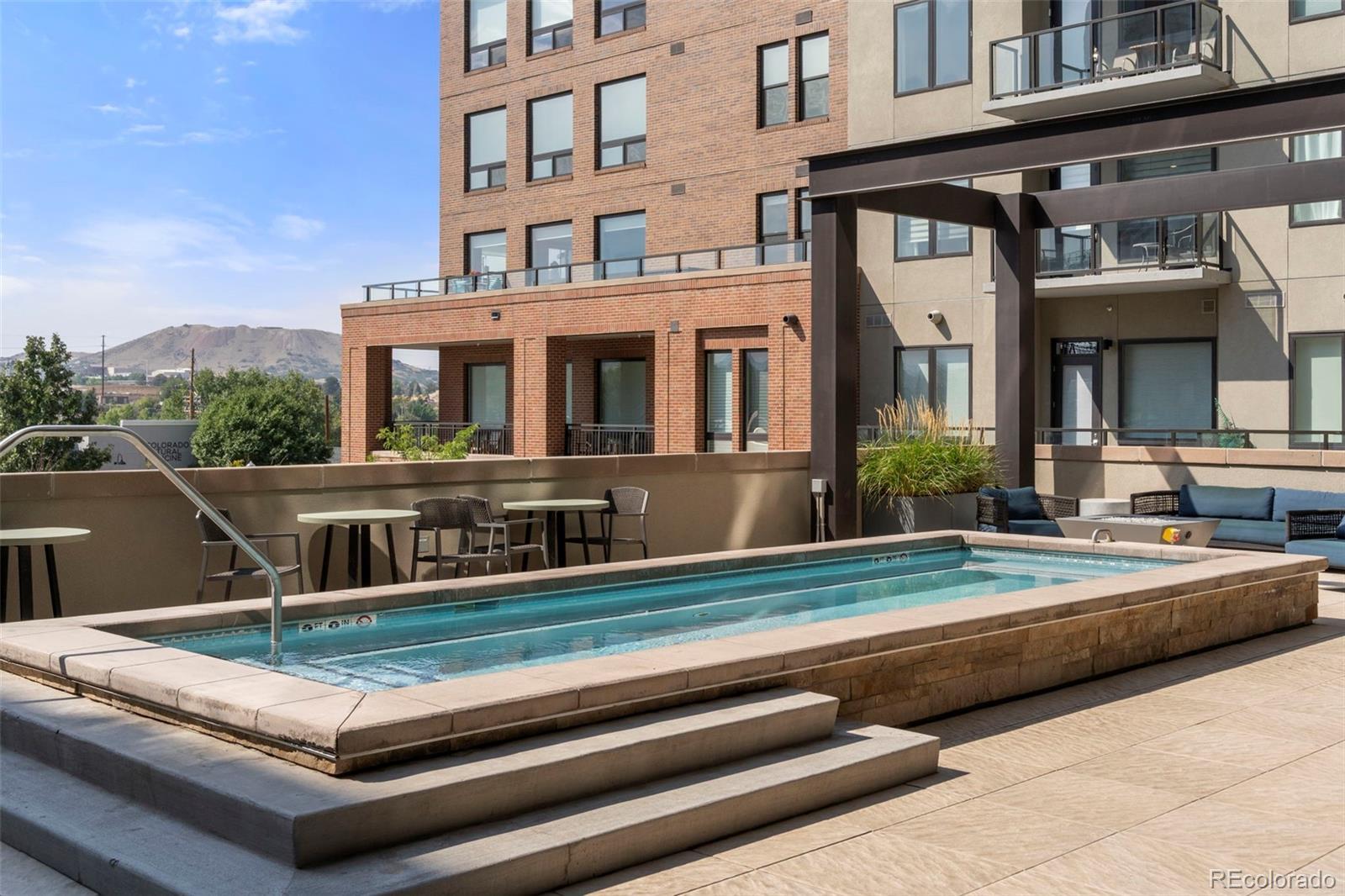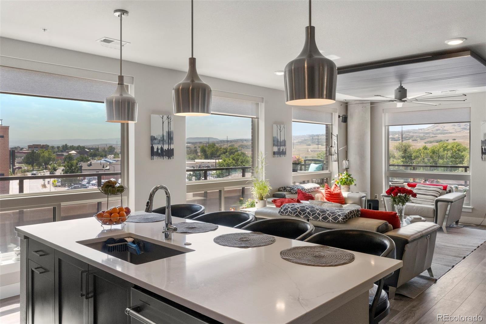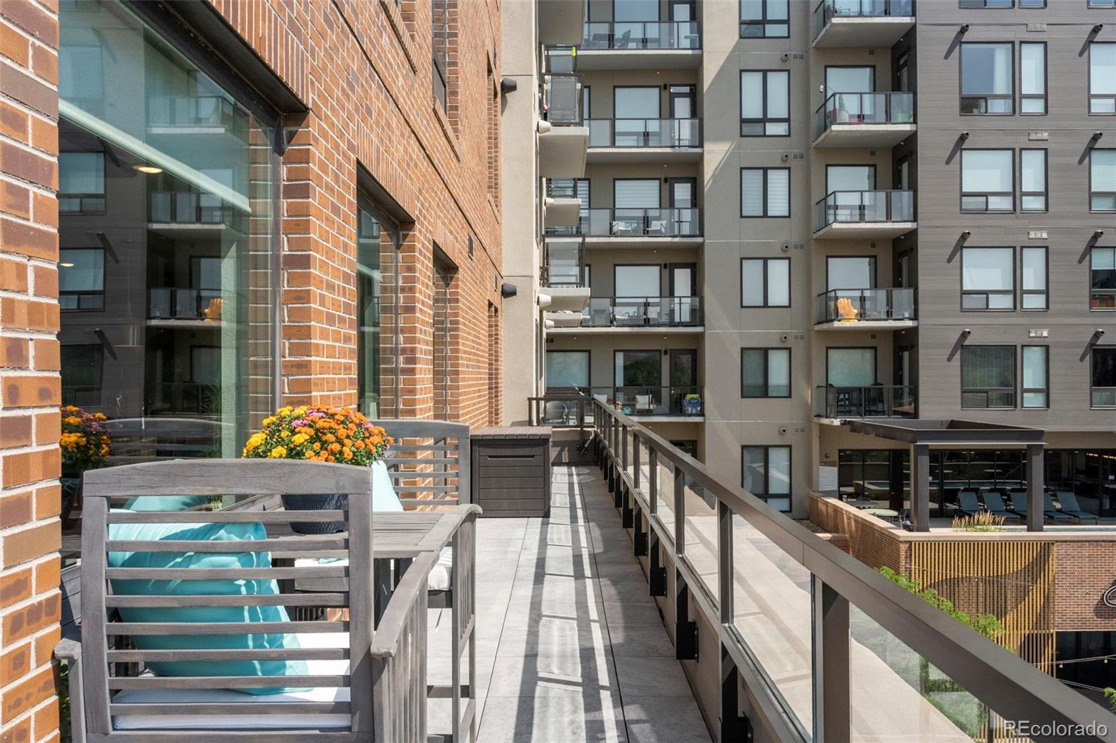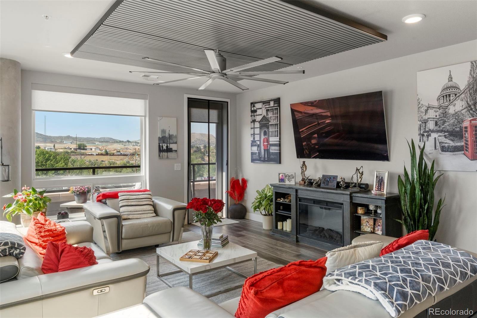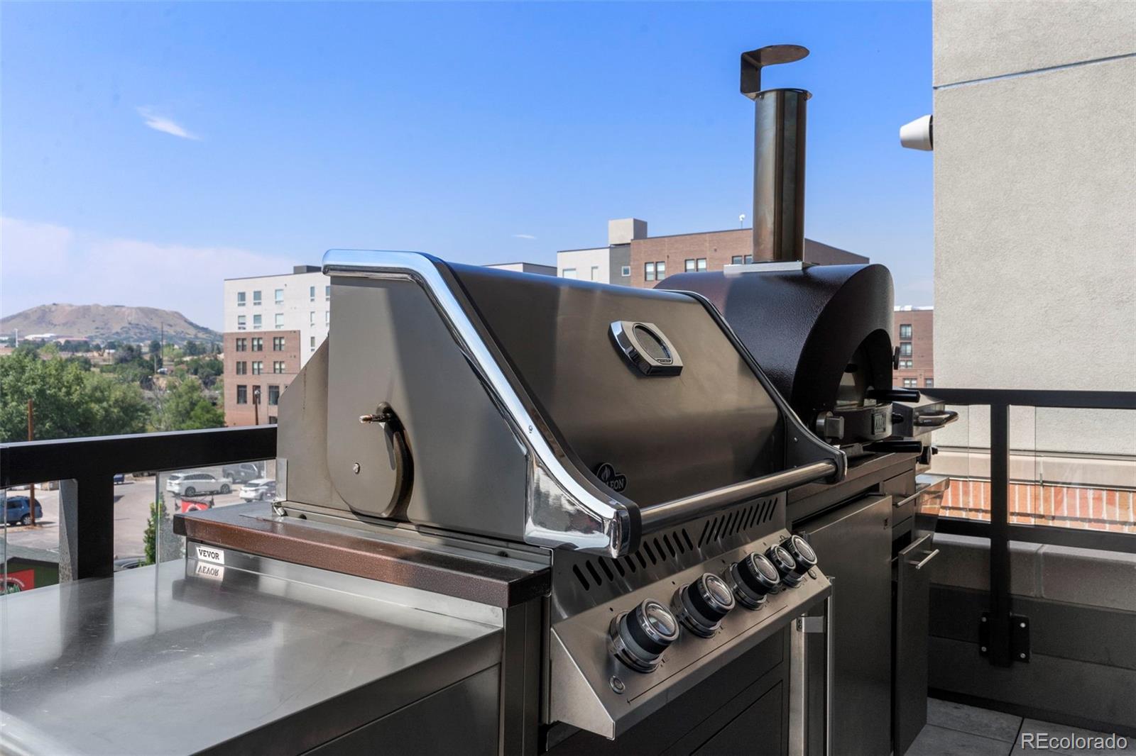 A truly one-of-a-kind luxury residence, end unit 323, located in the prestigious Encore Condominiums, right in the heart of downtown Castle Rock. This expansive 2-bed, 2-bath home offers 1,584 sq. ft of beautifully upgraded living space, w/ stunning southwest-facing views of Pikes Peak & the Front Range that are sure to impress. As one of the largest 2 bedrooms in the complex, the Hemingway floor plan is uniquely distinguished by its enormous wraparound terrace—one of only 3 like it in the entire building. Designed for both relaxation & entertainment, the outdoor space features a $15,000 custom outdoor kitchen complete with a Napoleon grill, pizza oven, French flat top griddle and refrigerator. Whether you're hosting guests, dining al fresco, or cultivating your own garden, the possibilities for enjoying this space are endless. The home showcases a high-end luxury finish package that features quartz countertops, KitchenAid SS appliances, a french door refrigerator, 5-element induction cooktop, 3 speed European style hood & a combination convection wall mounted oven and microwave. The primary bedroom is spacious, has a 5 -piece bath w/ a soaking tub + walk in custom closet made by California Closets. Technology & convenience converge w/ full smart home automation, a Nest thermostat, Google Home Hub Tablet, dimmer-controlled lighting, a smart front door lock, & motorized window shades. For added value, the home includes 2 deeded parking spaces R-44 + R-45—ideally located on the 3rd floor of the parking garage next to the exit for your convenience. Encore offers residents a wide range of resort-style amenities: outdoor hot tub, a club house, entertainment + party lounge w/ a golf simulator, a state-of-the-art fitness facility, & thoughtfully designed spaces for pet owners including a dog run + wash station. If you’re looking for sophisticated urban living with unmatched outdoor space and luxury finishes—all in the heart of charming Castle Rock —this truly has it all.