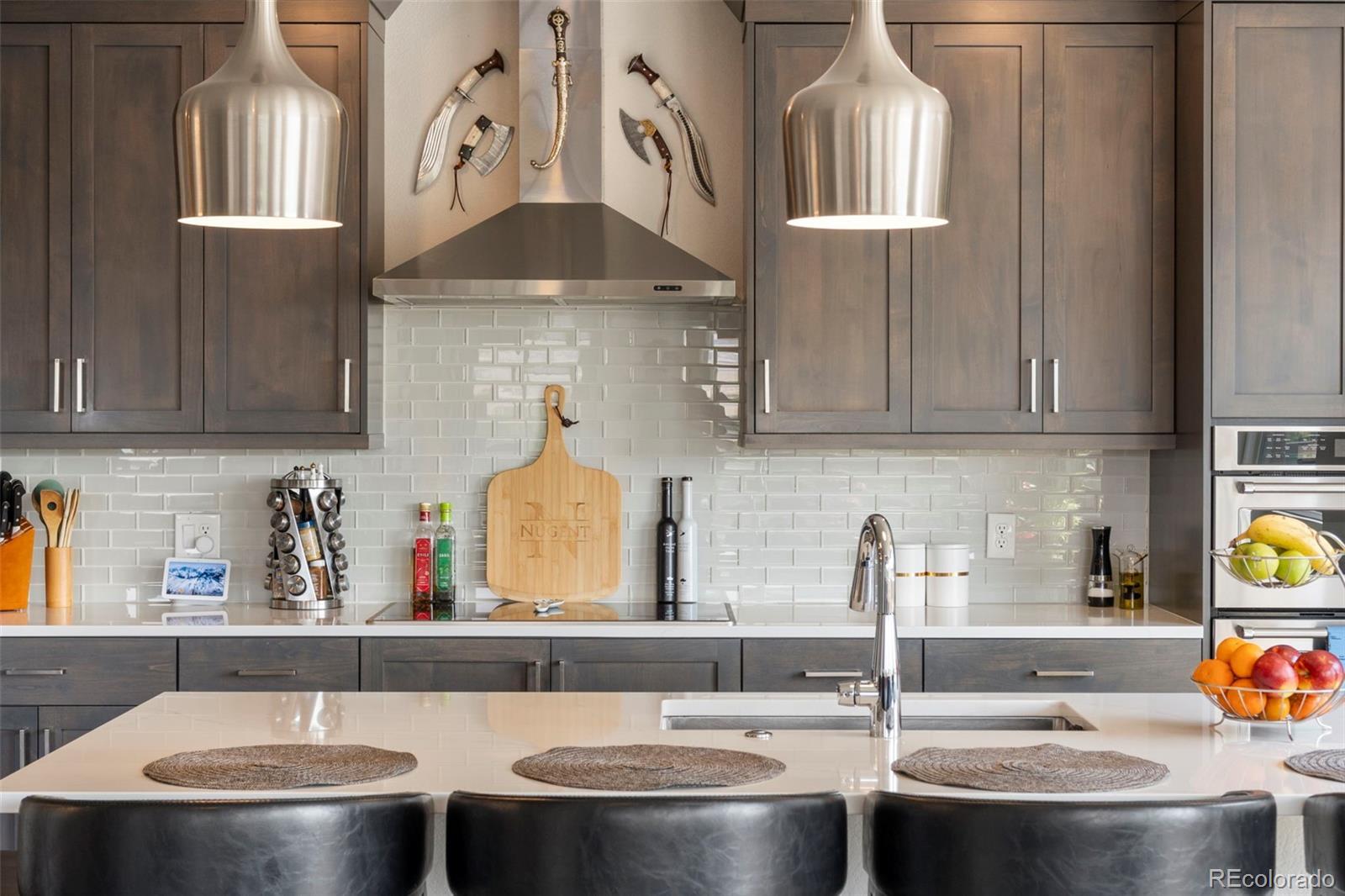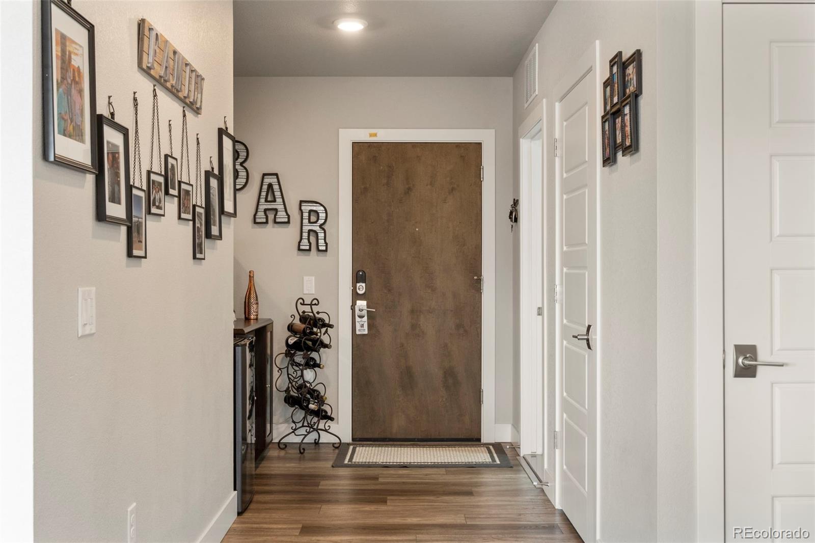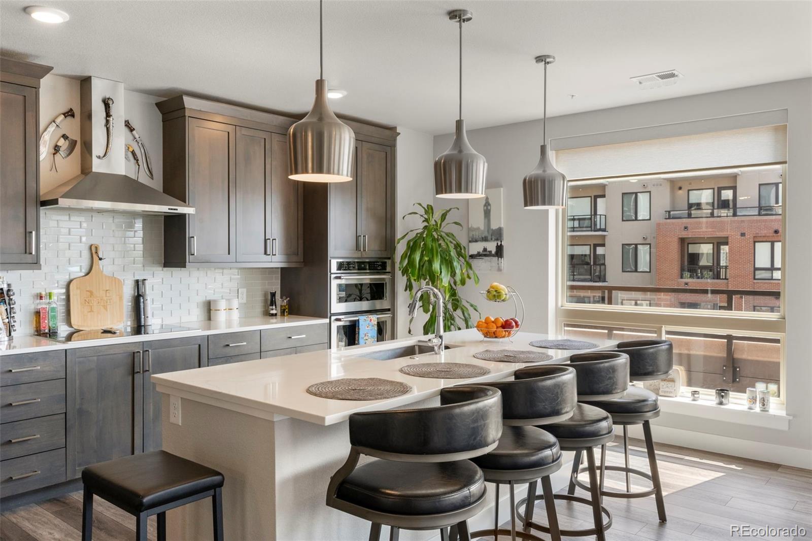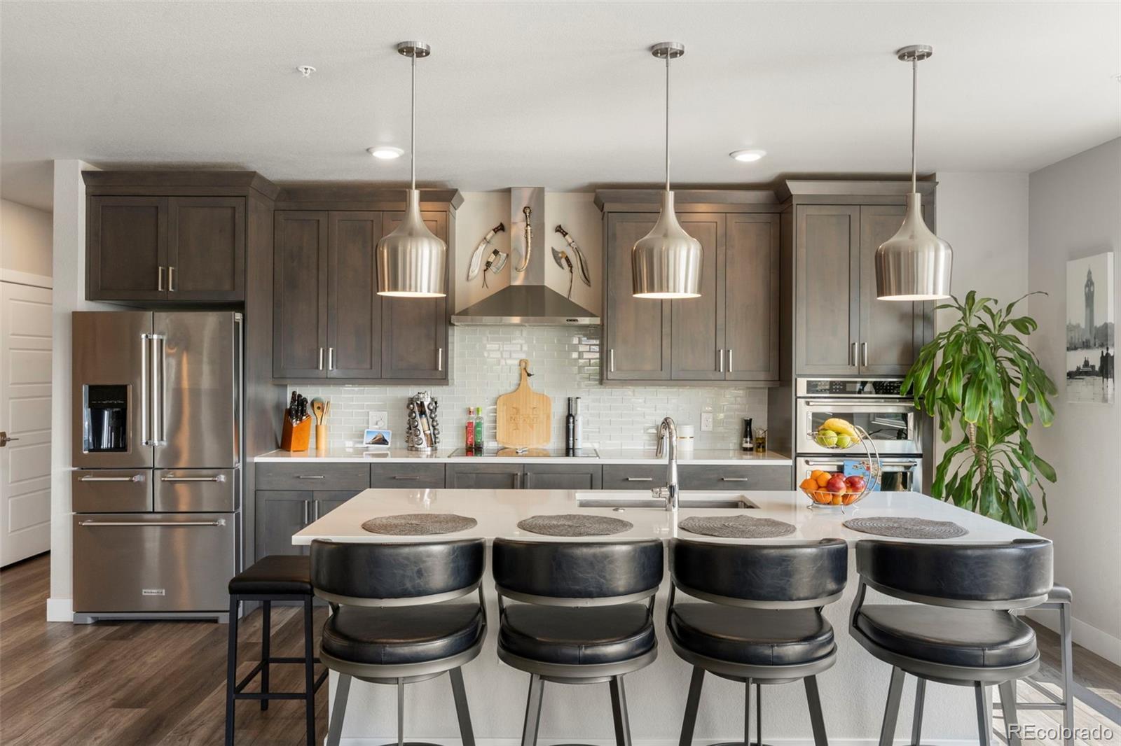 A truly one-of-a-kind luxury residence, end unit 323, located in the prestigious Encore Condominiums, right in the heart of downtown Castle Rock. This expansive 2-bed, 2-bath home offers 1,584 sq. ft of beautifully upgraded living space, w/ stunning southwest-facing views of Pikes Peak & the Front Range that are sure to impress. As one of the largest 2 bedrooms in the complex, the Hemingway floor plan is uniquely distinguished by its enormous wraparound terrace—one of only 3 like it in the entire building. Designed for both relaxation & entertainment, the outdoor space features a $15,000 custom outdoor kitchen complete with a Napoleon grill, pizza oven, French flat top griddle and refrigerator. Whether you're hosting guests, dining al fresco, or cultivating your own garden, the possibilities for enjoying this space are endless. The home showcases a high-end luxury finish package that features quartz countertops, KitchenAid SS appliances, a french door refrigerator, 5-element induction cooktop, 3 speed European style hood & a combination convection wall mounted oven and microwave. The primary bedroom is spacious, has a 5 -piece bath w/ a soaking tub + walk in custom closet made by California Closets. Technology & convenience converge w/ full smart home automation, a Nest thermostat, Google Home Hub Tablet, dimmer-controlled lighting, a smart front door lock, & motorized window shades. For added value, the home includes 2 deeded parking spaces R-44 + R-45—ideally located on the 3rd floor of the parking garage next to the exit for your convenience. Encore offers residents a wide range of resort-style amenities: outdoor hot tub, a club house, entertainment + party lounge w/ a golf simulator, a state-of-the-art fitness facility, & thoughtfully designed spaces for pet owners including a dog run + wash station. If you’re looking for sophisticated urban living with unmatched outdoor space and luxury finishes—all in the heart of charming Castle Rock —this truly has it all.