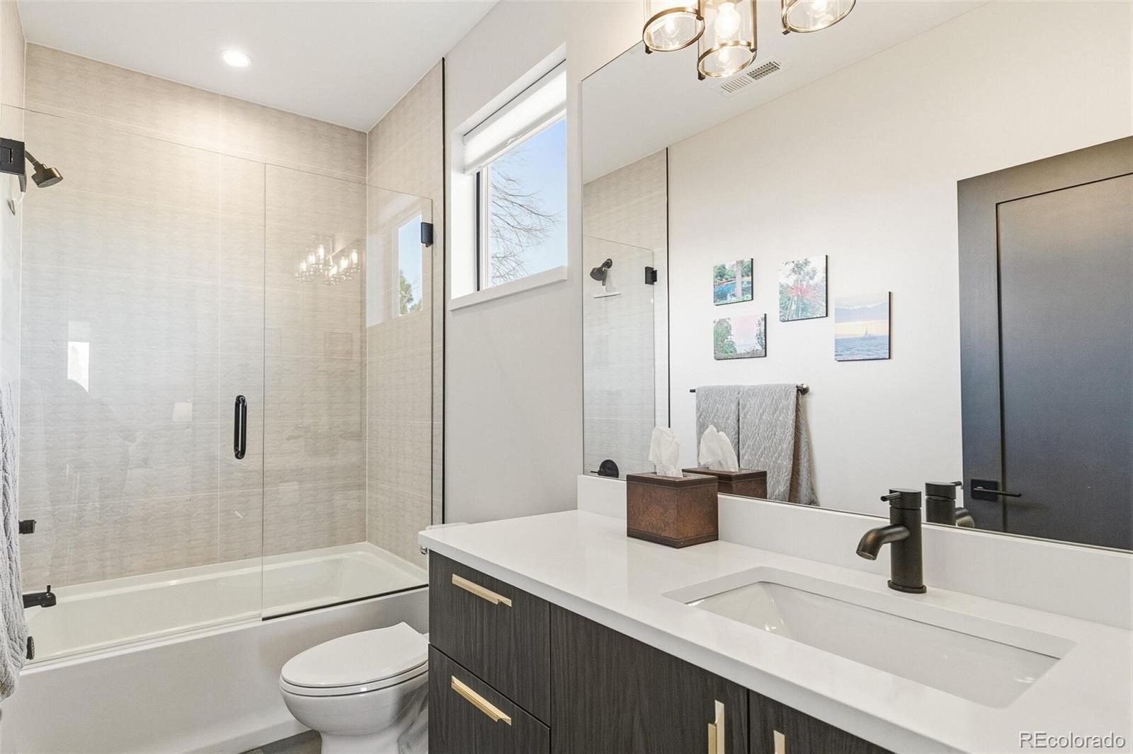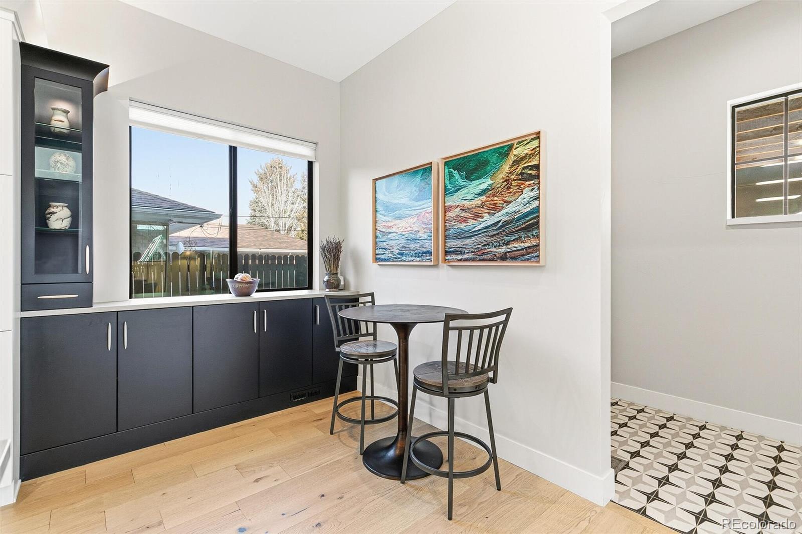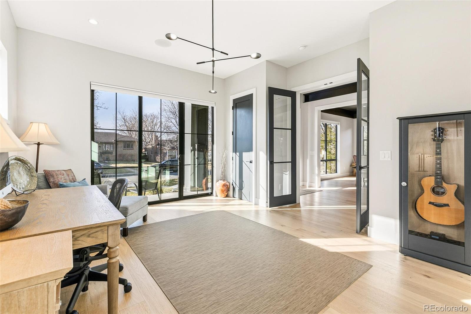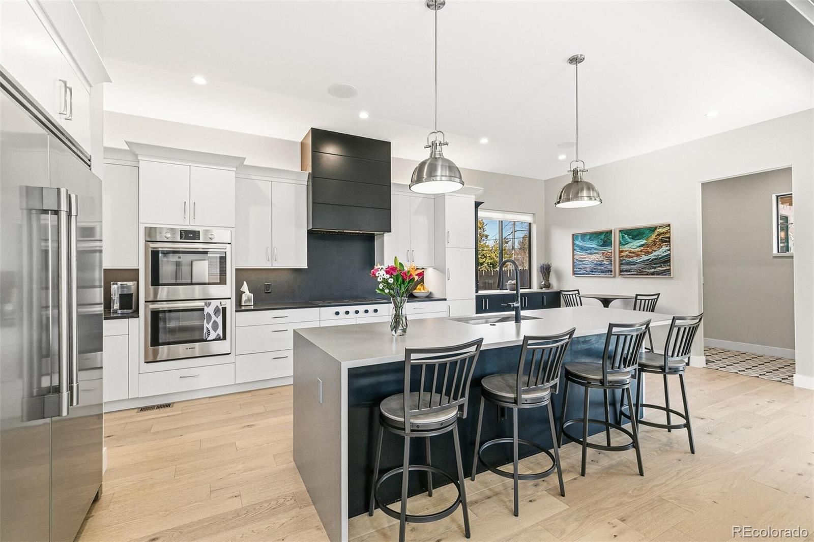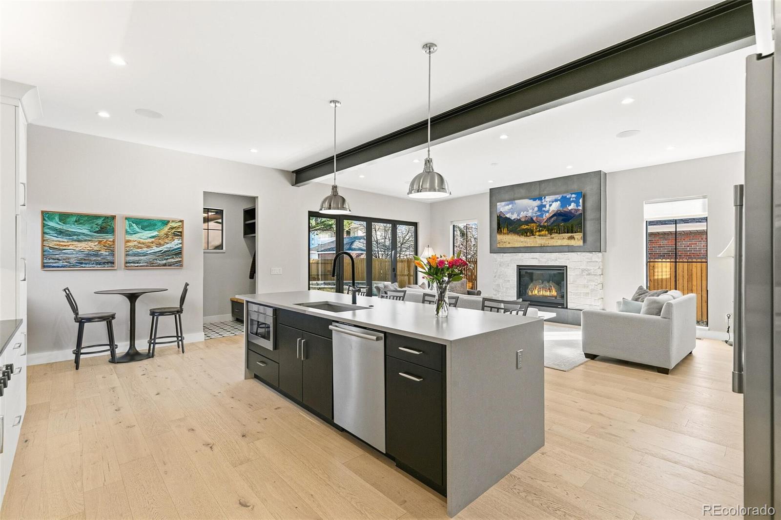 A statement of modern luxury and thoughtful design. This residence offers refined living at every turn. From the moment you enter, a dedicated office and the elegant formal dining room-set a tone of timeless sophistication. The heart of the home, the designer kitchen is a true showcase, featuring a dramatic waterfall island, sleek quartz countertops, a Wolf gas cooktop and an impressive 60" refrigerator. Entertain effortlessly with a discreet butler’s way with abundant storage and an oversized walk-in pantry. Perfectly blending form and function for everyday living. The expansive family room centers around a striking gas fireplace with a stone surround and opens seamlessly through accordion doors to the covered back patio, creating an ideal indoor-outdoor lifestyle. A gas fireplace in the professionally landscaped yard, fully fenced with a parking pad for guests or caterers. The primary suite is a private retreat, showcasing a two-sided, floor-to-ceiling stone fireplace, a serene seating area, soaring cathedral ceilings with wood paneling. Access to a private deck. The spa-inspired 5- piece bath has a stand- alone soaking tub and a large custom shower with dual showerheads. The experience continues with a generous 12' x 10' walk-in closet and an attached laundry room complete with a utility sink, offering unmatched convenience and luxury. Full finished basement with 9 ft. ceilings, wet bar with double wine fridges. a workout room if desired or additional conforming bedroom. Dual zoned HVAC, tankless water heater. Great location, close to Wash Park, Gaylord Street and Cherry Creek. This is luxury living at its finest.