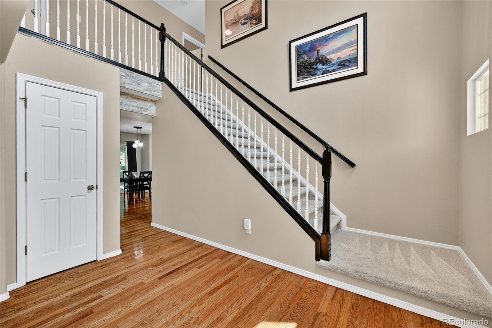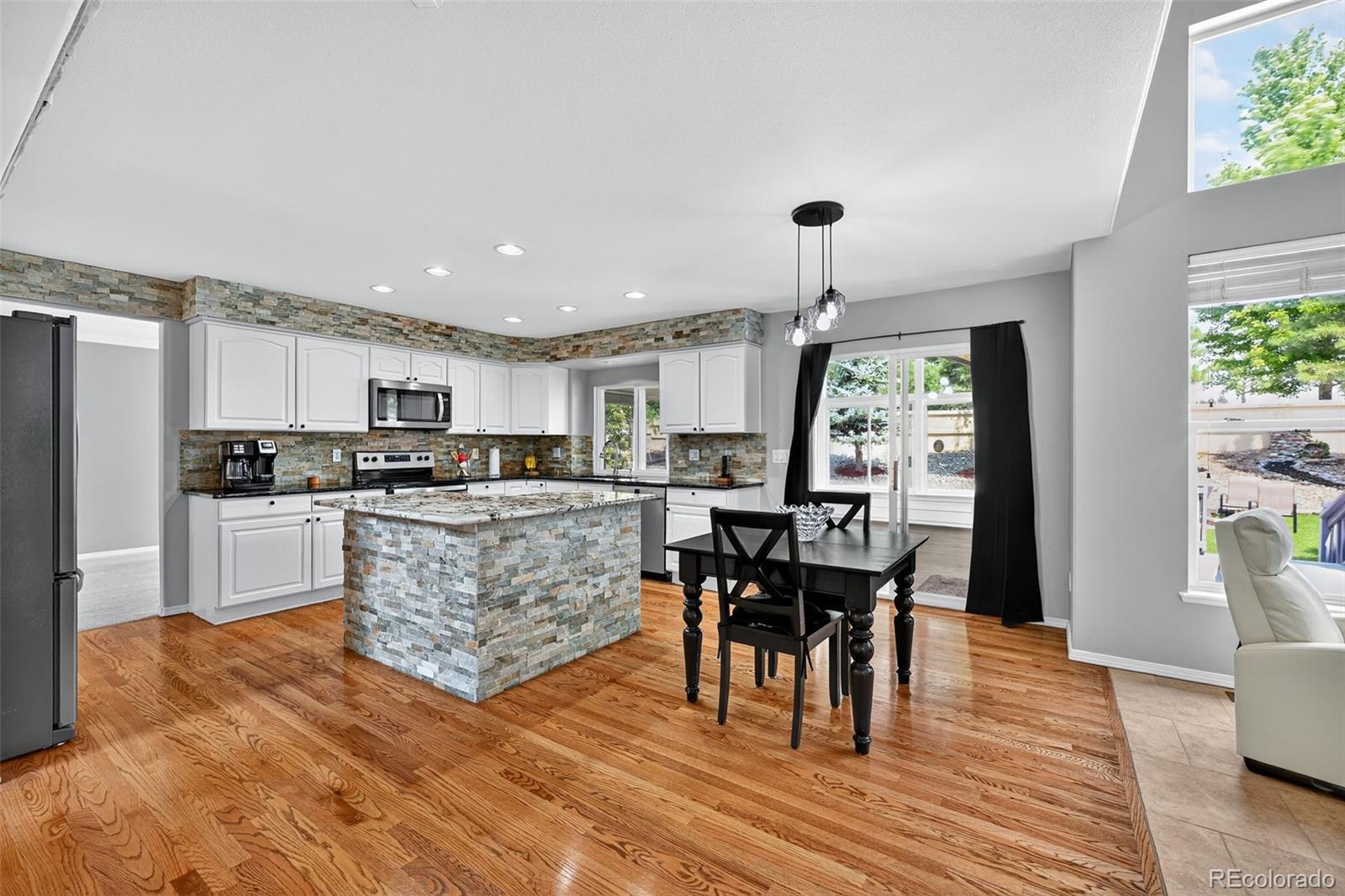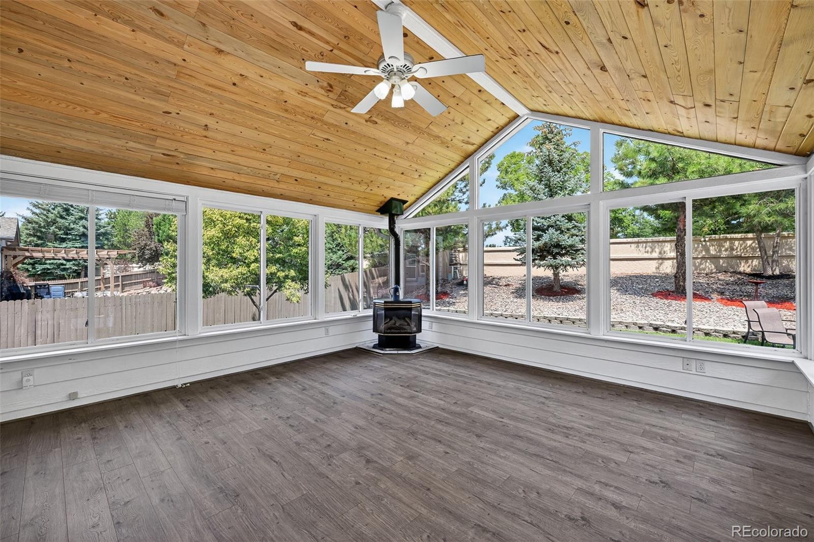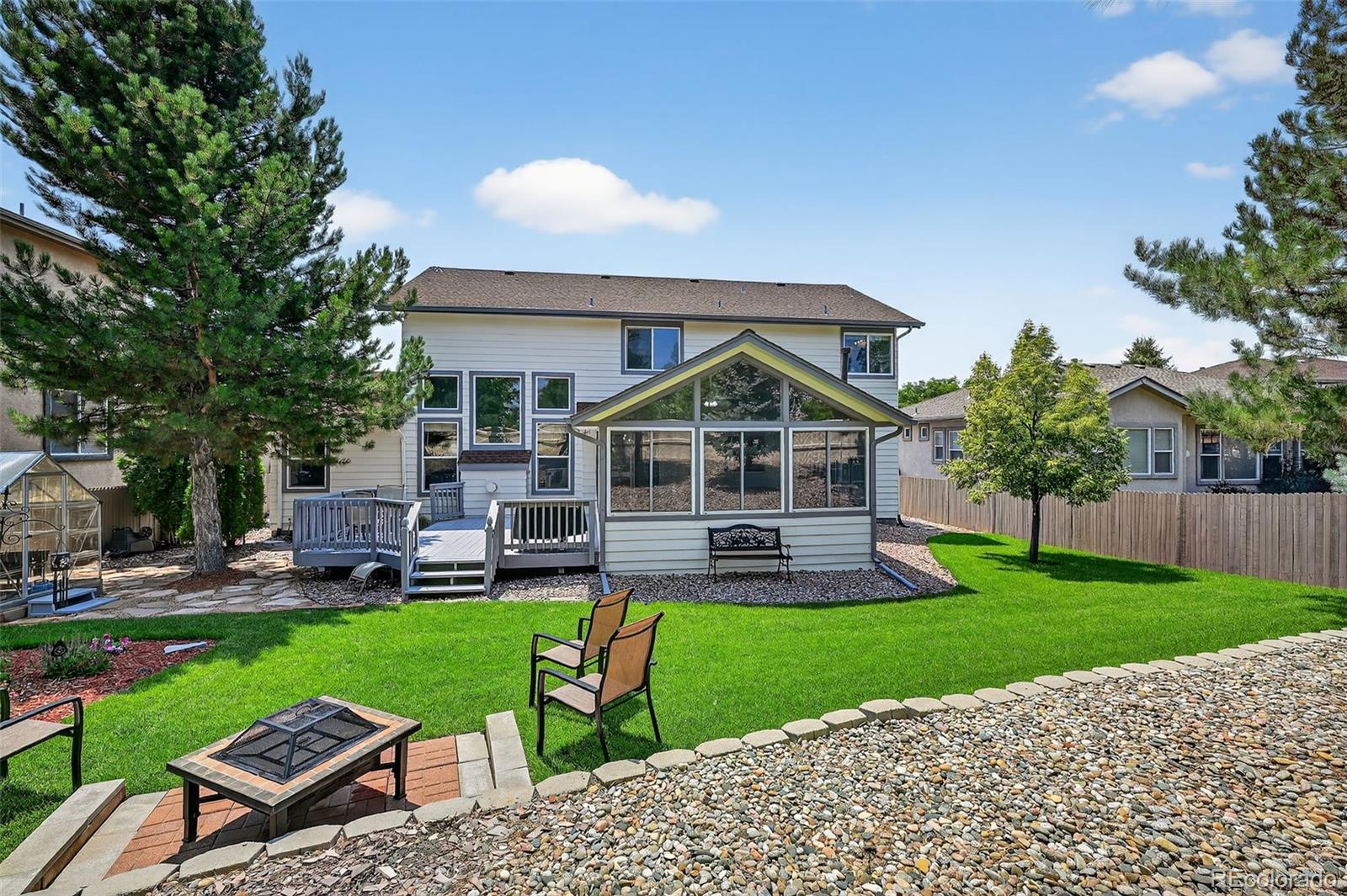 Welcome to this stunning home nestled in the highly desirable Pine Creek Community. Past the covered front patio, you're welcomed into an open entryway featuring warm hardwood floors, a convenient coat closet, and seamless access to the kitchen, second level, and family room. To the left, discover the spacious family room and adjoining formal dining area, both freshly painted and finished with plush carpeting. The beautifully updated kitchen is a true centerpiece, boasting granite countertops, stone accents, stainless steel appliances, a walk-in pantry, and a well-positioned island ideal for cooking and gathering. The adjacent breakfast nook provides casual dining and leads into the sun-drenched sunroom, complete with a gas fireplace and access to the lush backyard. The formal living room impresses with soaring ceilings, expansive windows, and a stylish gas fireplace with stone surround. This main level also offers a half bath, laundry room, and a versatile bonus room, perfect as a home office, playroom, or guest space. Upstairs, you’ll find two generously sized bedrooms and a full hall bathroom. The luxurious primary suite features vaulted, wood-accented ceilings, bay windows, and plush carpeting. A modern track door opens to the en-suite 5 piece bath with a garden tub, glass enclosed shower, dual sinks, and a 5x8 walk-in closet. The finished basement adds flexibility with a second family room, full bathroom, additional bedrooms, and a convenient kitchenette, ideal for guests, entertaining, or multigenerational living. This home also includes a whole-house humidifier, solar panels -already paid off, and a central water filtration system. The fully fenced backyard offers a serene oasis with a wood deck, firepit pad, lush lawn, and a charming greenhouse, framed by mature trees and a stucco wall for added privacy. Enjoy top-rated District 20 schools, nearby Pine Creek Golf Club, and easy access to I-25, Powers Blvd, hospitals, shopping, dining, and entertainment.