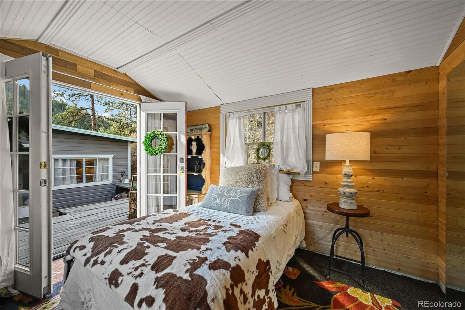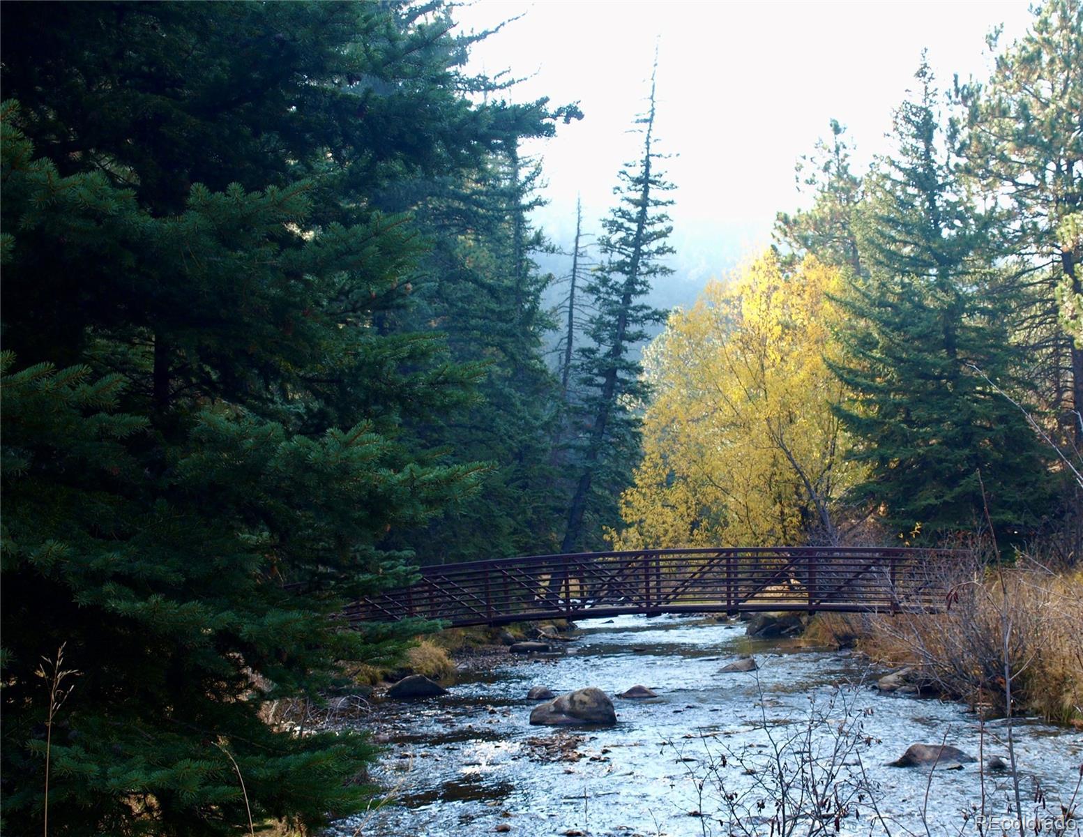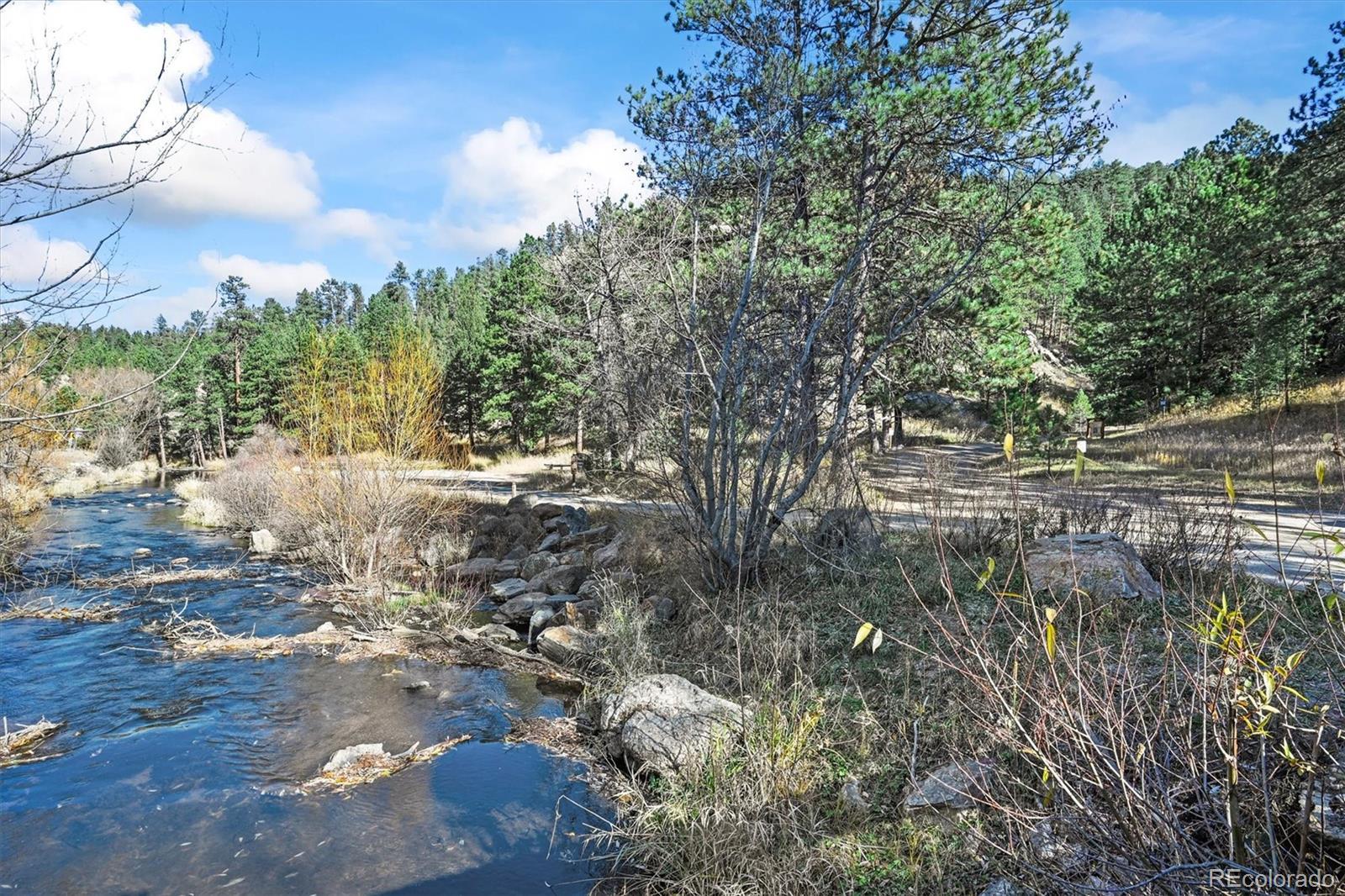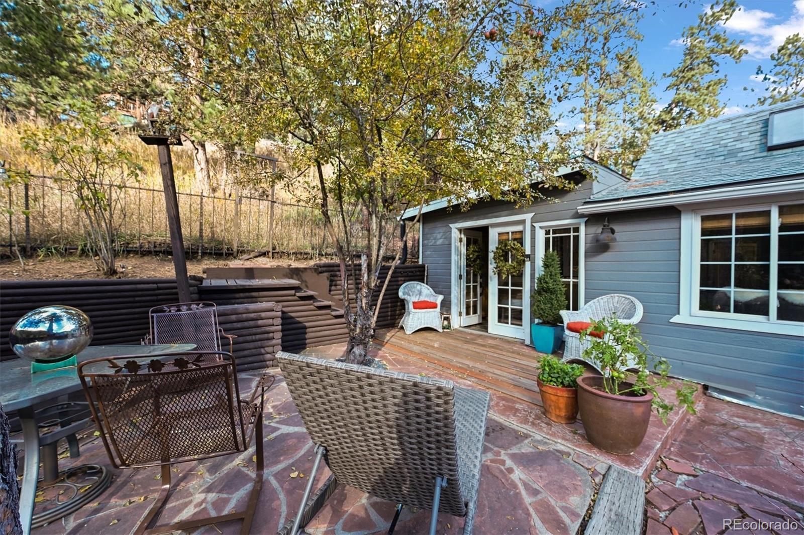 This iconic cottage in Bear Creek Canyon, perched above Bear Creek on a south facing slope, is drenched in sunlight and gives you a front row seat to the changing seasons of the Rocky Mountains as well as easy access to the amenities of town. Lovingly modernized and remodeled over the years with all the comforts of home thoughtfully designed with style and function. Enter through the courtyard with crabapple trees, lilacs and perennial beds, then through French doors into a sun dappled, slate-tiled foyer that leads to the great room with vaulted ceiling, wood beam, and a gorgeous remodeled kitchen with alder cabinets and wrought iron hardware, a large granite island with tons of storage and quality stainless appliances. The main bedroom provides ample space and storage and has a door leading to the back deck with a detached guest bedroom/yoga space/art studio. The spacious bathroom has a large soaking tub, raindrop shower head, and maple cabinets. Located just 3 minutes down the canyon from Downtown Evergreen and 25 minutes up the canyon from world-famous Red Rocks Amphitheater and Morrison, with some of the Front Range's most loved parks and trailheads up and down the canyon (Red Rocks South Entrance, Lair-O-the-Bear, Corwina and Fallon Parks) and only 30 minutes to Downtown Denver, and 1 hour east to DIA or West to Winter Park. Enjoy the courtyard under the stars and watch the moon crest the mountain ridge or stoke up the fire in the wood burning stove as falling snowflakes turn the creek and mountainside into a winter wonderland. Easy access on a county maintained, high priority plow route, paved driveway and car port. This cabin would make an incredible primary residence, artist studio, guest house or investment property. All the comforts of home with quick access to the city…yet worlds away! Furnishings negotiable. No HOA.