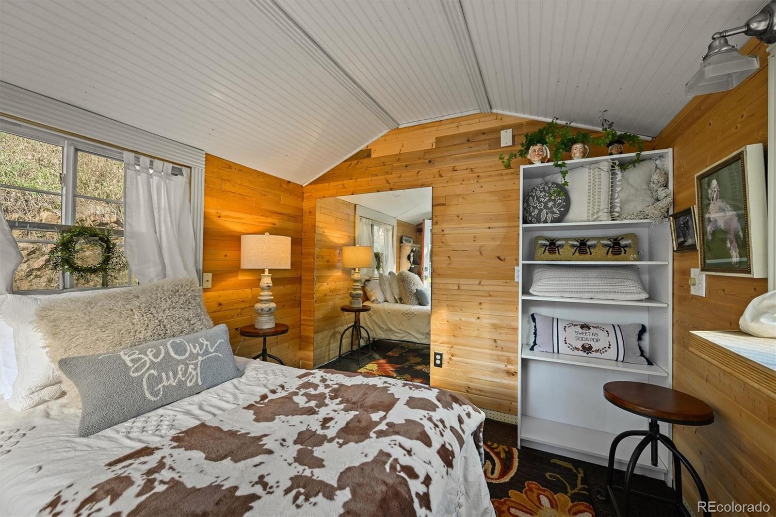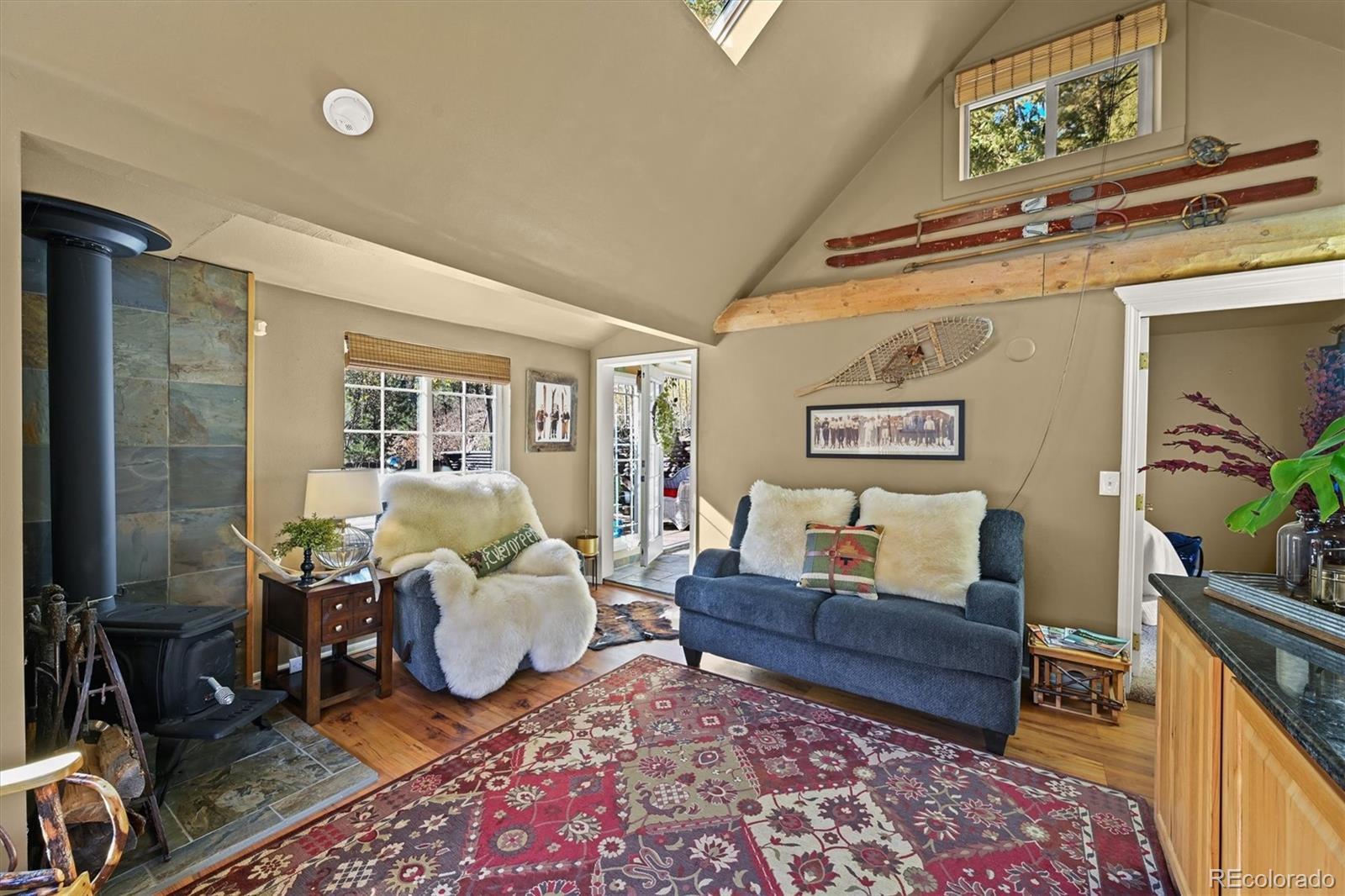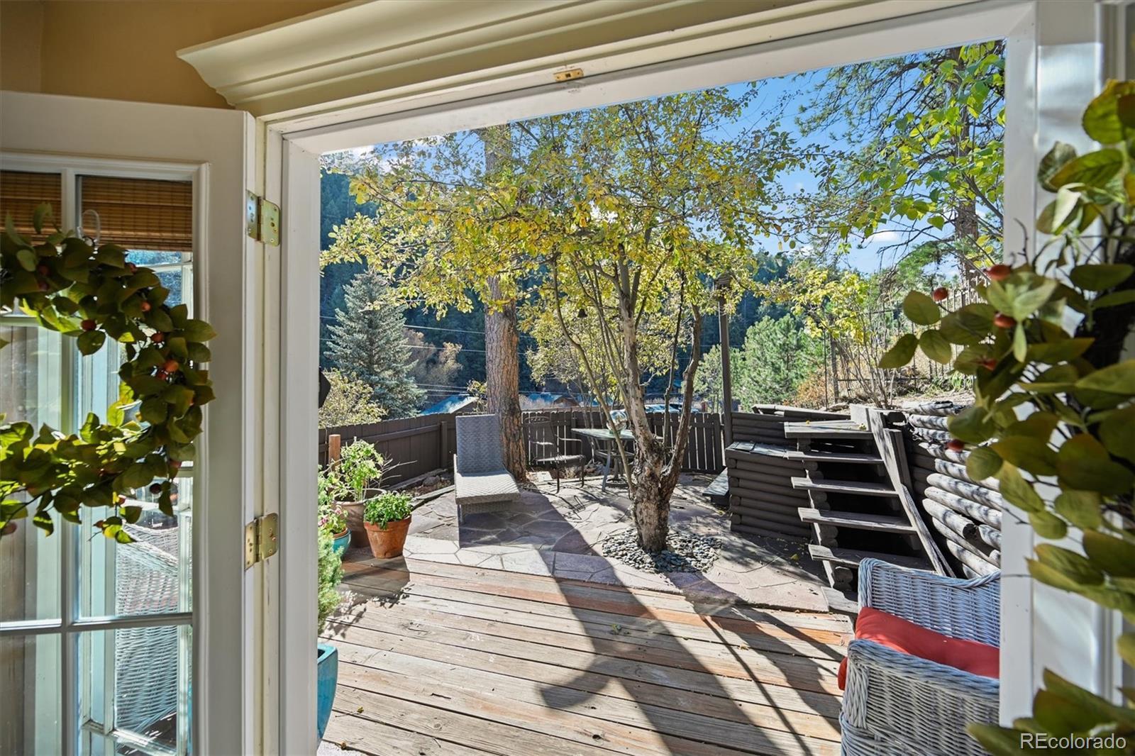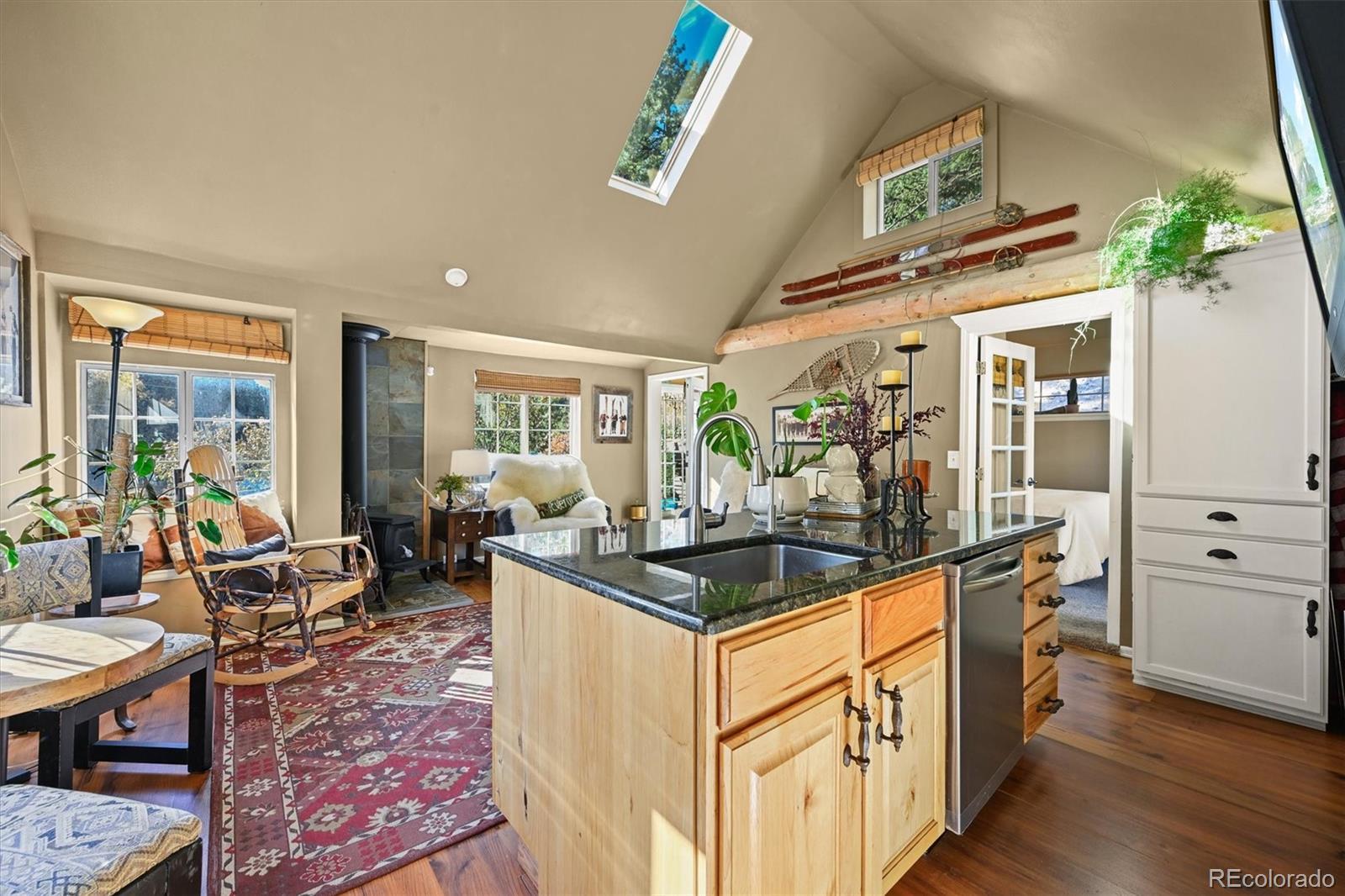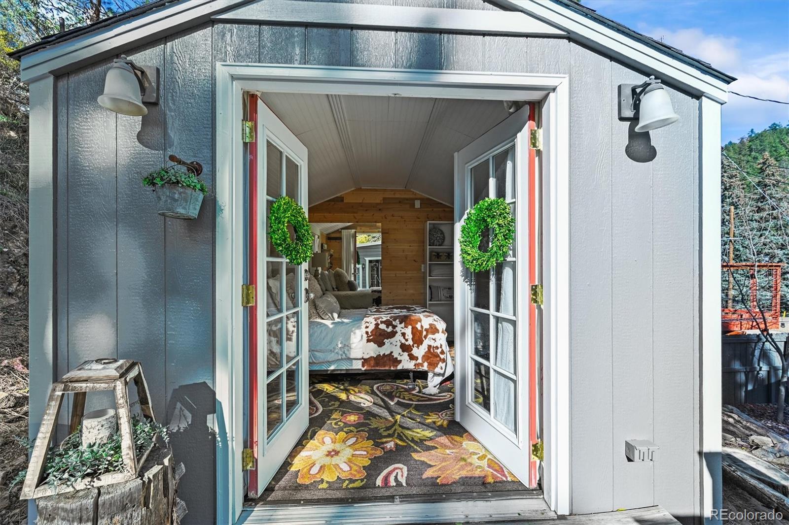 This iconic cottage in Bear Creek Canyon, perched above Bear Creek on a south facing slope, is drenched in sunlight and gives you a front row seat to the changing seasons of the Rocky Mountains as well as easy access to the amenities of town. Lovingly modernized and remodeled over the years with all the comforts of home thoughtfully designed with style and function. Enter through the courtyard with crabapple trees, lilacs and perennial beds, then through French doors into a sun dappled, slate-tiled foyer that leads to the great room with vaulted ceiling, wood beam, and a gorgeous remodeled kitchen with alder cabinets and wrought iron hardware, a large granite island with tons of storage and quality stainless appliances. The main bedroom provides ample space and storage and has a door leading to the back deck with a detached guest bedroom/yoga space/art studio. The spacious bathroom has a large soaking tub, raindrop shower head, and maple cabinets. Located just 3 minutes down the canyon from Downtown Evergreen and 25 minutes up the canyon from world-famous Red Rocks Amphitheater and Morrison, with some of the Front Range's most loved parks and trailheads up and down the canyon (Red Rocks South Entrance, Lair-O-the-Bear, Corwina and Fallon Parks) and only 30 minutes to Downtown Denver, and 1 hour east to DIA or West to Winter Park. Enjoy the courtyard under the stars and watch the moon crest the mountain ridge or stoke up the fire in the wood burning stove as falling snowflakes turn the creek and mountainside into a winter wonderland. Easy access on a county maintained, high priority plow route, paved driveway and car port. This cabin would make an incredible primary residence, artist studio, guest house or investment property. All the comforts of home with quick access to the city…yet worlds away! Furnishings negotiable. No HOA.
