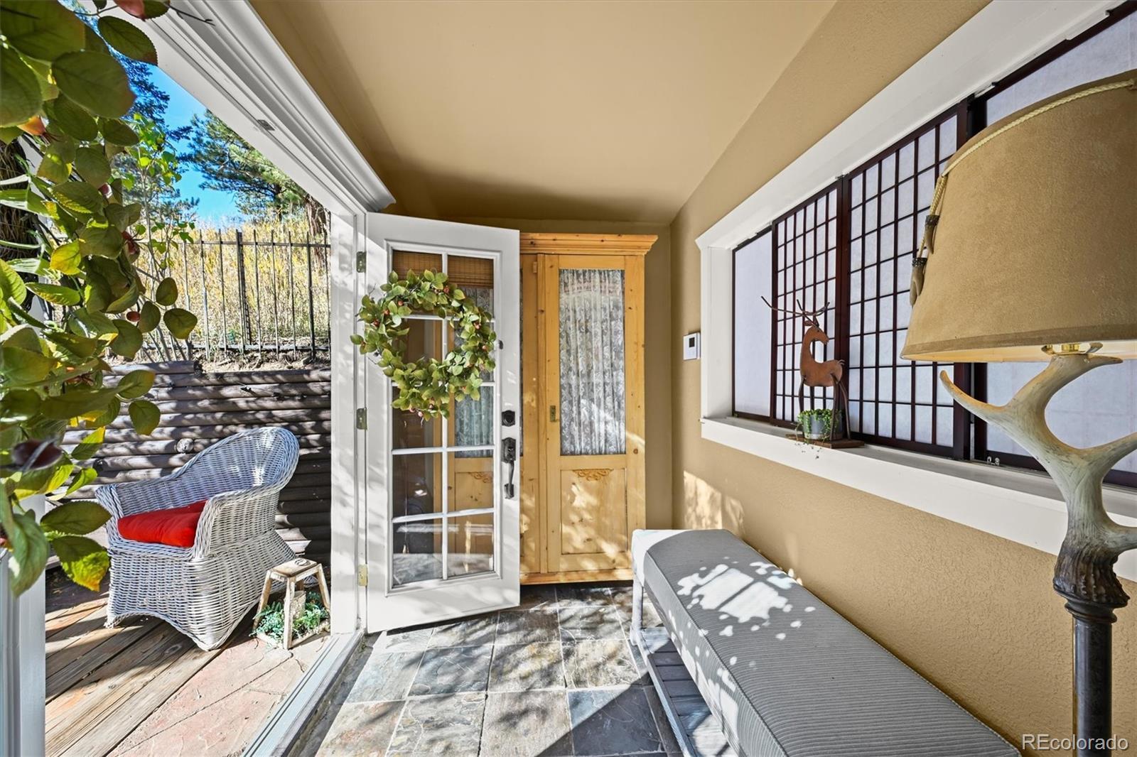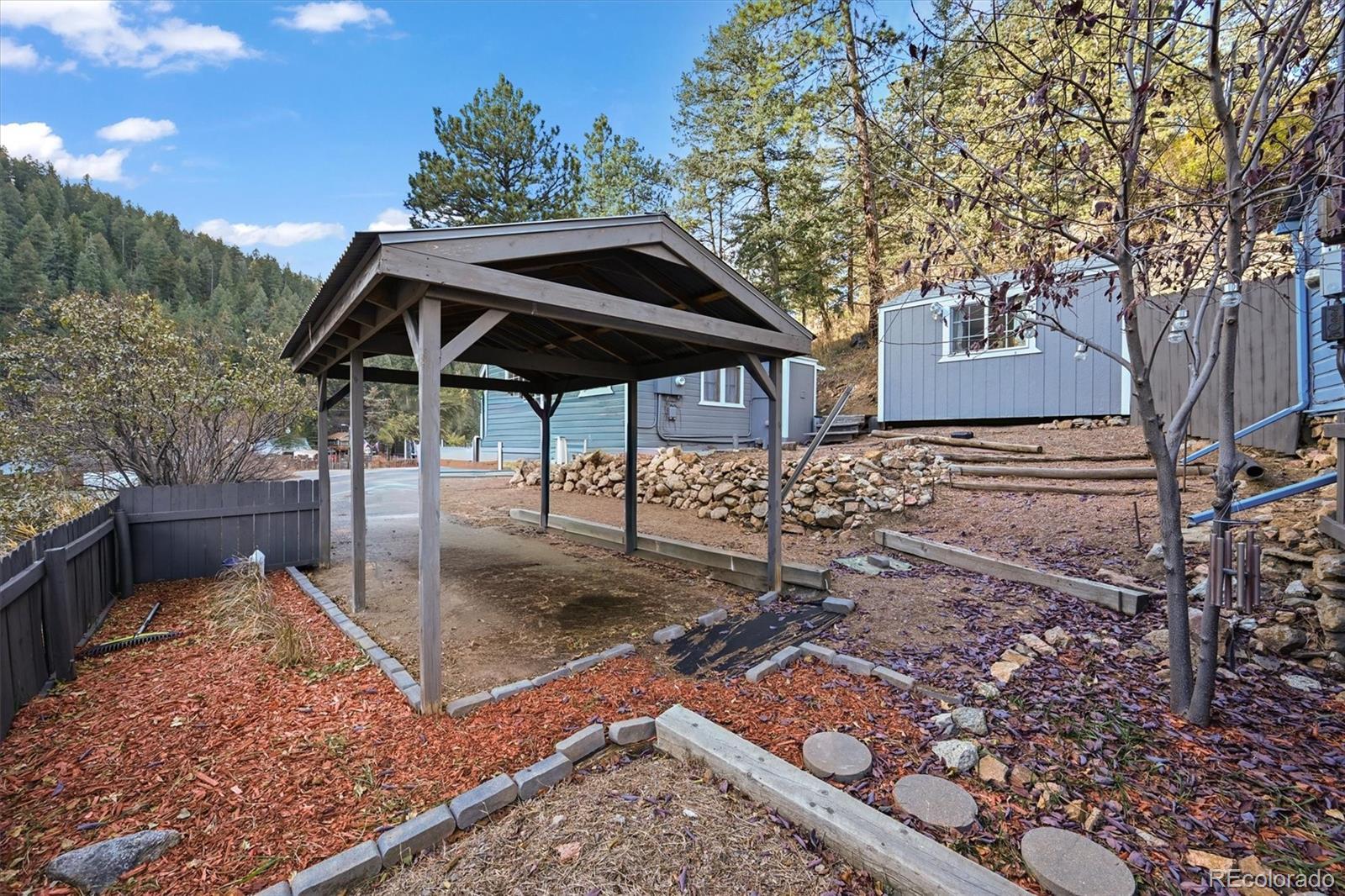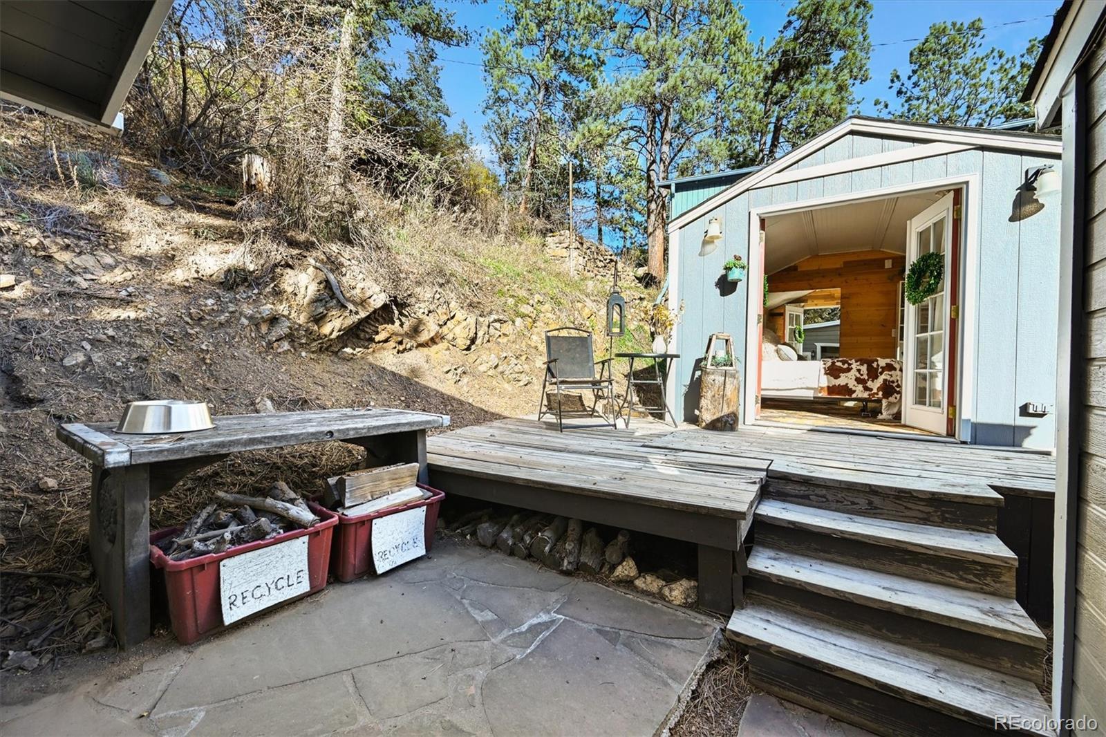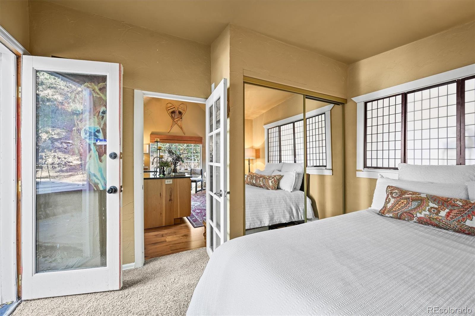 This iconic cottage in Bear Creek Canyon, perched above Bear Creek on a south facing slope, is drenched in sunlight and gives you a front row seat to the changing seasons of the Rocky Mountains as well as easy access to the amenities of town. Lovingly modernized and remodeled over the years with all the comforts of home thoughtfully designed with style and function. Enter through the courtyard with crabapple trees, lilacs and perennial beds, then through French doors into a sun dappled, slate-tiled foyer that leads to the great room with vaulted ceiling, wood beam, and a gorgeous remodeled kitchen with alder cabinets and wrought iron hardware, a large granite island with tons of storage and quality stainless appliances. The main bedroom provides ample space and storage and has a door leading to the back deck with a detached guest bedroom/yoga space/art studio. The spacious bathroom has a large soaking tub, raindrop shower head, and maple cabinets. Located just 3 minutes down the canyon from Downtown Evergreen and 25 minutes up the canyon from world-famous Red Rocks Amphitheater and Morrison, with some of the Front Range's most loved parks and trailheads up and down the canyon (Red Rocks South Entrance, Lair-O-the-Bear, Corwina and Fallon Parks) and only 30 minutes to Downtown Denver, and 1 hour east to DIA or West to Winter Park. Enjoy the courtyard under the stars and watch the moon crest the mountain ridge or stoke up the fire in the wood burning stove as falling snowflakes turn the creek and mountainside into a winter wonderland. Easy access on a county maintained, high priority plow route, paved driveway and car port. This cabin would make an incredible primary residence, artist studio, guest house or investment property. All the comforts of home with quick access to the city…yet worlds away! Furnishings negotiable. No HOA.