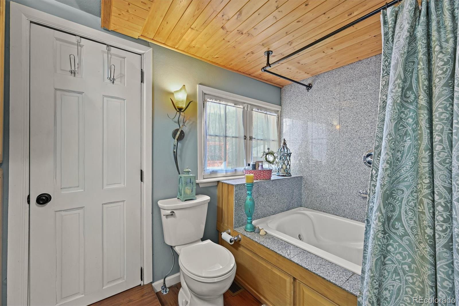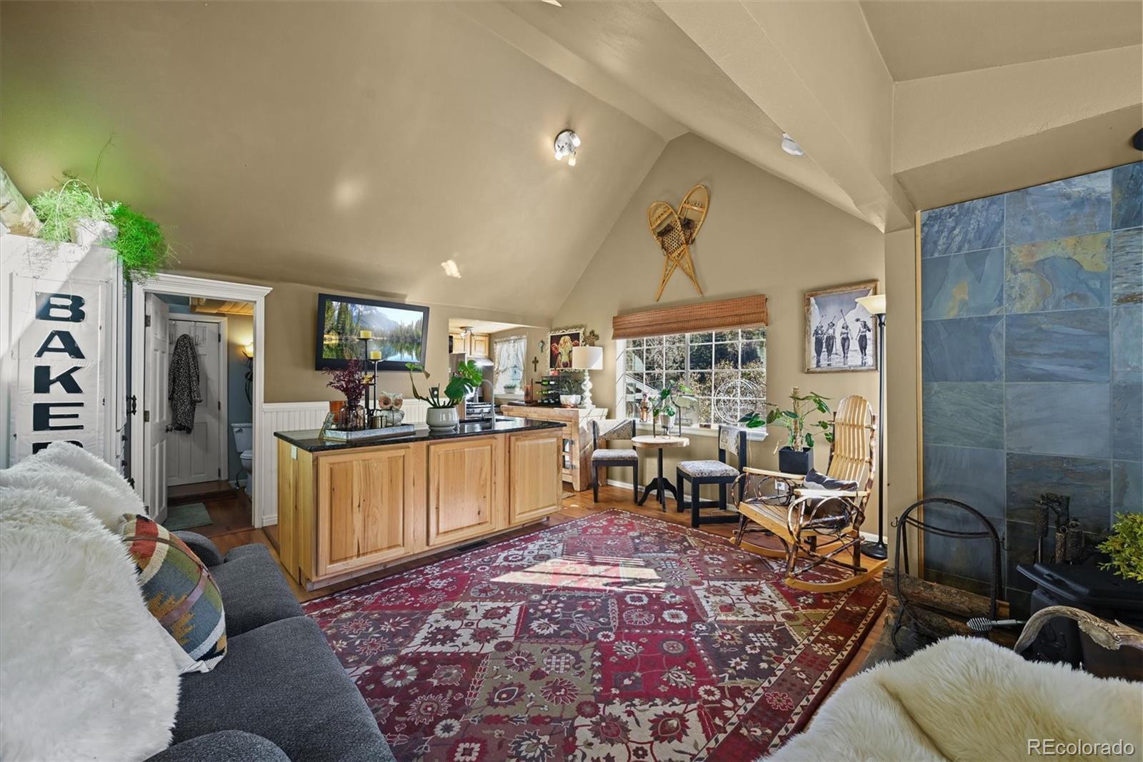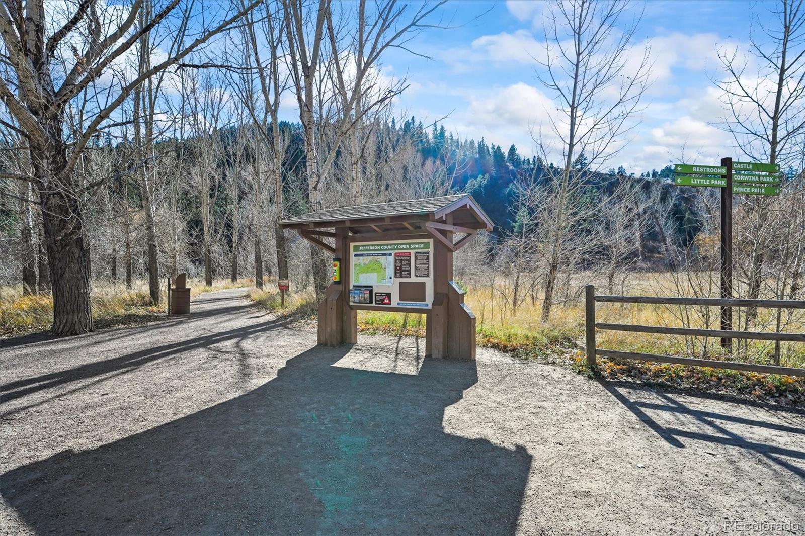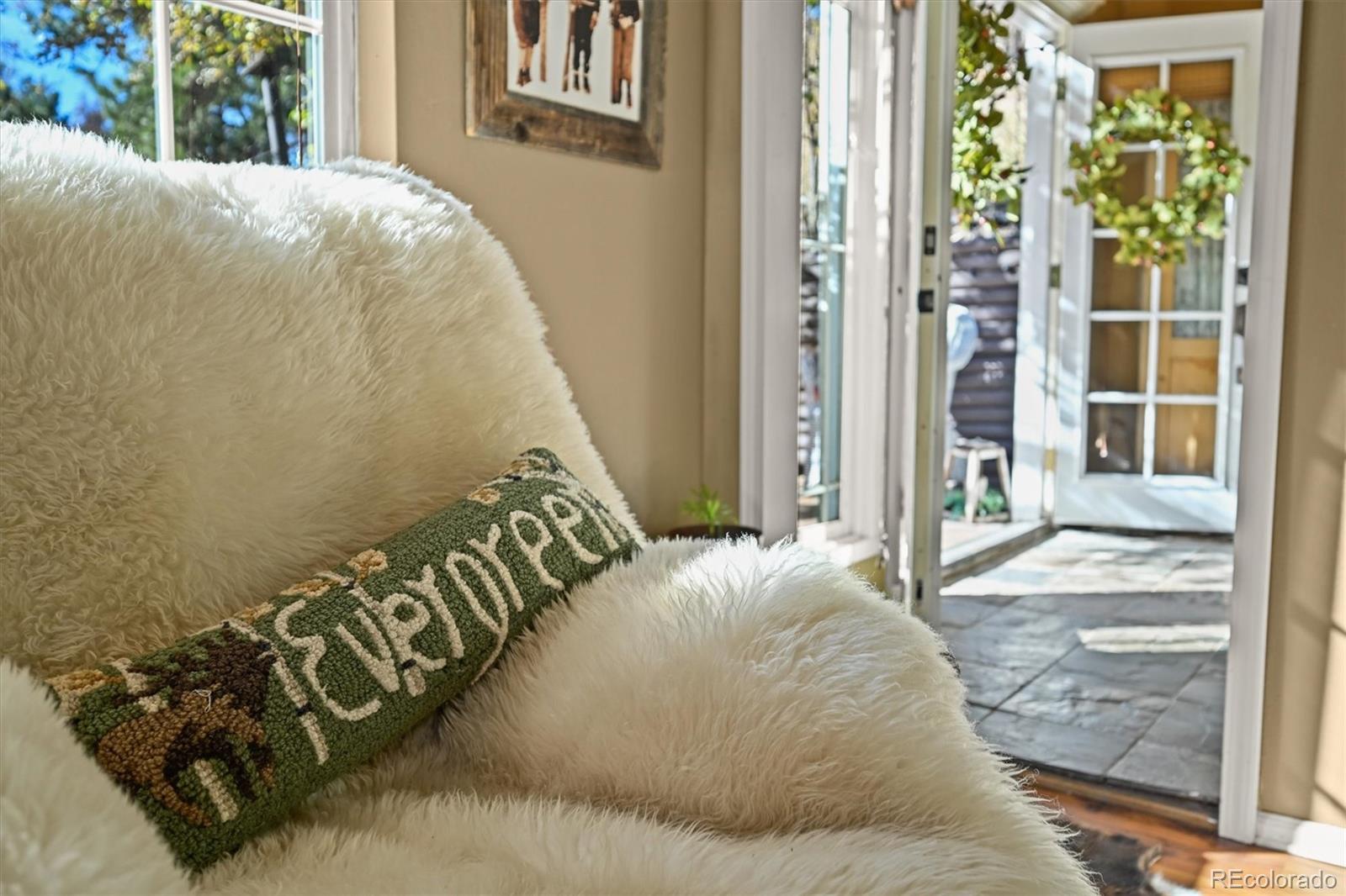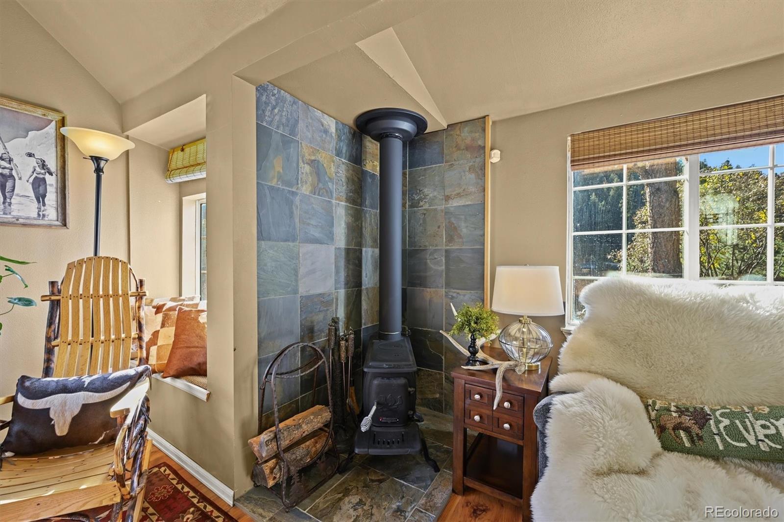 This iconic cottage in Bear Creek Canyon, perched above Bear Creek on a south facing slope, is drenched in sunlight and gives you a front row seat to the changing seasons of the Rocky Mountains as well as easy access to the amenities of town. Lovingly modernized and remodeled over the years with all the comforts of home thoughtfully designed with style and function. Enter through the courtyard with crabapple trees, lilacs and perennial beds, then through French doors into a sun dappled, slate-tiled foyer that leads to the great room with vaulted ceiling, wood beam, and a gorgeous remodeled kitchen with alder cabinets and wrought iron hardware, a large granite island with tons of storage and quality stainless appliances. The main bedroom provides ample space and storage and has a door leading to the back deck with a detached guest bedroom/yoga space/art studio. The spacious bathroom has a large soaking tub, raindrop shower head, and maple cabinets. Located just 3 minutes down the canyon from Downtown Evergreen and 25 minutes up the canyon from world-famous Red Rocks Amphitheater and Morrison, with some of the Front Range's most loved parks and trailheads up and down the canyon (Red Rocks South Entrance, Lair-O-the-Bear, Corwina and Fallon Parks) and only 30 minutes to Downtown Denver, and 1 hour east to DIA or West to Winter Park. Enjoy the courtyard under the stars and watch the moon crest the mountain ridge or stoke up the fire in the wood burning stove as falling snowflakes turn the creek and mountainside into a winter wonderland. Easy access on a county maintained, high priority plow route, paved driveway and car port. This cabin would make an incredible primary residence, artist studio, guest house or investment property. All the comforts of home with quick access to the city…yet worlds away! Furnishings negotiable. No HOA.