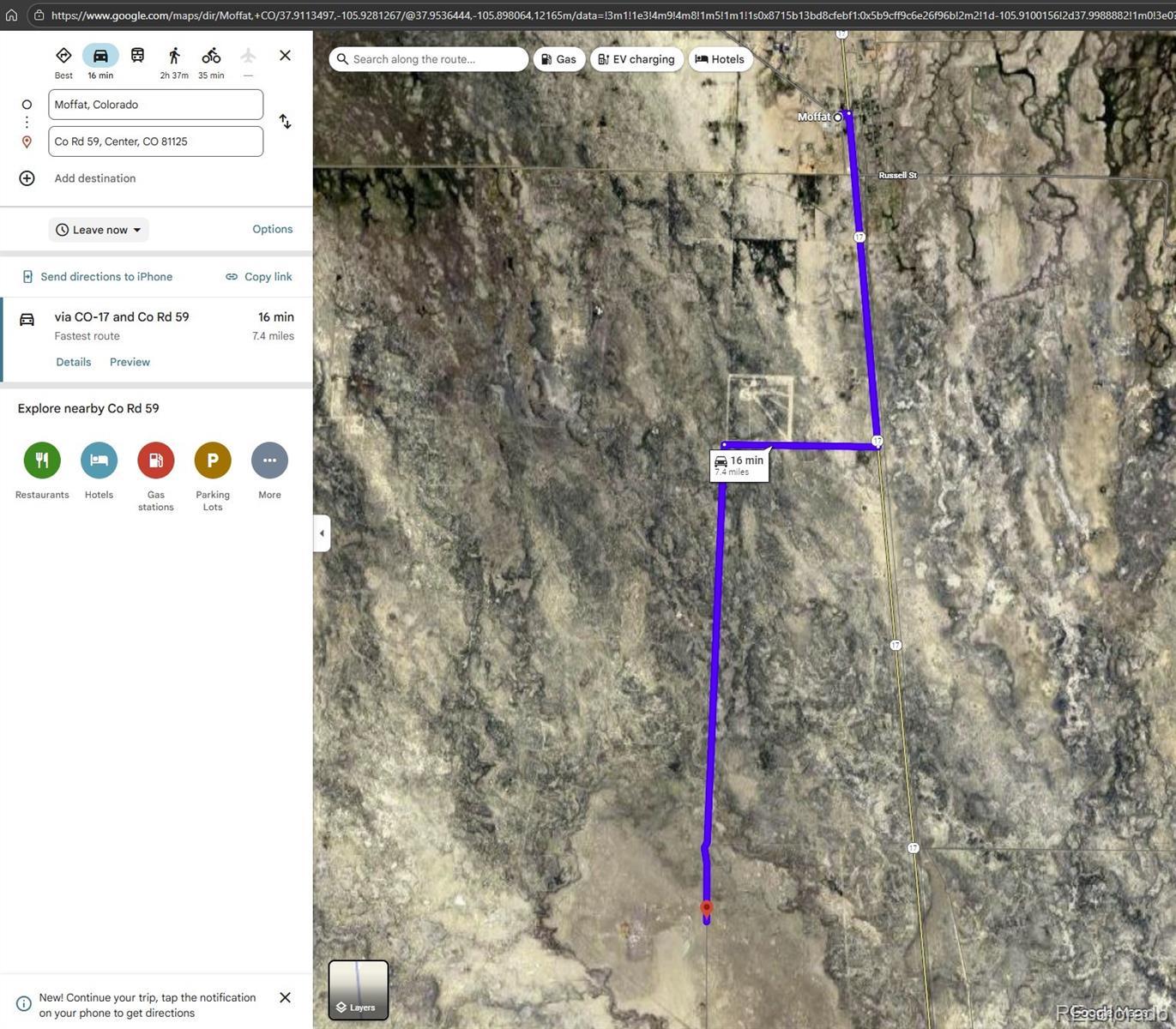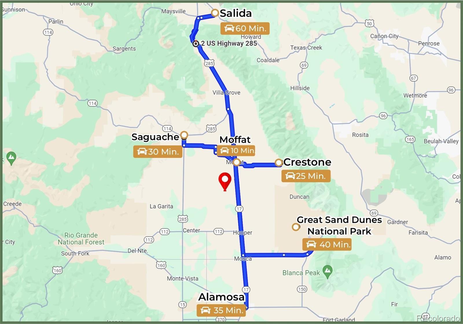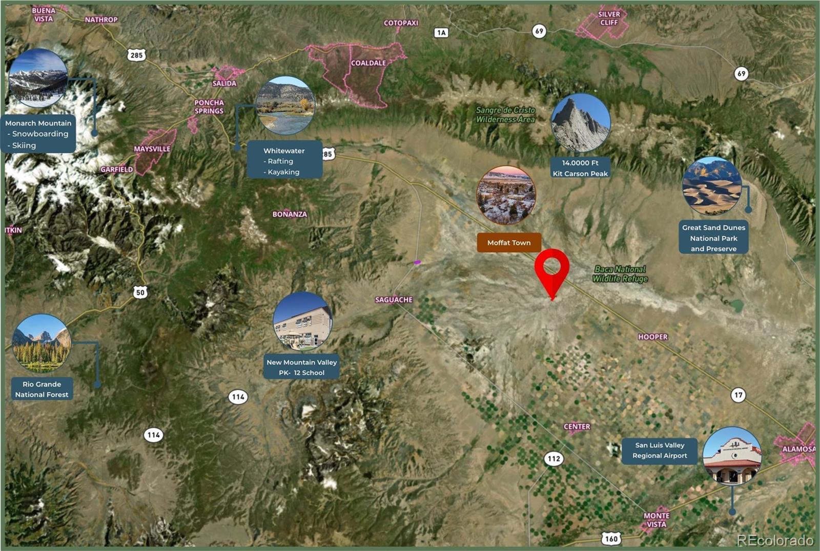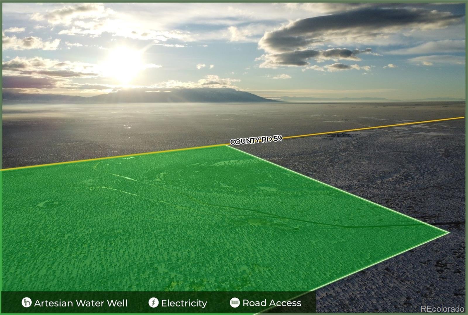 80-Acres with your own ARTESIAN WELL, ELECTRICITY at lot line, and panoramic 360-degree of mountain views plus Great Sand Dunes National Park views! Located in the heart of the San Luis Valley this parcel benefits from DIRECT ACCESS via County Road 59 - a COUNTY-MAINTAINED ROAD. To complete your peaceful and quiet paradise, there's NO NEIGHBORS to the North, South, or East! This expansive property borders public BLM LAND parcels both to the North and the South - plus to the East, it borders the SAGUACHE CREEK STATE LAND TRUST (PUBLIC HUNTING ACCESS) with almost 5,000 acres of recreational land in Game Unit 682. That means that no one will EVER be able to build and block your views in neither North, South, nor East directions. Only 16 minutes to Moffat, CO (7 to 8 miles) and 18 minutes to Hooper, CO....plus only 20 minutes to HOT SPRINGS at the Sand Dunes Recreation Pool. ARTESIAN WELL never stops flowing and its stream has created a small pond - perfect for cattle, irrigation, horses, or anything you want to do with all the water it pumps from the confined aquifer. They don't make these wells often anymore and they are very deep. Land is Flat, usable acreage with panoramic views in every direction. READY TO BUILD! The ARTESIAN WELL provides a rare water advantage, and the presence of ELECTRICITY makes it so that this land is ready to build after septic installation (around $20K). This piece of land is ready to build as fast as you want - you can even split it into two 40-acre parcels and build multiple houses plus be allowed to drill another well. No HOA and no covenants — bring your vision, build your homestead, or hold as a long-term land investment. Easy access to Highway 285 leading directly to Salida, Alamosa, or Denver. Close to top outdoor destinations including the Great Sand Dunes, Monarch Mountain skiing, and the Arkansas River for rafting and fishing. A truly RARE COMBINATION of WATER, POWER, ACCESS, and FREEDOM — we can help with development!