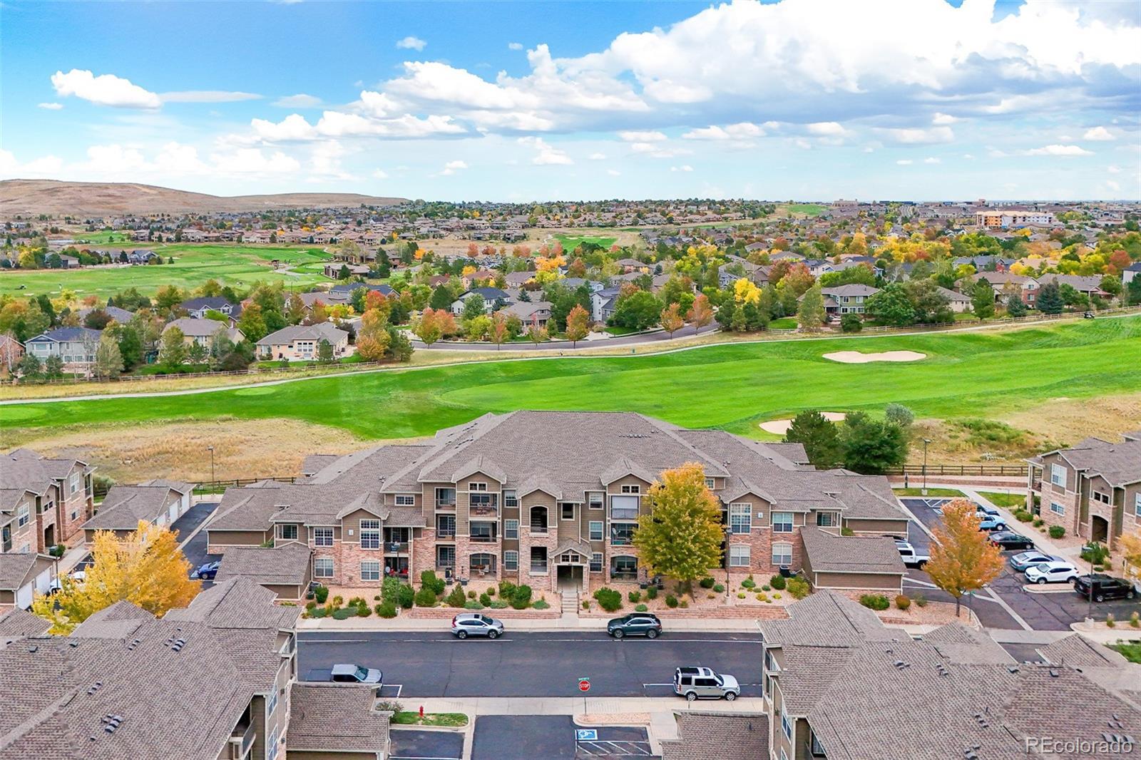 Welcome to one of the largest condos in Blue Sky at Vista Ridge, offering breathtaking golf course views from nearly every room and two private balconies, including one off the primary suite. This spacious two-story home features 3 bedrooms and 3 full bathrooms, including a luxurious primary suite plus a secondary suite in the upper-level loft. The main level also offers a versatile bedroom that can serve as a home office. The open-concept living area is filled with natural light and includes a cozy fireplace, dining space, and an updated kitchen with granite countertops and newer stainless steel appliances. Convenience is built in with a laundry closet including washer and dryer, two exterior storage areas, and an oversized 1-car garage. Recent updates include newer carpet, a 1-year-old furnace and A/C, new light fixtures, modern vanities with sinks, and stylish black hardware and fixtures throughout. Enjoy resort-style amenities with the HOA covering water and exterior maintenance with insurance. Community perks include an outdoor pool and hot tub, multiple playgrounds, and a clubhouse with a fitness center. Located near Children’s Hospital, shops, grocery store, restaurants, major highways, and the golf course, this home offers the perfect balance of comfort, convenience, and low-maintenance living.