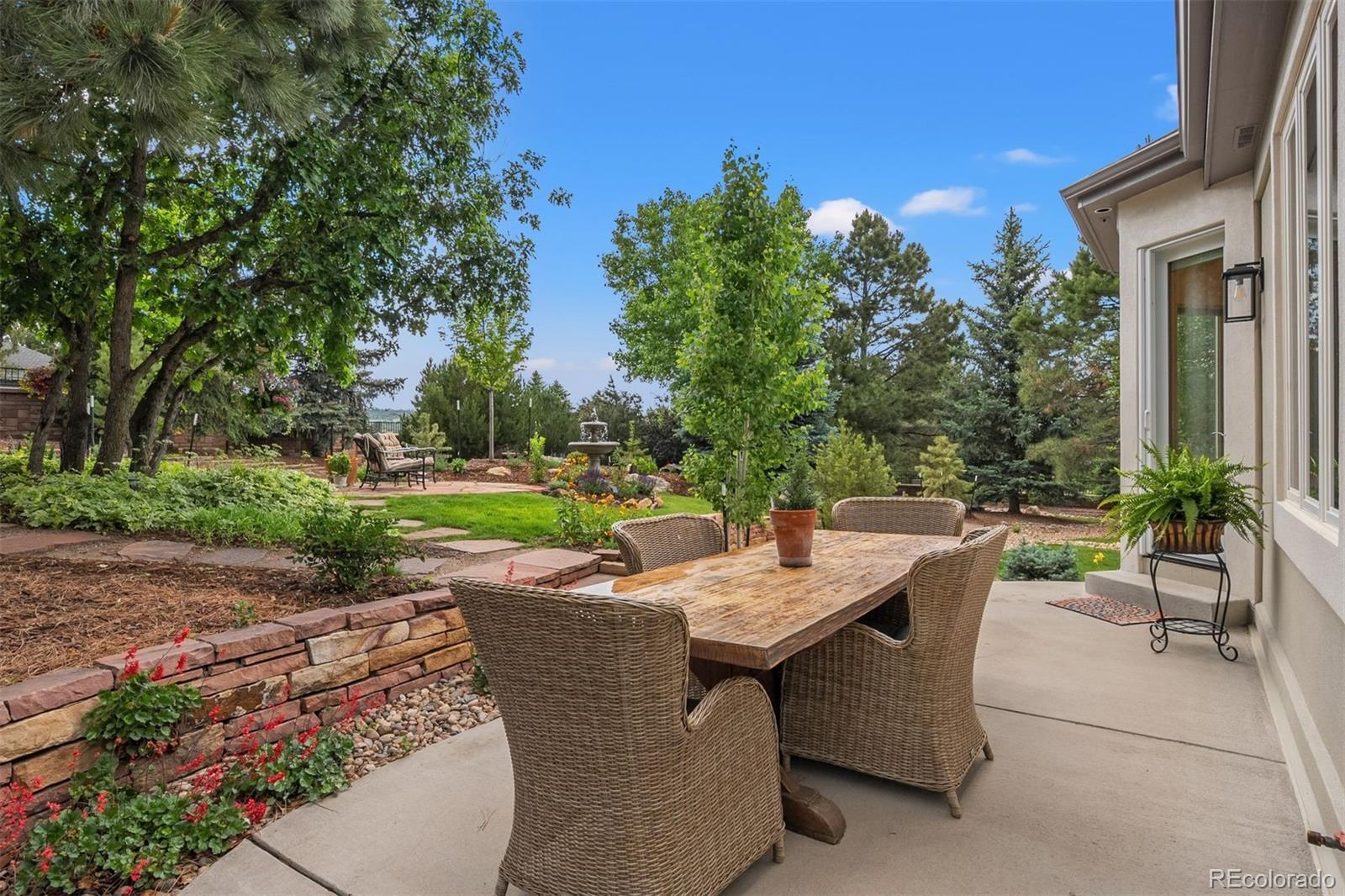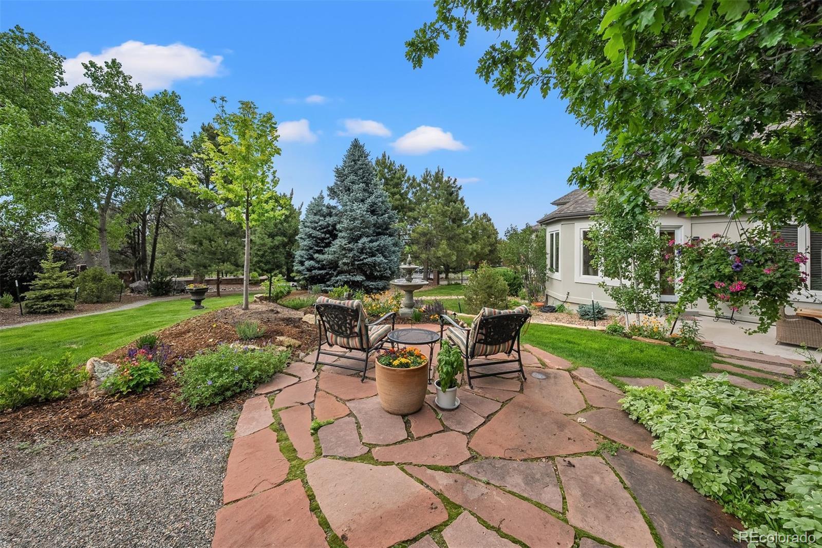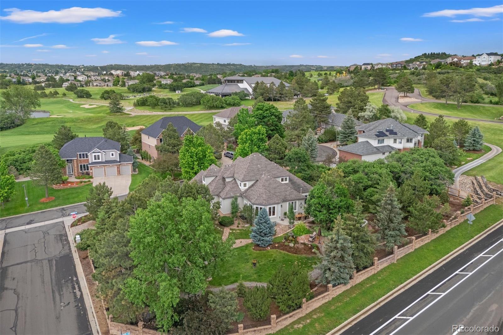 Imagine your own private park—lush, layered, and remarkably peaceful. Set on nearly ¾ of an acre, on a quiet cul-de-sac in the desirable, low tax, low HOA Plum Creek community, this corner-lot property is surrounded by towering trees, winding gardens, and multiple patios that invite both everyday ease and entertaining, while a seasonal fountain and fire pit add to the atmosphere. Inside, main-floor living, fresh updates, and natural flow make daily life feel grounded and easy. The property backs to Plum Creek Parkway yet remains remarkably tranquil—so quiet, you’d never know it. The home balances openness and warmth with soaring ceilings, on-trend finishes, and rooms that feel both expansive and personal. Two-story ceilings greet you in the foyer, and natural light pours through clerestory windows in the formal dining room. The great room is grounded by a stacked stone fireplace and backyard views, while the kitchen keeps things fresh and functional with clean white cabinetry, a newly added tile backsplash, new gas cooktop, granite counters, and a sunny eat-in nook overlooking “the park.” The private main-level primary suite features its own fireplace and direct access to the yard, while upstairs, a flexible loft joins two spacious bedrooms and two bathrooms—including one with a vaulted ceiling, dormer window, and private ensuite. The finished basement adds even more flexibility with a large rec room, two bedrooms, and generous storage. And throughout, details like new carpet, updated tile, and fresh paint inside and out create a polished, move-in-ready feel—no projects, just living. Set in the Plum Creek community, surrounded by rolling fairways and sweeping Front Range views, this home offers easy access to the golf course and a lifestyle rooted in connection, recreation, and natural beauty.