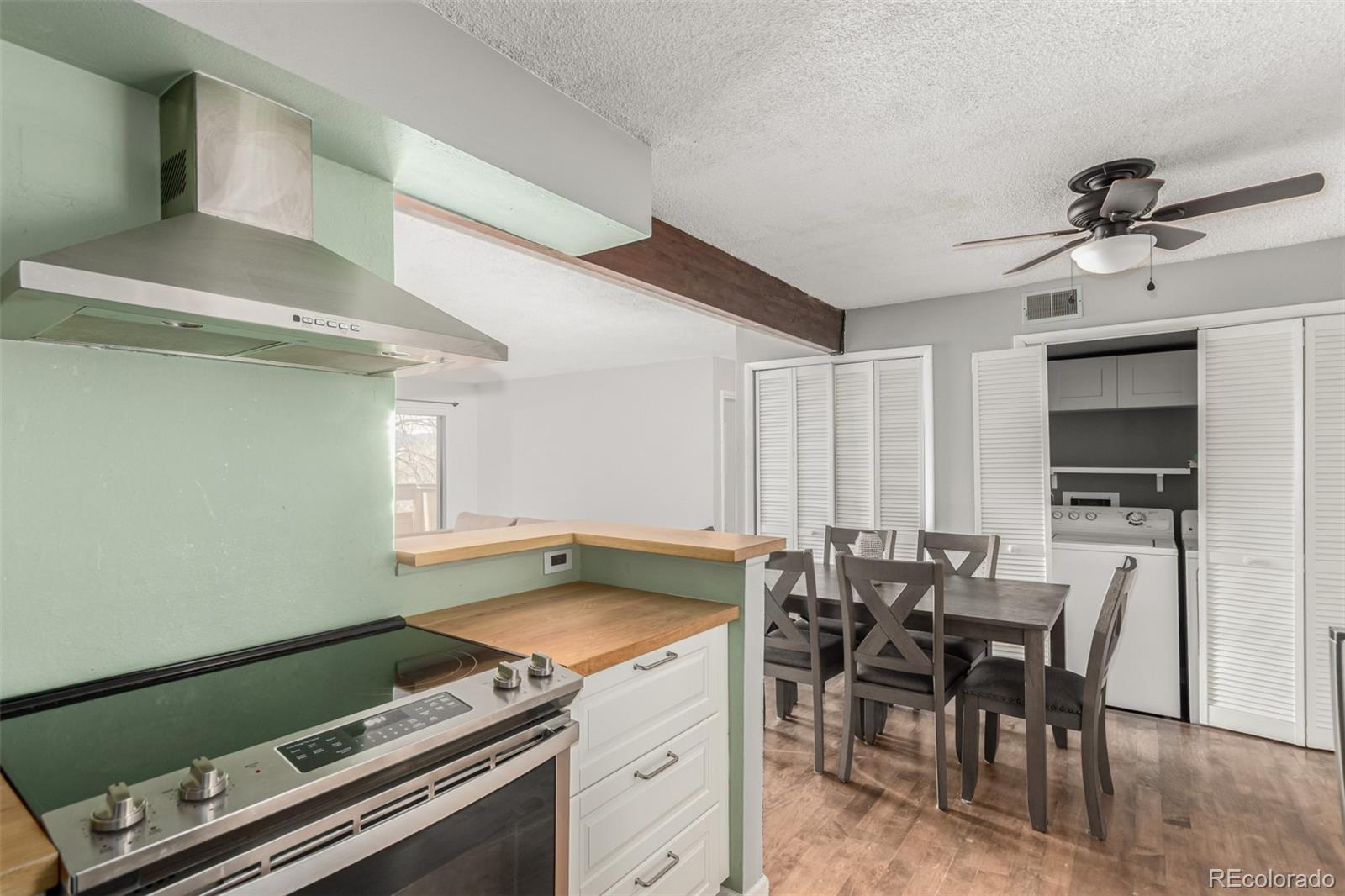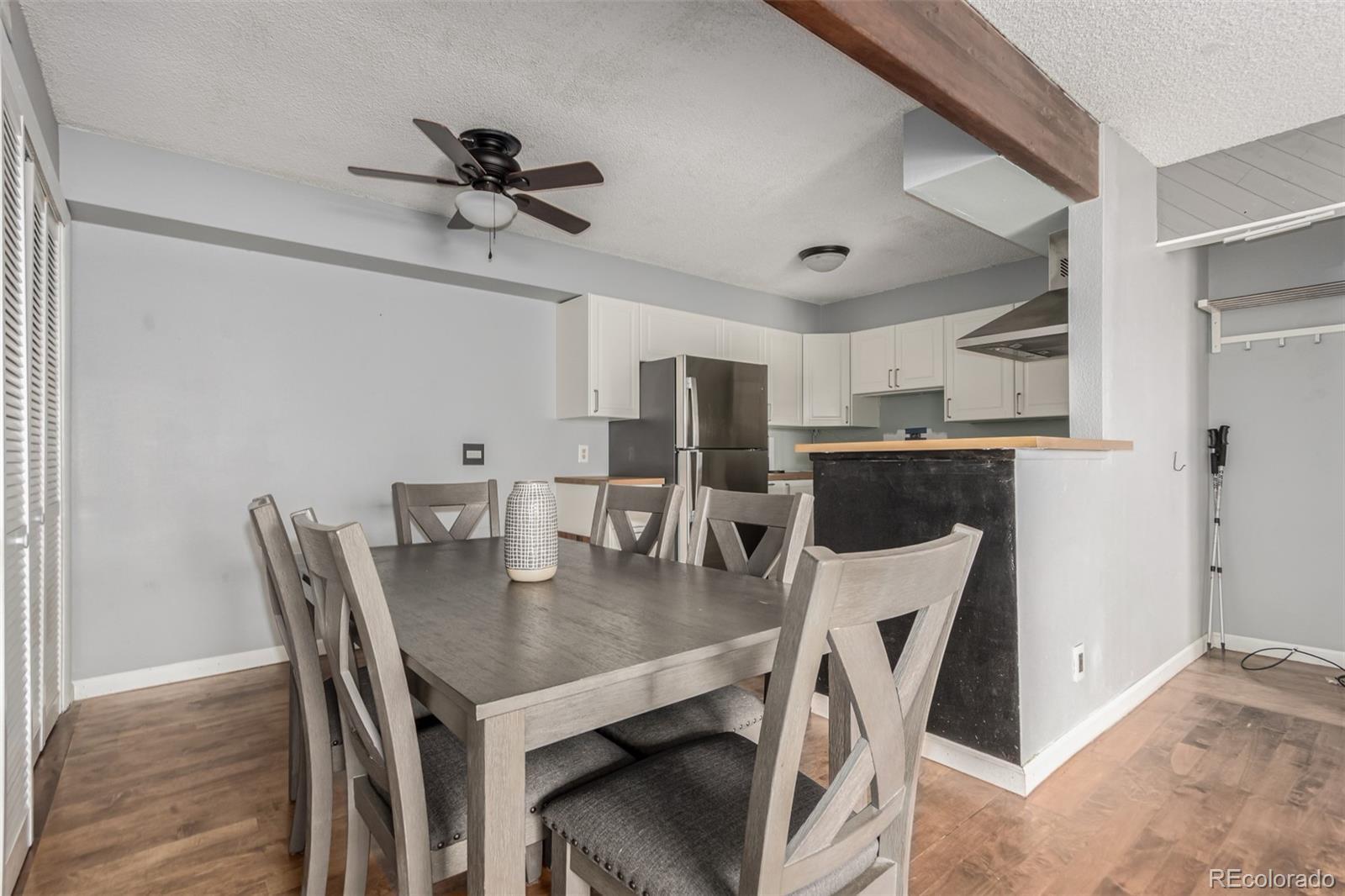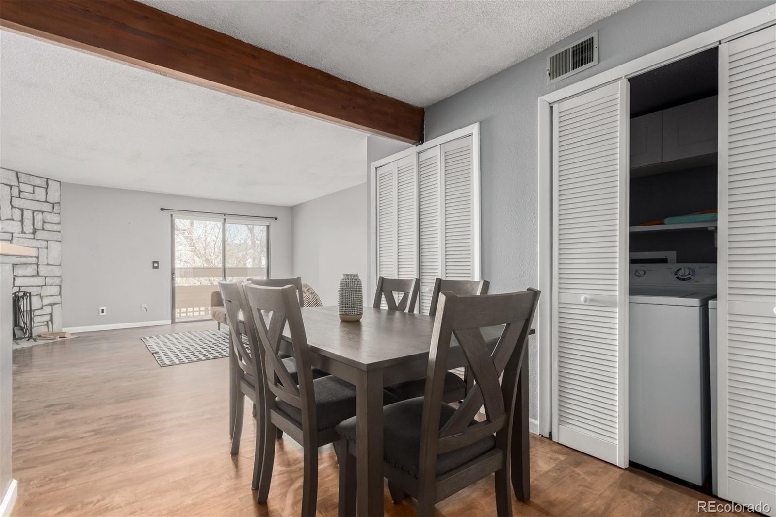 Welcome to Snowbird Condos! This spacious 2-bedroom, 2-bathroom second-floor unit offers incredible potential in one of Lakewood's quietest and most convenient neighborhoods. With generous square footage, a functional layout, and solid updates already completed, this home is ready for your finishing touches. Step inside to an open-concept living and dining area featuring hardwood floors, a cozy fireplace, and a full accent wall that adds character and warmth. The sliding glass door leads to a private covered balcony, perfect for morning coffee, fresh air, or unwinding after a long day while overlooking mature trees. The kitchen features white cabinetry, butcher-block countertops, stainless steel refrigerator, dishwasher, and a modern range hood. With plenty of storage and an easy flow into the dining area, it’s a great space whether you're cooking at home or entertaining. The primary bedroom is oversized with an attached bathroom and large custom closet, while the second bedroom makes an ideal guest room, office, or roommate setup. Both bathrooms offer ample counter space and storage. Additional highlights include: • In-unit laundry • Reserved parking • Quiet, well-kept community • Close to parks, walking paths, shopping, and commuter routes Whether you're a first-time buyer, investor, or someone looking to customize a space to your style, this Snowbird condo offers value, versatility, and a wonderful location. Don’t miss this opportunity!