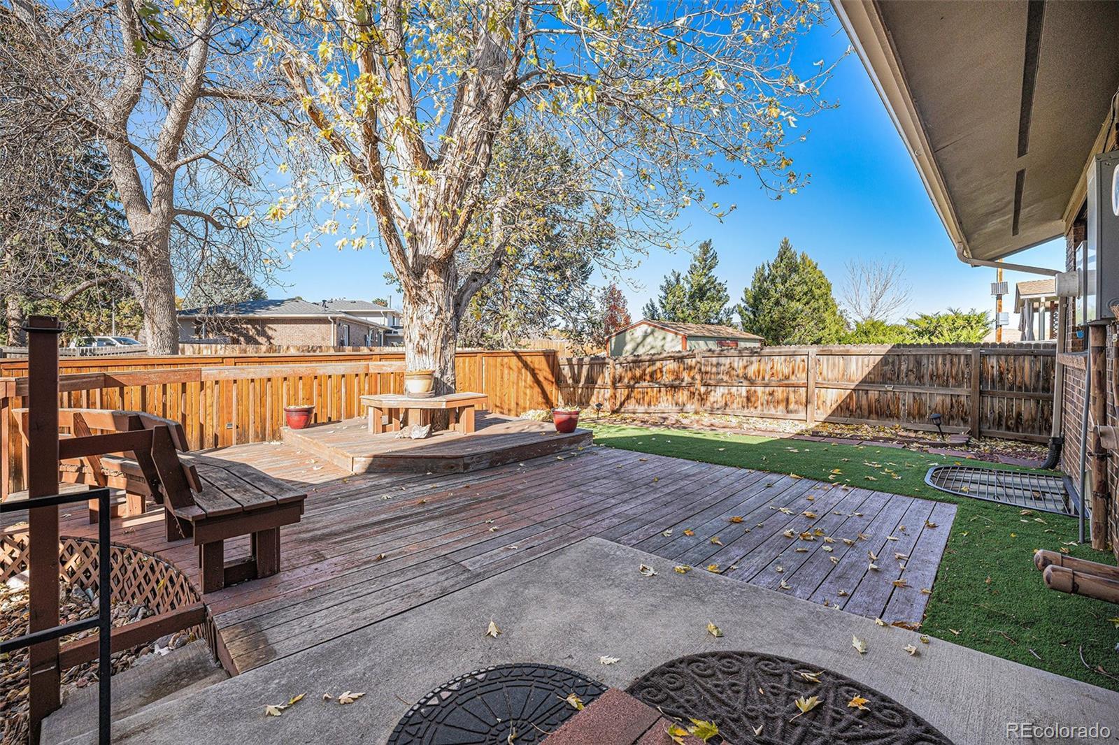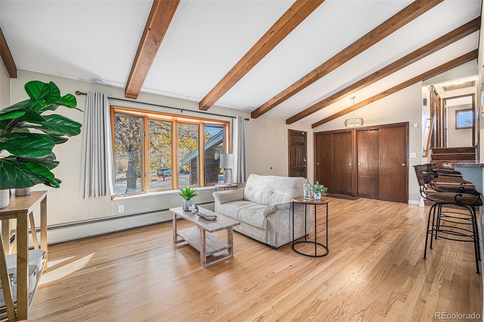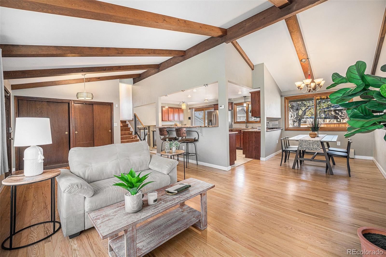 Welcome to this beautiful Lakewood home offering a bright, open layout that’s perfect for everyday living and entertaining. The kitchen features granite countertops, stainless steel appliances, and a large open pass-through window to the living room, creating a connected and welcoming feel. The living room is accented by exposed wood beams, adding character and architectural appeal. The dining room sits just off the kitchen—ideal for daily meals and easy flow. Red oak floors lend a classic, timeless touch throughout much of the home. The lower level includes a comfortable family room with a fireplace and wet bar, plus a half bath and laundry area, while the finished basement offers additional living space with built-in shelving and a ¾ bath. Upstairs you’ll find three bedrooms, including a primary suite with a walk-in closet and private ¾ bath. The fenced backyard features a spacious deck, pergola, and plenty of room to relax or entertain. Notable updates include a replacement sewer line this year, low-maintenance James Hardie siding, an updated electrical panel designed to support an EV charger or spa, LeafFilter Gutter Protection gutter covers, owned solar panels, and a Vivint security system. With energy-efficient features, a two-car garage, and a prime location near Addenbrooke Park, Belmar shops, restaurants, and highway access, this home is ready to enjoy.