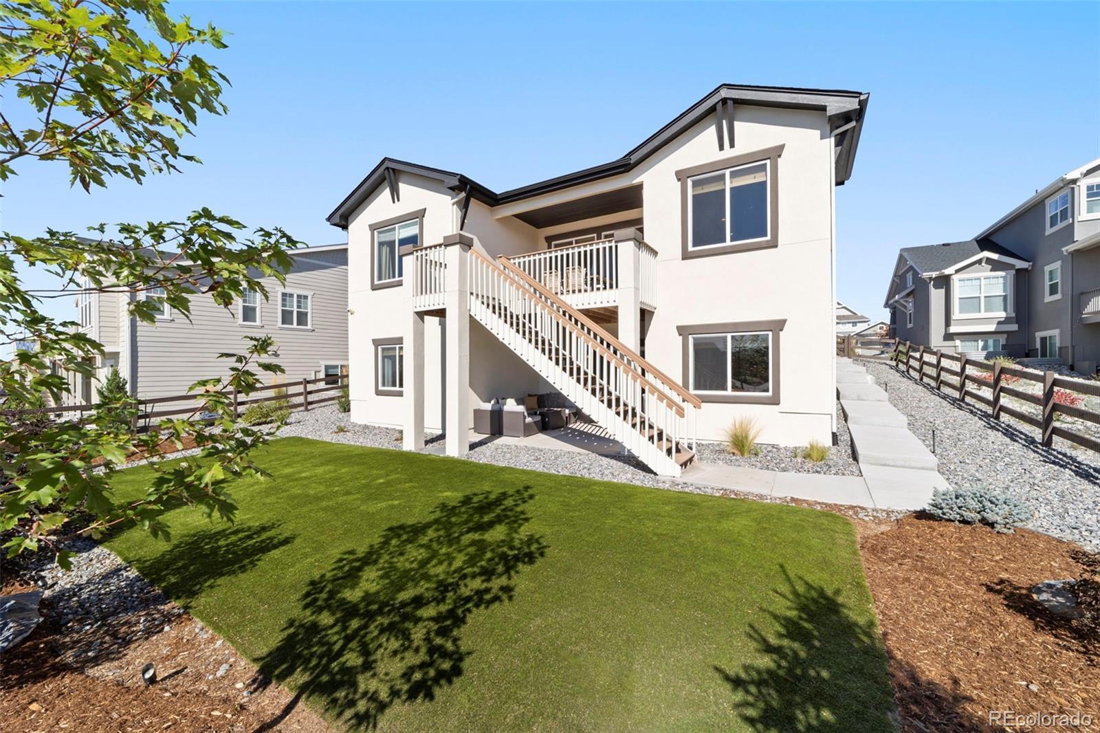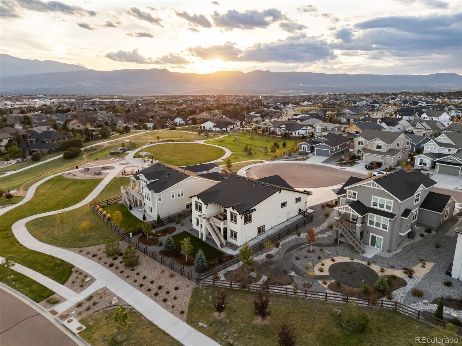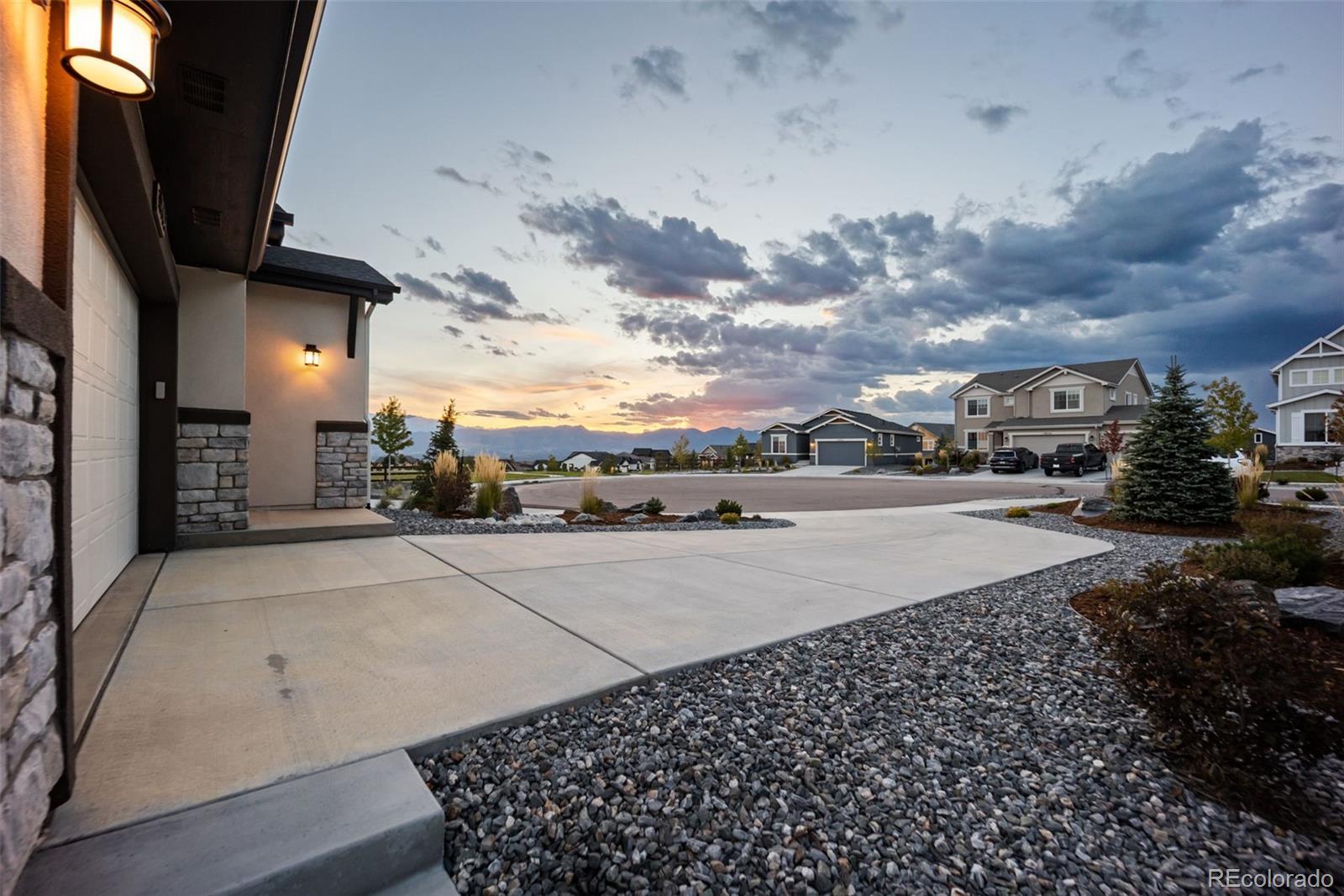 This stunning ranch-style home is nestled in the desirable Cordera community, steps from parks & schools. Thoughtfully designed with timeless style & cozy sophistication, this home combines modern comfort with classic touches that feel straight out of a magazine. Set on a cul-de-sac boasting expansive Pikes Peak views from the front porch, the home flows seamlessly from the main living areas to the outdoors, ideal for entertaining or simply enjoying the serene landscape. Inside, the open-concept layout provides a spacious, light-filled atmosphere w/high ceilings & large windows showcasing our beautiful Colorado weather, while the gourmet kitchen, & dining area invite a relaxed, yet refined lifestyle. The main floor offers luxurious finishes, including hardwood floors, gorgeous beams, upgraded lighting, & a cozy fireplace in the great room. Those chilly Colorado days are perfect in this home w/3 fireplaces (1 negotiable), you also have a large walk-out upper deck & walk-out lower covered patio to a wonderful low-maintenance backyard w/luxury turf, landscape lighting, & a fully fenced yard. This home also has 2 Primary bedrooms each w/ensuite baths & walk-in closets, w/a massive lower family room! Upgraded barn doors in the main level office & Primary bath are beautiful touches! Cordera’s family-friendly environment & top-rated schools, combined with the tranquility of a cul-de-sac location, breathtaking mountain views, make this home an ideal choice for those seeking both serenity & convenience. Exploring nearby parks, taking advantage of the Club House w/pool, playground or other amenities, or possibly grabbing an outdoor concert on the community greens w/friends & neighbors, this home offers a lifestyle that's hard to beat. Literally steps to the elementary/middle school, Powers corridor for shopping, restaurants, entertainment, plus many hiking/biking trails out your backdoor...this is not a house...it's a home. Come take a peek...