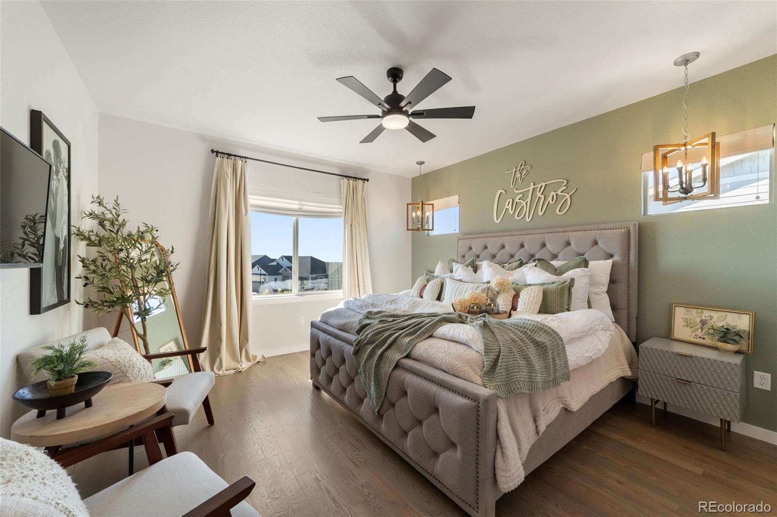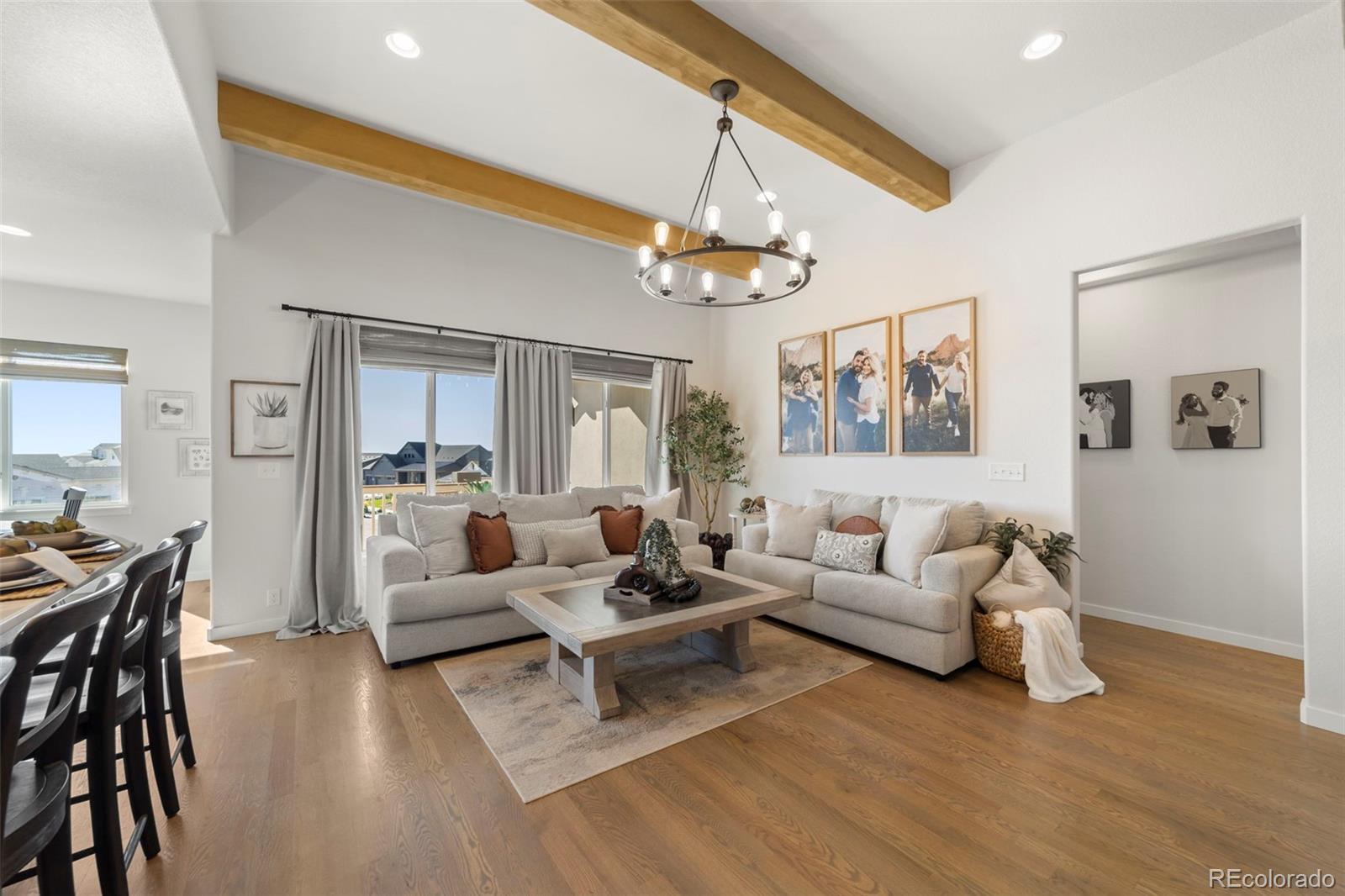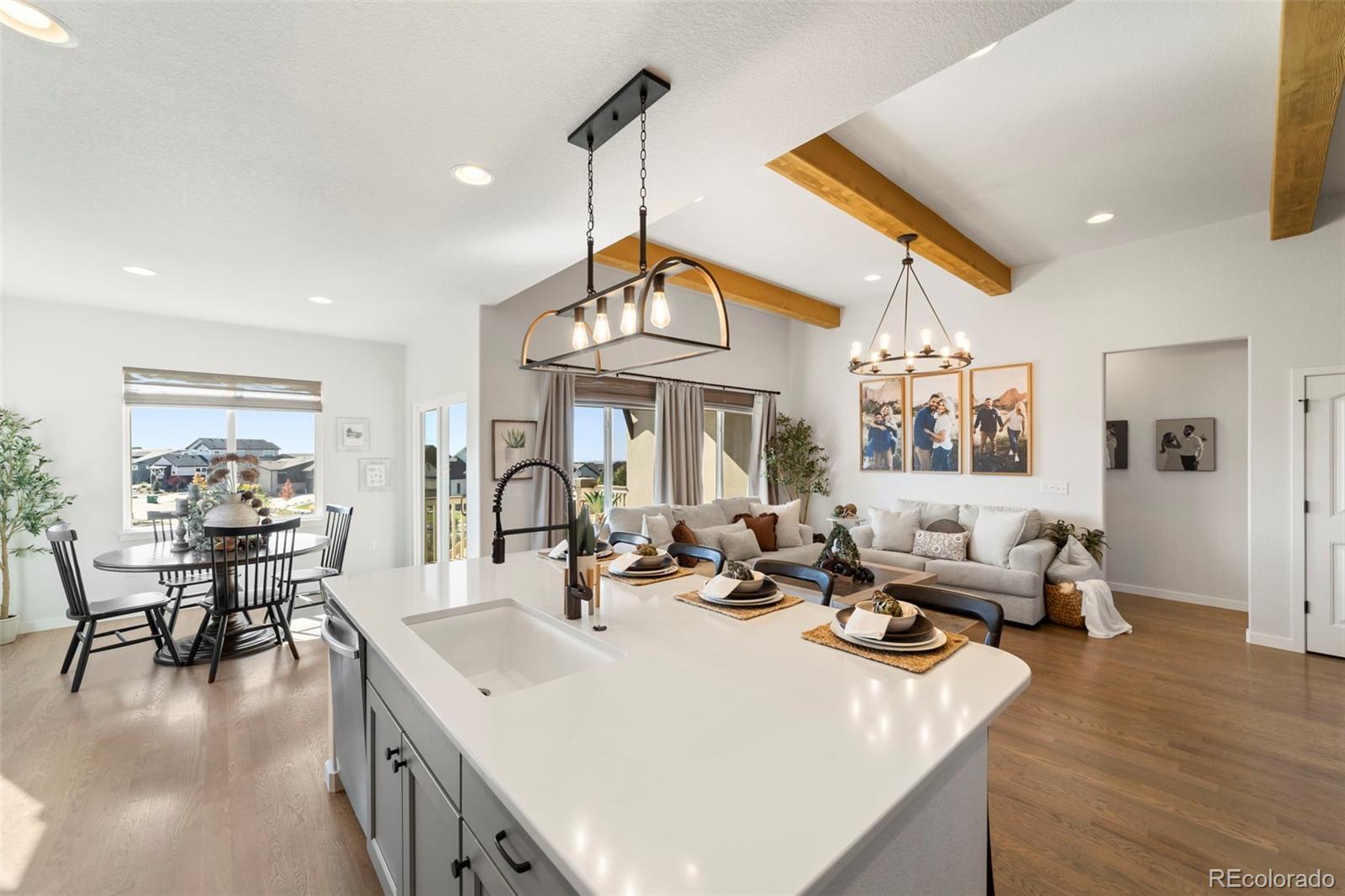 This stunning ranch-style home is nestled in the desirable Cordera community, steps from parks & schools. Thoughtfully designed with timeless style & cozy sophistication, this home combines modern comfort with classic touches that feel straight out of a magazine. Set on a cul-de-sac boasting expansive Pikes Peak views from the front porch, the home flows seamlessly from the main living areas to the outdoors, ideal for entertaining or simply enjoying the serene landscape. Inside, the open-concept layout provides a spacious, light-filled atmosphere w/high ceilings & large windows showcasing our beautiful Colorado weather, while the gourmet kitchen, & dining area invite a relaxed, yet refined lifestyle. The main floor offers luxurious finishes, including hardwood floors, gorgeous beams, upgraded lighting, & a cozy fireplace in the great room. Those chilly Colorado days are perfect in this home w/3 fireplaces (1 negotiable), you also have a large walk-out upper deck & walk-out lower covered patio to a wonderful low-maintenance backyard w/luxury turf, landscape lighting, & a fully fenced yard. This home also has 2 Primary bedrooms each w/ensuite baths & walk-in closets, w/a massive lower family room! Upgraded barn doors in the main level office & Primary bath are beautiful touches! Cordera’s family-friendly environment & top-rated schools, combined with the tranquility of a cul-de-sac location, breathtaking mountain views, make this home an ideal choice for those seeking both serenity & convenience. Exploring nearby parks, taking advantage of the Club House w/pool, playground or other amenities, or possibly grabbing an outdoor concert on the community greens w/friends & neighbors, this home offers a lifestyle that's hard to beat. Literally steps to the elementary/middle school, Powers corridor for shopping, restaurants, entertainment, plus many hiking/biking trails out your backdoor...this is not a house...it's a home. Come take a peek...