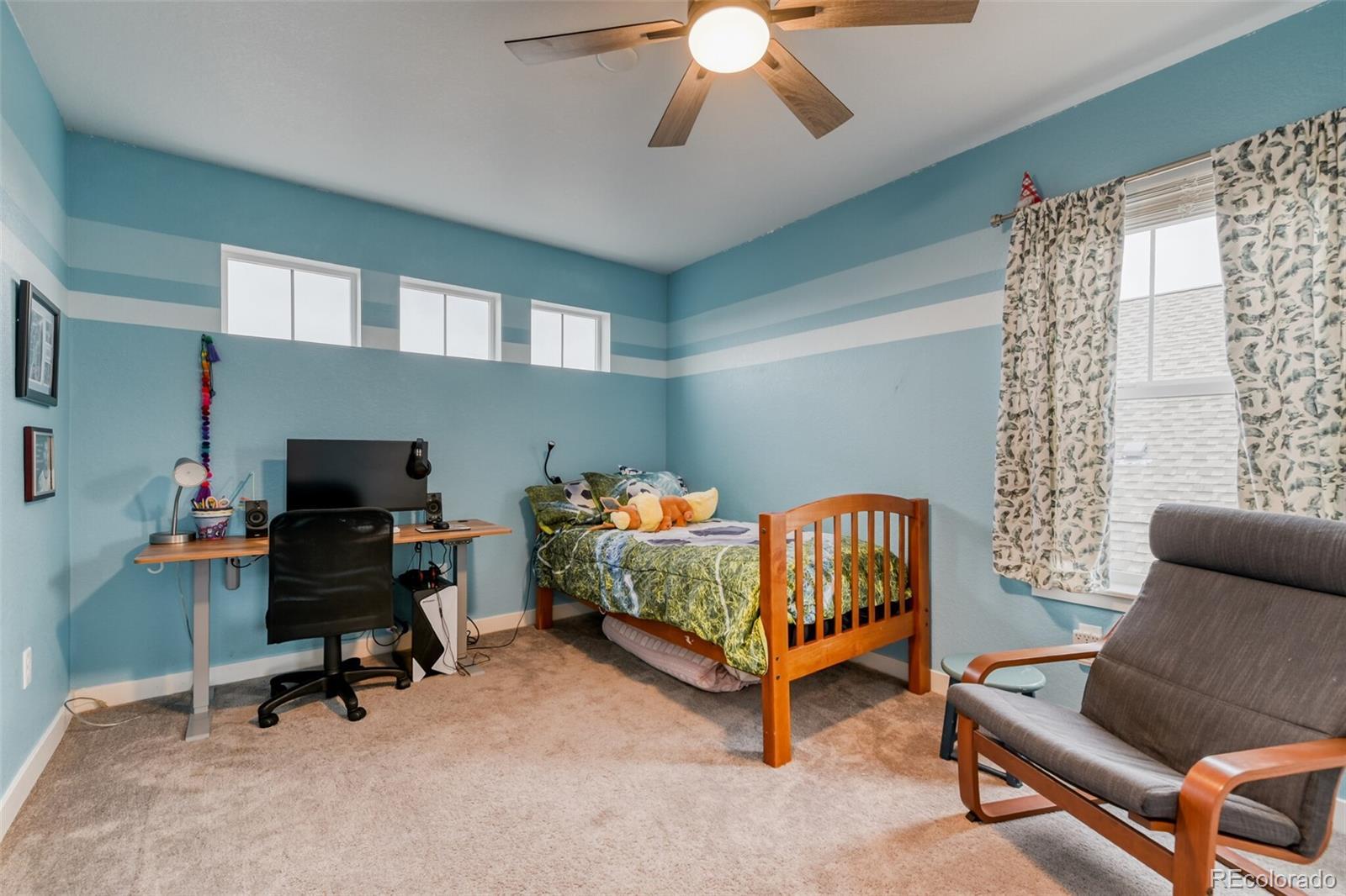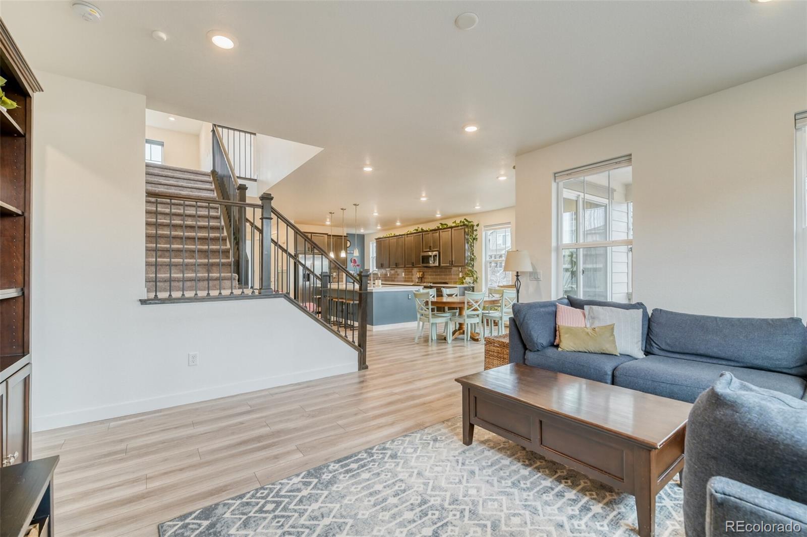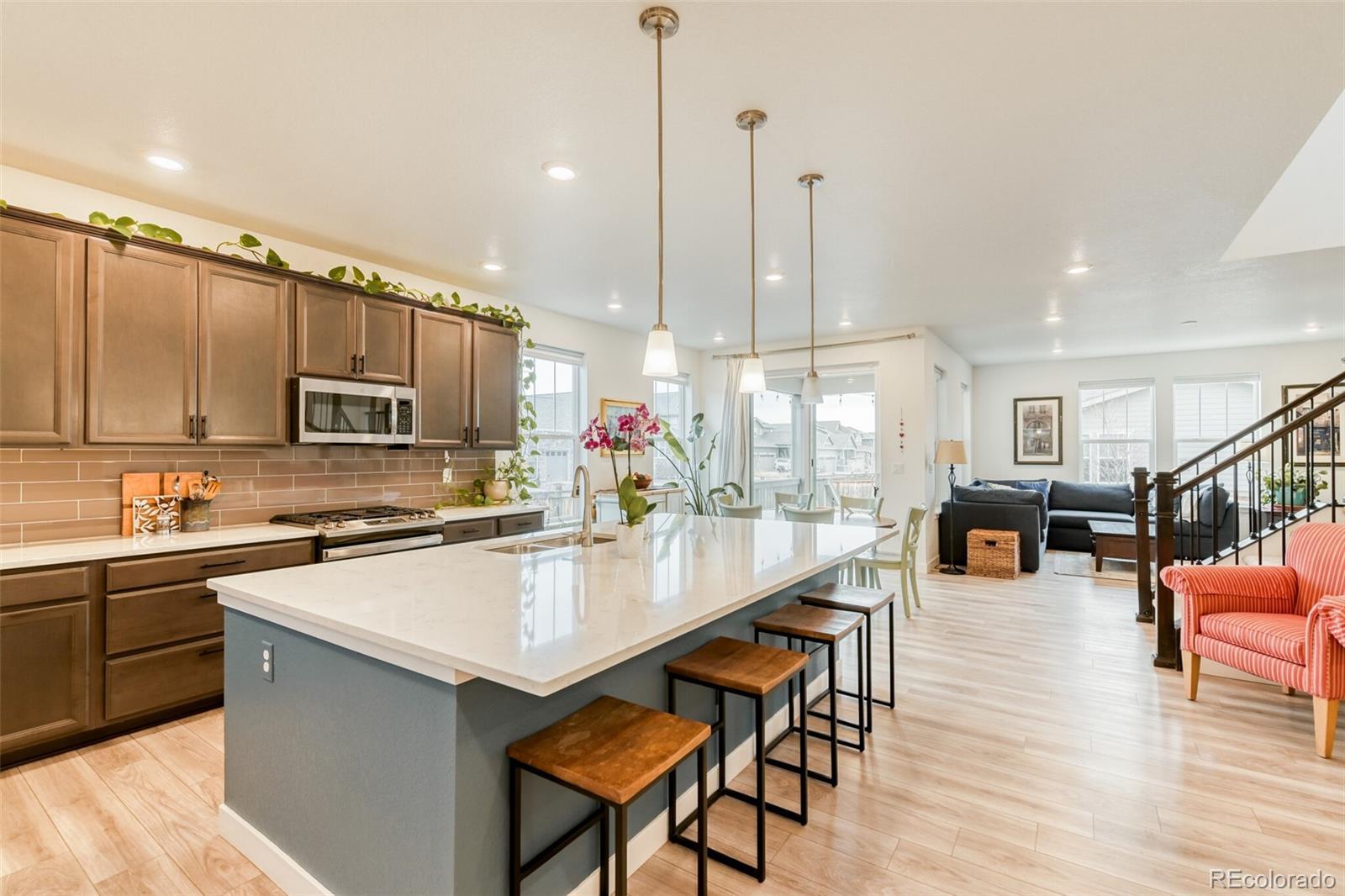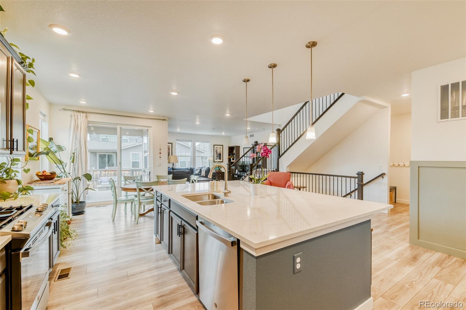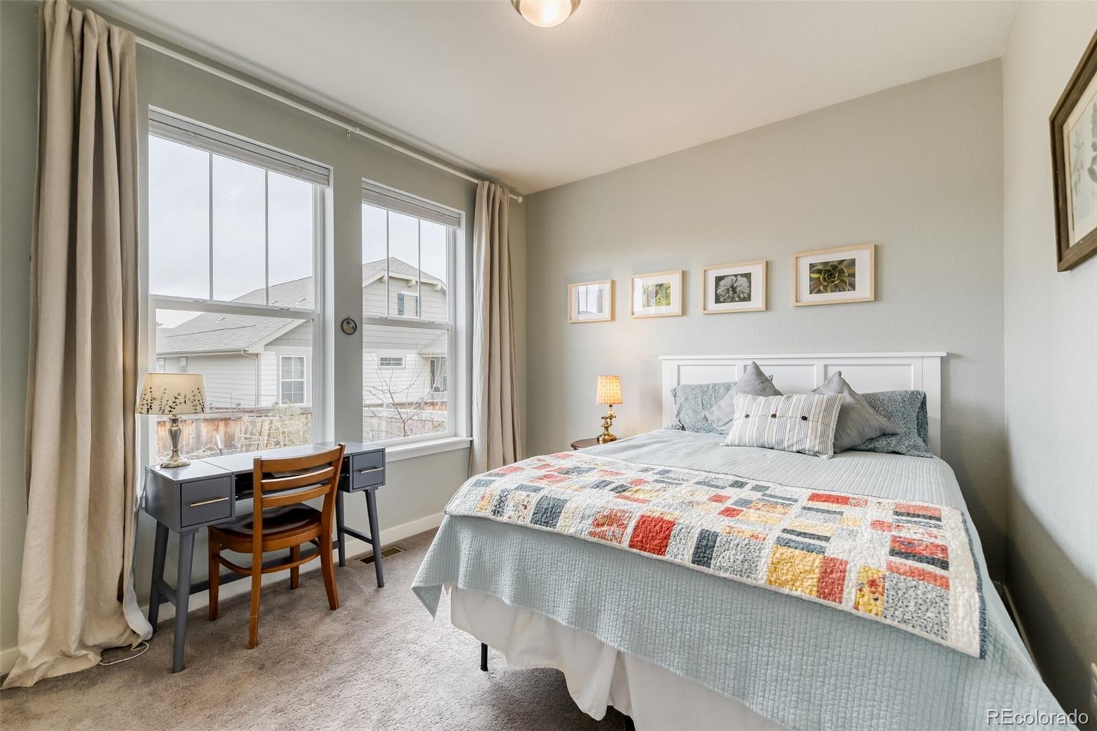 Here is the perfectly wonderful family home. This is the trifecta of living: Beautiful home, perfect outdoor garden, and optimal location. This lovely home is graciously appointed with gorgeous floors, wainscoting, quartz countertops, stainless appliances and many superior appointments. The home design is open with plenty of room for everyone and everything: living room, dining room, large kitchen with huge island, office, main floor bedroom, main floor full bath, upstairs laundry, primary bedroom with 5 piece en-suite bath and walk-in closet, total of 4 bedrooms, and full unfinished basement. The outside is an oasis, with covered back deck perfect for dining al fresco, raised beds for gardening, colorful plants and flowers, and the backyard has absolutely beautiful stone patio with built-in fire pit for parties, or evenings with a book, or conversations with friends. Palisade Park is a well-designed neighborhood with parks and trails, located near I25 and C470, and conveniently located near restaurants and shops. And you’re in the coveted Erie High School in St Vrain school district. This beautiful home is ready for Colorado living!