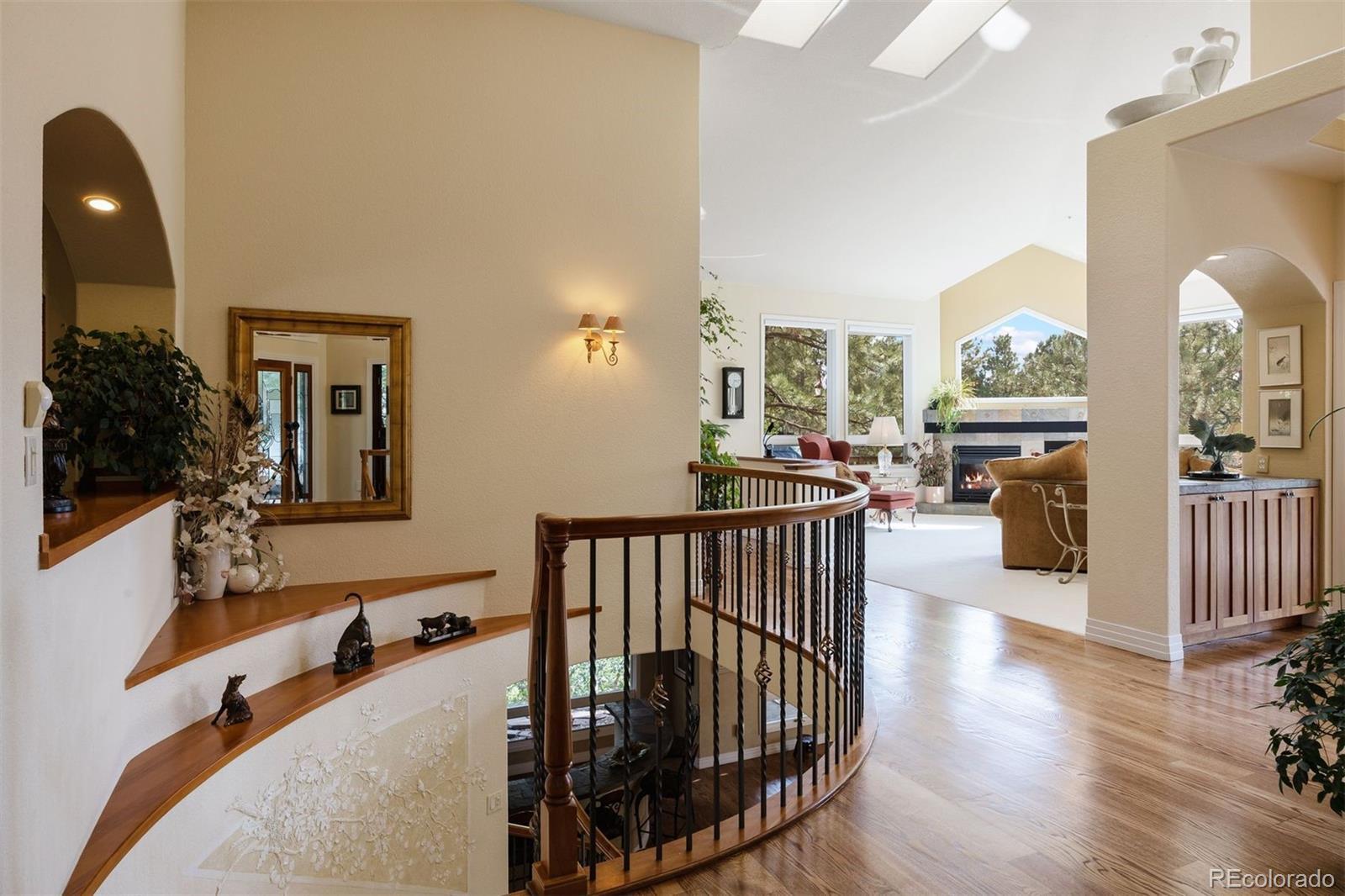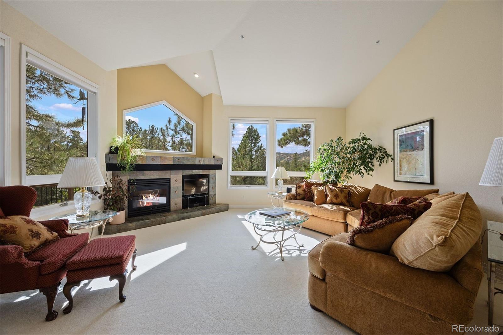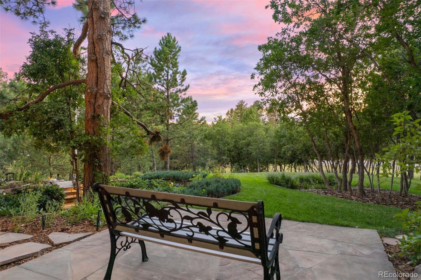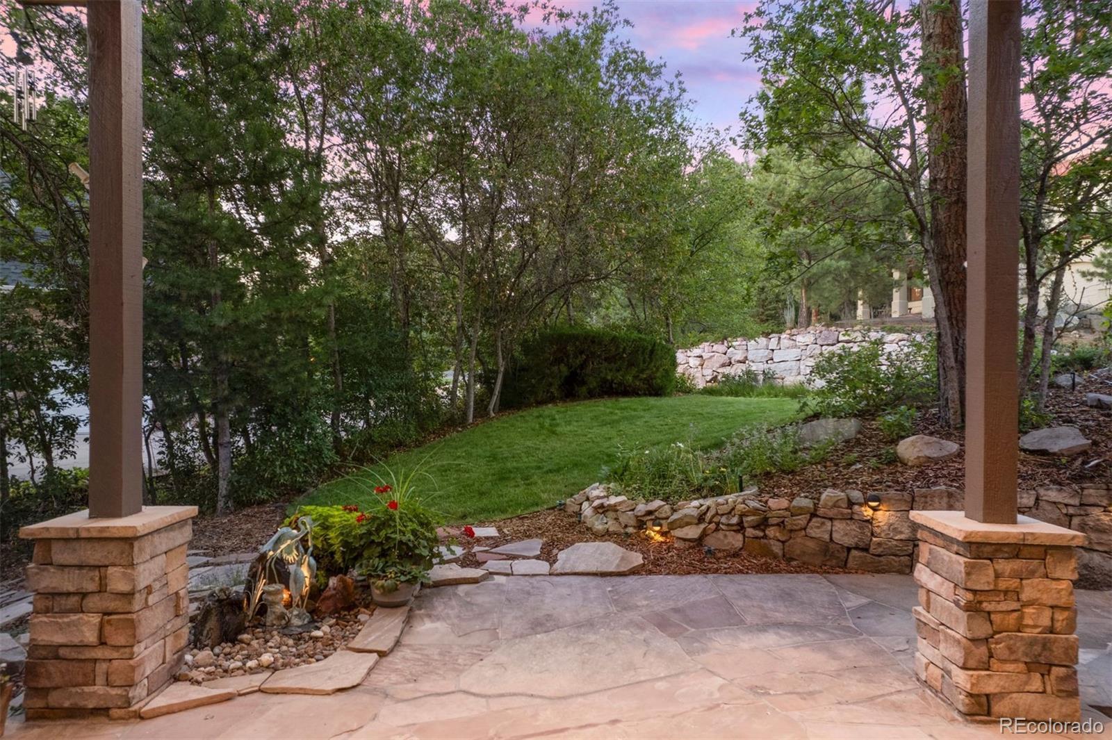 Surrounded by towering pines on a cul-de-sac, this home in The Village Castle Pines offers a beautiful blend of privacy, comfort, and nature. A flagstone walkway and front water feature welcome you to a richly detailed interior with a paneled library, formal dining room, and a gourmet kitchen with granite counters, double ovens, and an eat-in nook opening to a wraparound Trex deck. From here, enjoy mountain vistas, wildlife, and sunsets while relaxing or entertaining. The main-level primary suite is a retreat with its own deck, a two-sided fireplace, updated spa-like bath, and custom closet. The walkout lower level features a wet bar, stone fireplace, and access to multiple flagstone patios in the storybook landscaped backyard. Two lower level, en suite bedrooms and abundant storage complete the space. Recently refreshed with new flooring, updated baths, and modernized systems, this home combines timeless style, peace of mind, and extraordinary outdoor living.