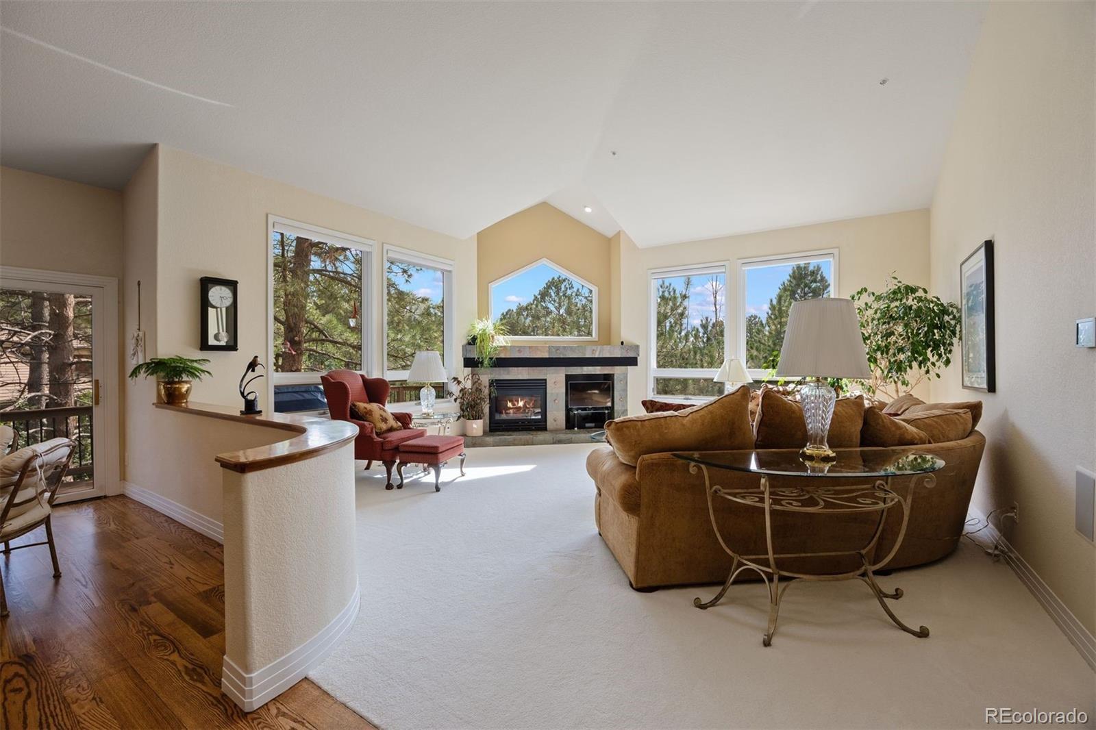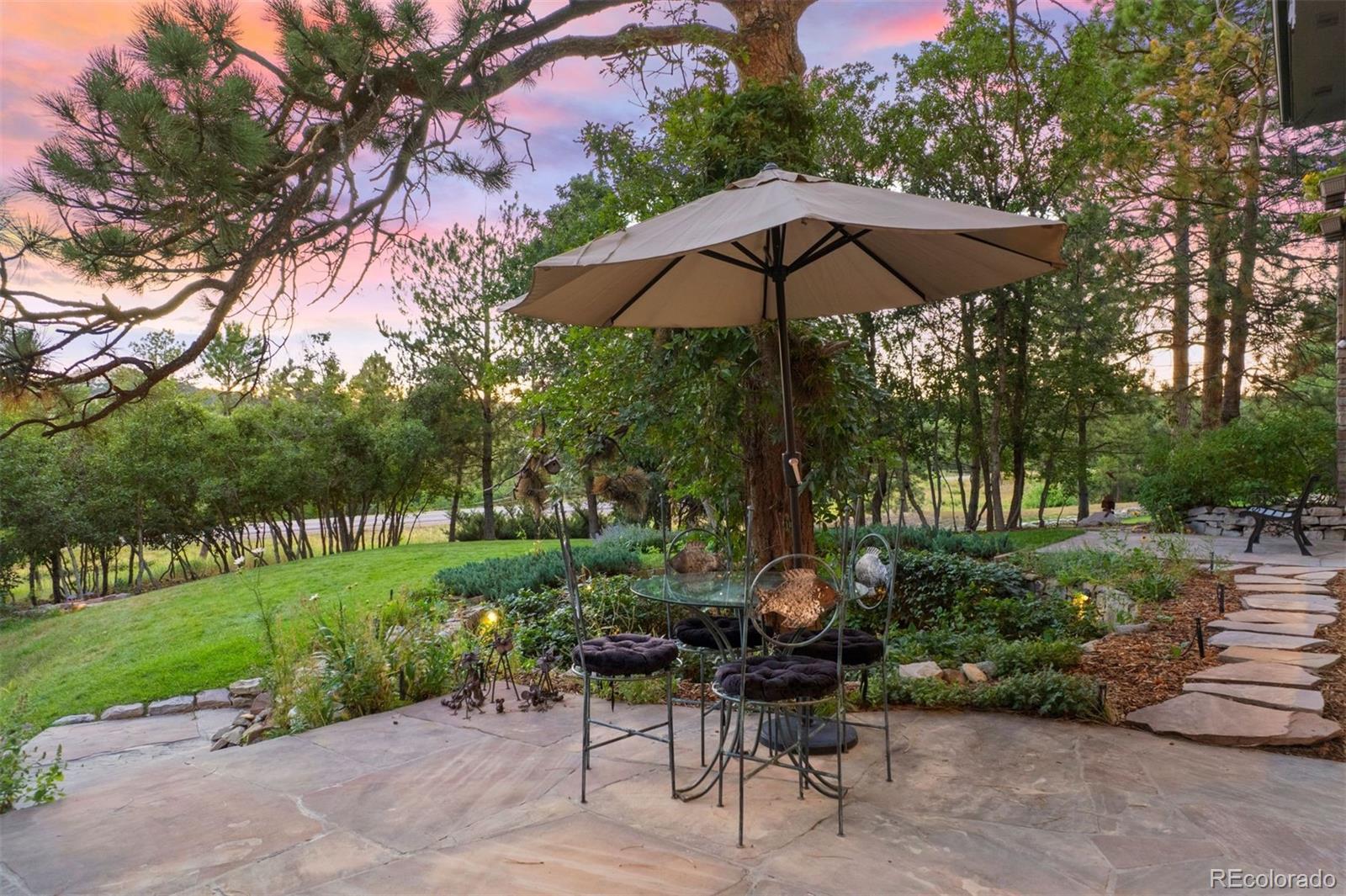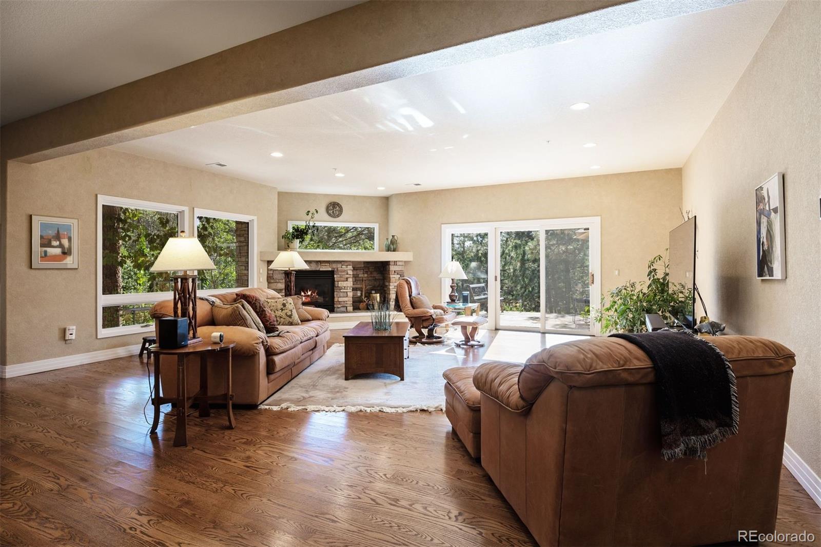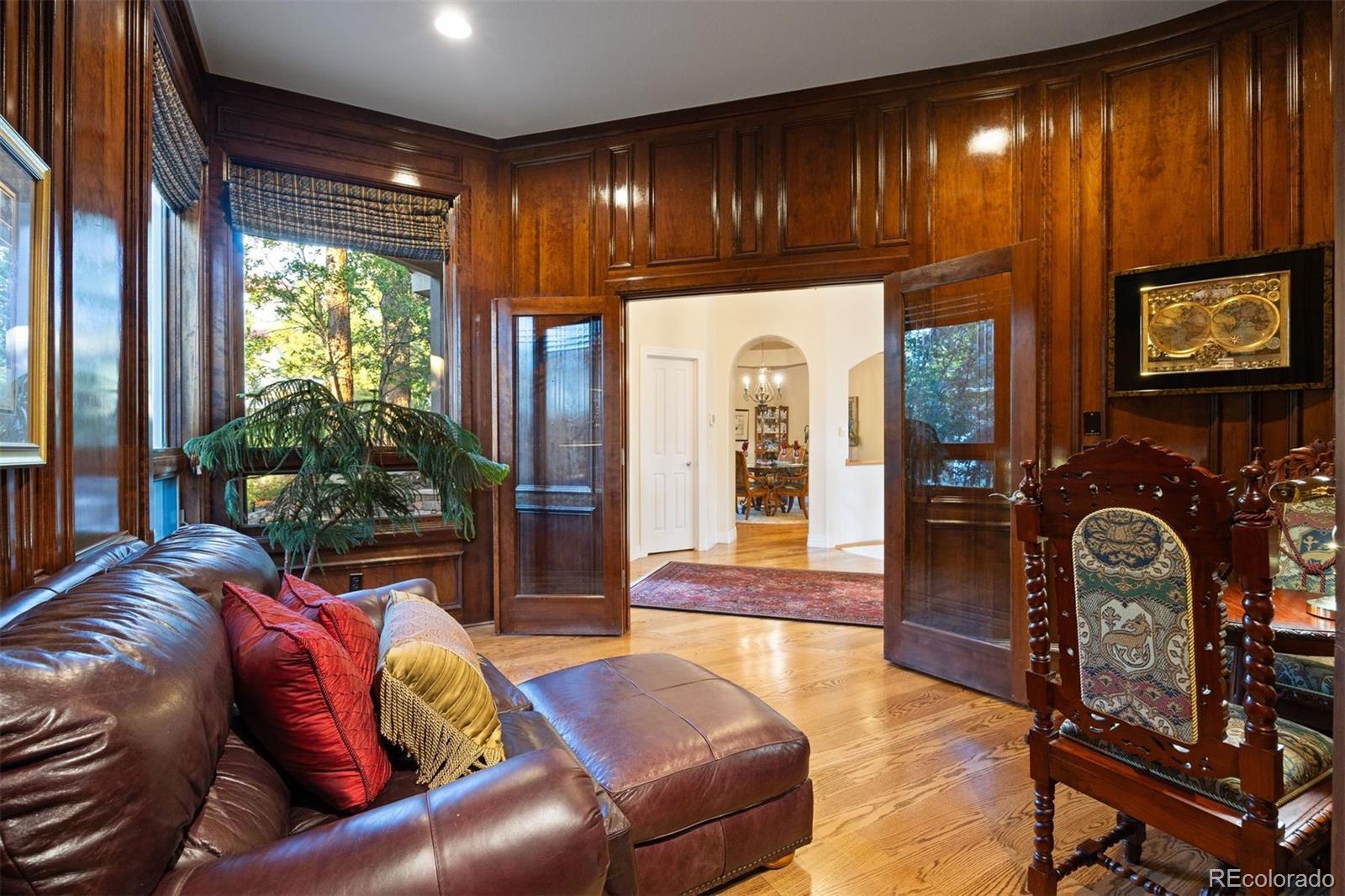 Surrounded by towering pines on a cul-de-sac, this home in The Village Castle Pines offers a beautiful blend of privacy, comfort, and nature. A flagstone walkway and front water feature welcome you to a richly detailed interior with a paneled library, formal dining room, and a gourmet kitchen with granite counters, double ovens, and an eat-in nook opening to a wraparound Trex deck. From here, enjoy mountain vistas, wildlife, and sunsets while relaxing or entertaining. The main-level primary suite is a retreat with its own deck, a two-sided fireplace, updated spa-like bath, and custom closet. The walkout lower level features a wet bar, stone fireplace, and access to multiple flagstone patios in the storybook landscaped backyard. Two lower level, en suite bedrooms and abundant storage complete the space. Recently refreshed with new flooring, updated baths, and modernized systems, this home combines timeless style, peace of mind, and extraordinary outdoor living.