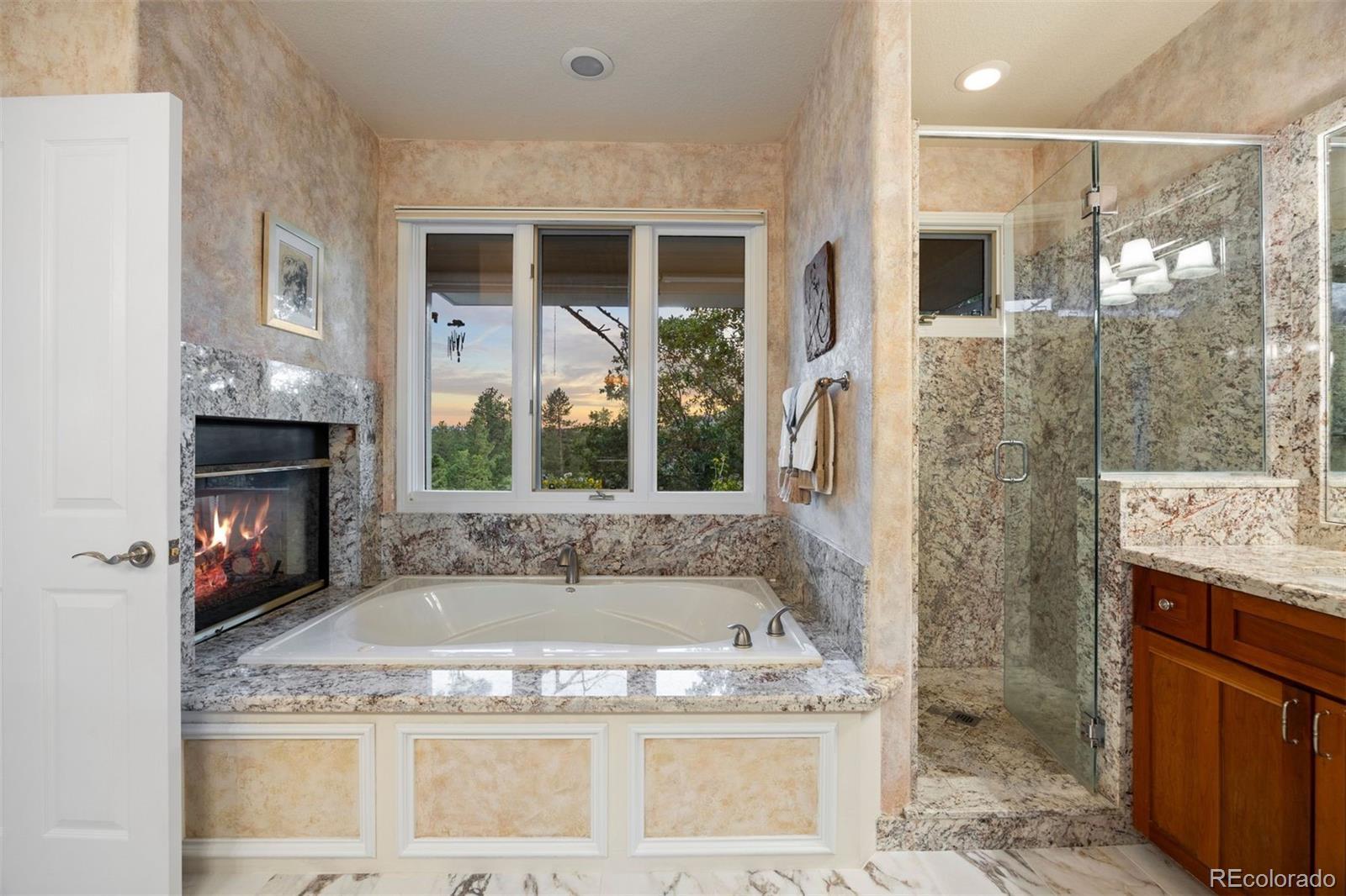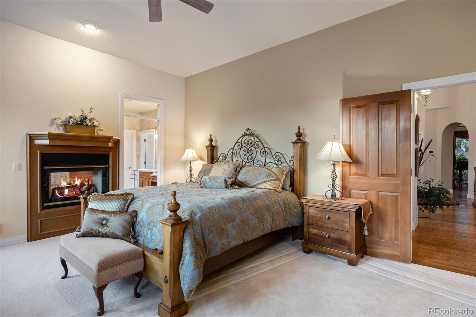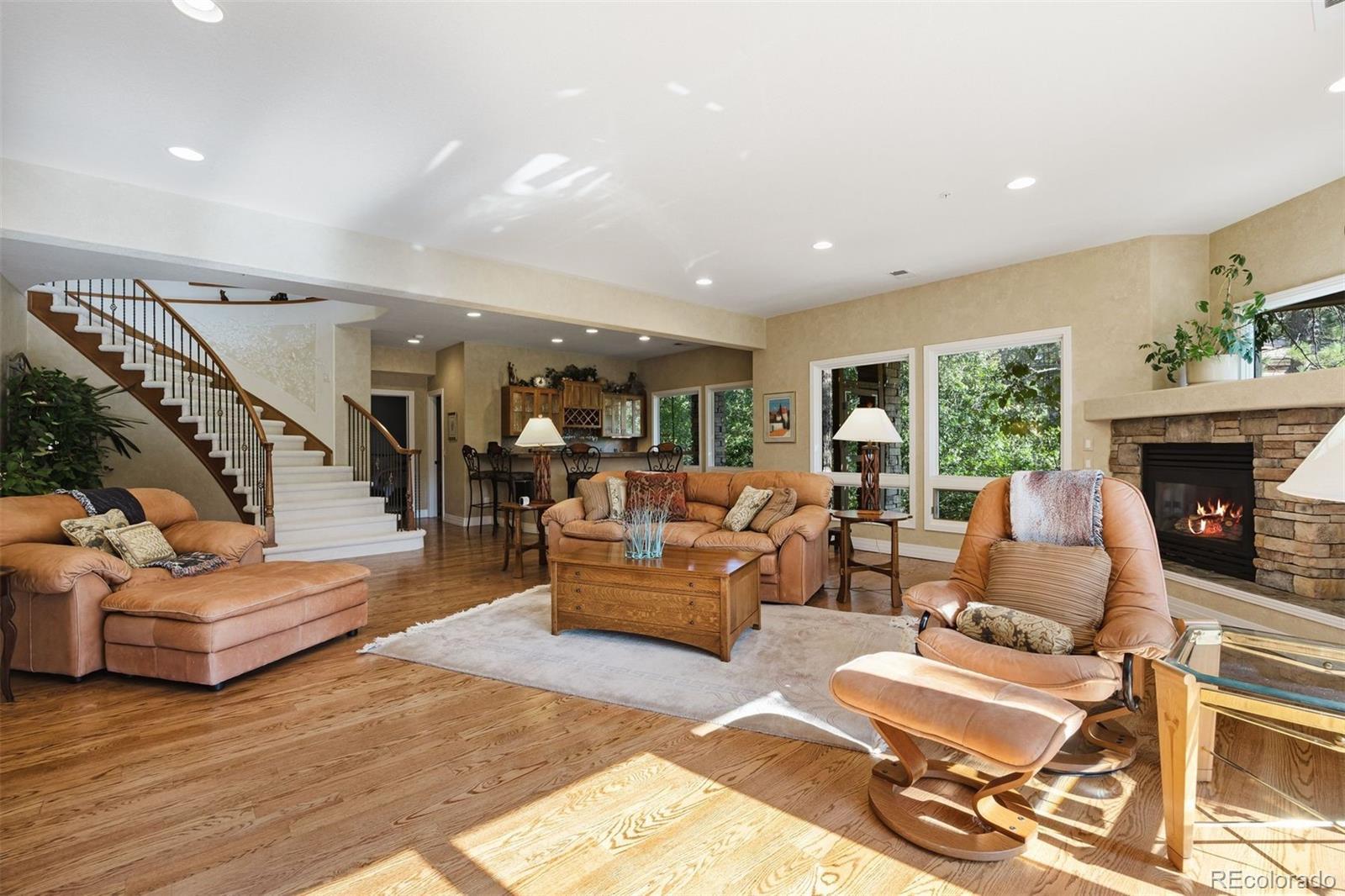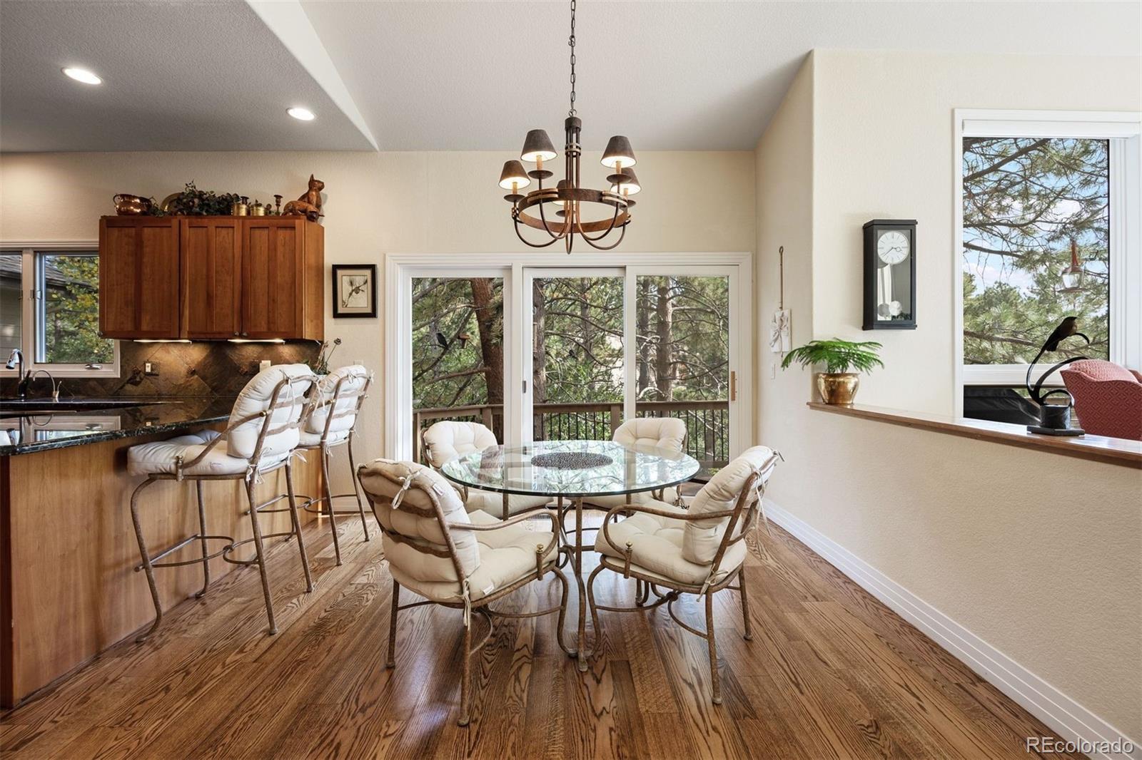 Surrounded by towering pines on a cul-de-sac, this home in The Village Castle Pines offers a beautiful blend of privacy, comfort, and nature. A flagstone walkway and front water feature welcome you to a richly detailed interior with a paneled library, formal dining room, and a gourmet kitchen with granite counters, double ovens, and an eat-in nook opening to a wraparound Trex deck. From here, enjoy mountain vistas, wildlife, and sunsets while relaxing or entertaining. The main-level primary suite is a retreat with its own deck, a two-sided fireplace, updated spa-like bath, and custom closet. The walkout lower level features a wet bar, stone fireplace, and access to multiple flagstone patios in the storybook landscaped backyard. Two lower level, en suite bedrooms and abundant storage complete the space. Recently refreshed with new flooring, updated baths, and modernized systems, this home combines timeless style, peace of mind, and extraordinary outdoor living.