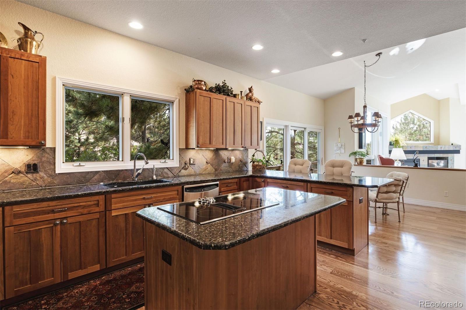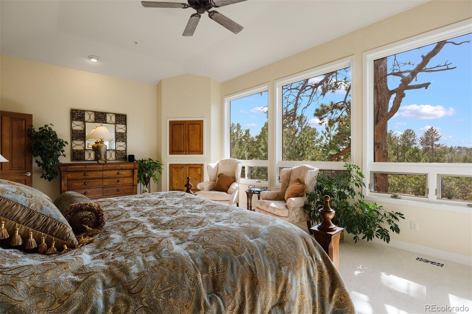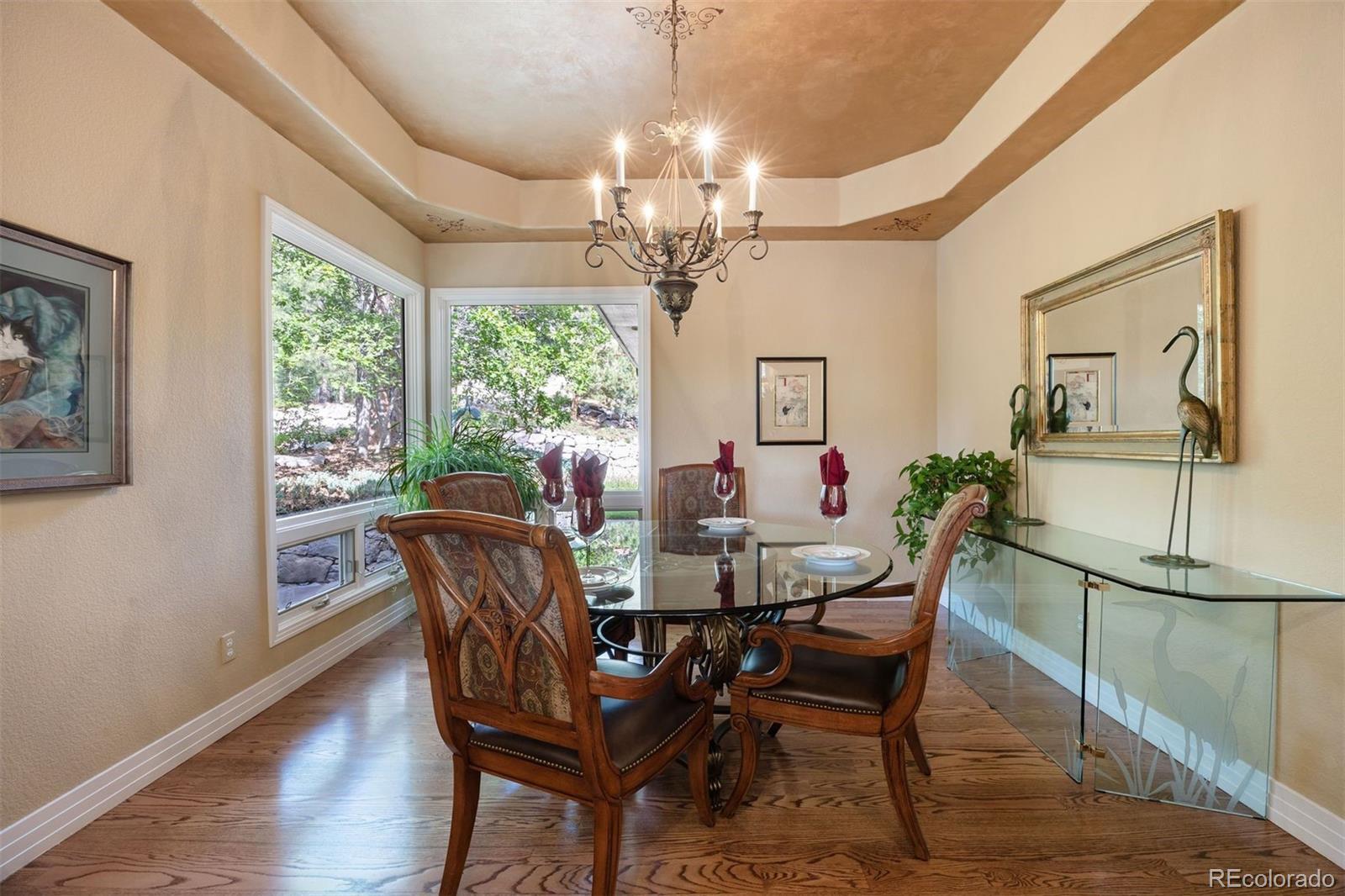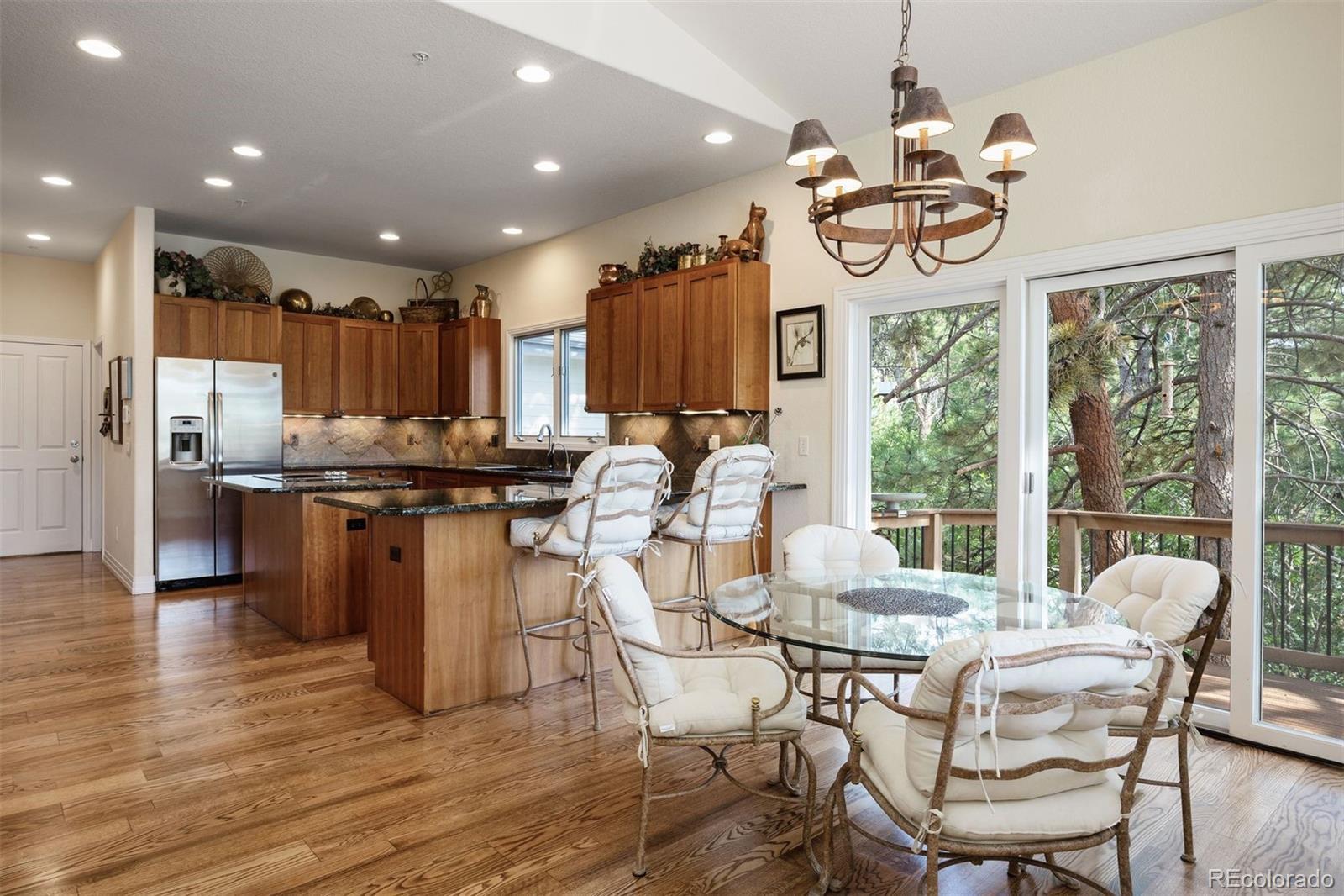 Surrounded by towering pines on a cul-de-sac, this home in The Village Castle Pines offers a beautiful blend of privacy, comfort, and nature. A flagstone walkway and front water feature welcome you to a richly detailed interior with a paneled library, formal dining room, and a gourmet kitchen with granite counters, double ovens, and an eat-in nook opening to a wraparound Trex deck. From here, enjoy mountain vistas, wildlife, and sunsets while relaxing or entertaining. The main-level primary suite is a retreat with its own deck, a two-sided fireplace, updated spa-like bath, and custom closet. The walkout lower level features a wet bar, stone fireplace, and access to multiple flagstone patios in the storybook landscaped backyard. Two lower level, en suite bedrooms and abundant storage complete the space. Recently refreshed with new flooring, updated baths, and modernized systems, this home combines timeless style, peace of mind, and extraordinary outdoor living.