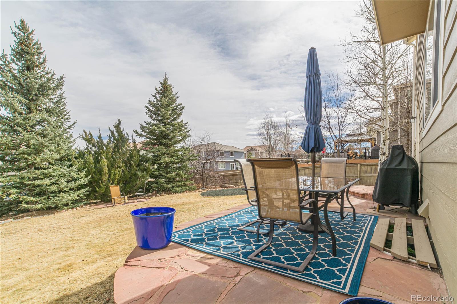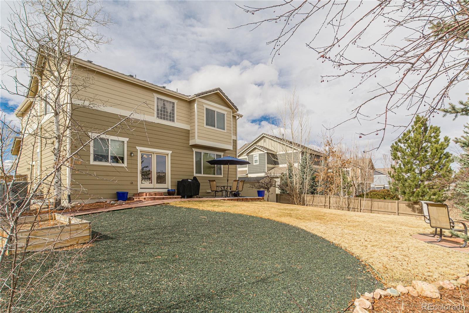Welcome to this Elegant two-story home nestled on a quiet cul-de-sac in Castlewood Ranch! This refined 4 bed, 4 bath residence features vaulted ceilings, designer paint, newer carpet and wood flooring, and a seamless blend of formal and casual living spaces. The gourmet kitchen boasts 42" cherry cabinets, granite countertops, travertine subway tile backsplash, and a built-in desk, opening to a warm and inviting family room with a beautiful gas fireplace. The upper level includes a spacious primary suite, with a luxurious five-peice bathroom featuring a large soaking tub and spacious walk-in closet. There are also two additional bedrooms, a full bath and a large versatile loft. The fully finished basement adds exceptional livability with a great bonus space with a custom built-in entertainment center, large bedroom, and full bath. Outdoor living shines with French doors leading to a lush backyard complete with sprinkler and drip system, plus a generous storage shed and fenced gravel side yard for secure storage or a large dog run. Additional highlights include a durable tile roof, west-facing driveway for natural snow melt, and built-in garage cabinetry. Ideally located within walking distance to Flagstone Elementary and Mesa Middle School, with easy access to parks, trails, shopping, dining, and I-25.