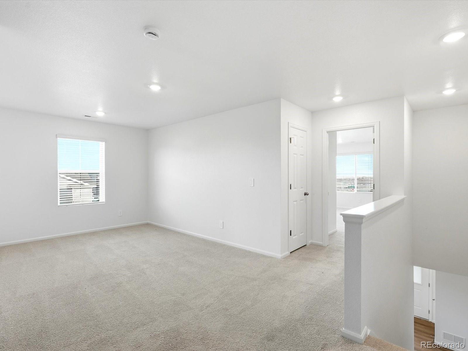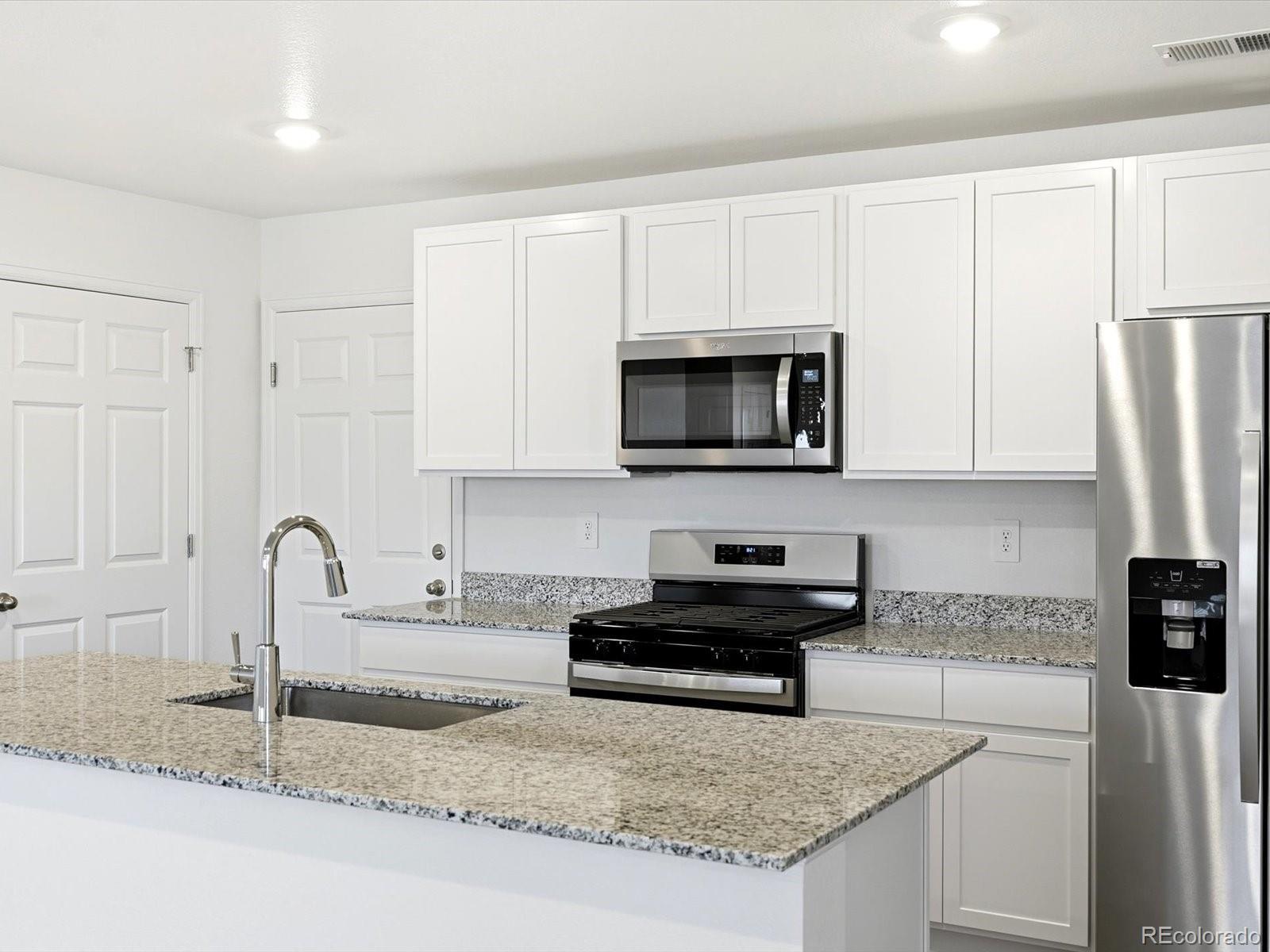 Open concept kitchen with granite countertops and white cabinets! The Copper is a stylish end-unit townhome featuring an open-concept main floor and a welcoming covered front porch. Upstairs offers a private primary suite with walk-in closet, plus two additional bedrooms and a versatile landing space. With 2.5 baths and a two-bay garage, this design blends comfort and functionality. The Meritage Home difference includes spray-foam insulation, advanced air filtration for year-round comfort and healthier air, and durable cementitious siding known for its strength, fire-resistance, and long-lasting performance. A Whirlpool appliance package, and full home blinds are also included for move-in convenience. Welcome home where every detail is built for comfort, efficiency, and LIFE. BUILT. BETTER. Skyview at High Point in Aurora offers a prime location just minutes from Denver International Airport and the Gaylord Rockies Resort. With easy access to E-470 and the light rail, plus nearby parks and open space, this community makes commuting simple and outdoor adventures convenient. *This home qualifies for special incentives through builder preferred lender for a limited time. Terms and conditions apply. See sales counselor for details!