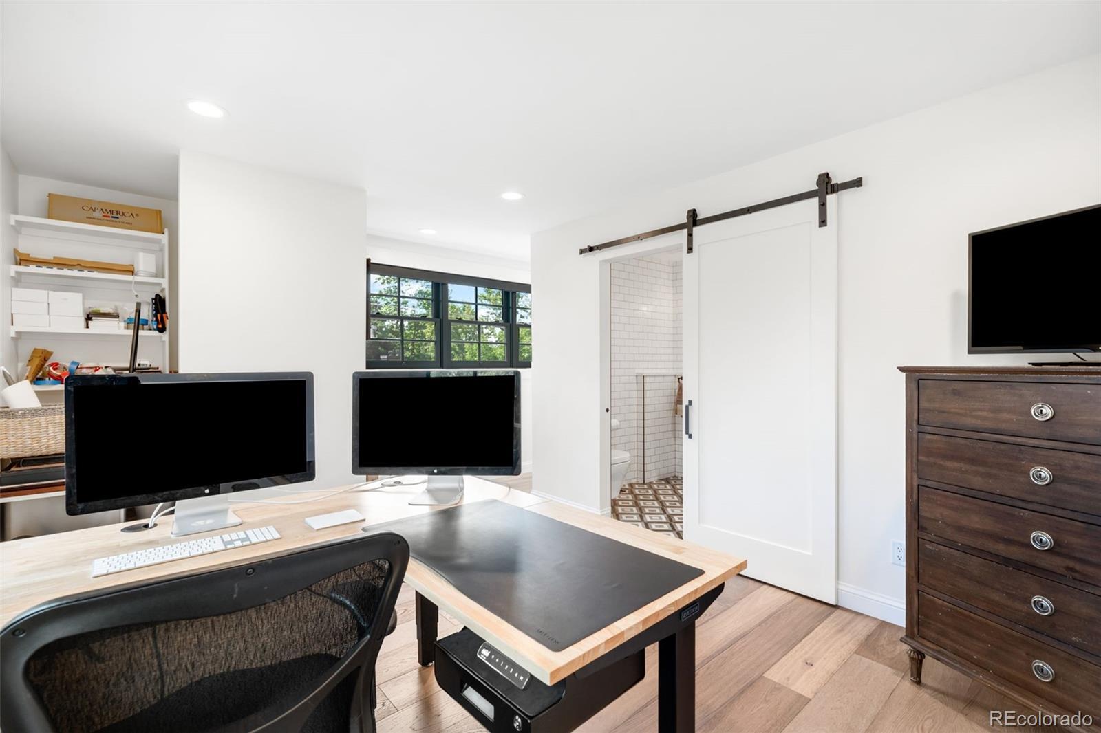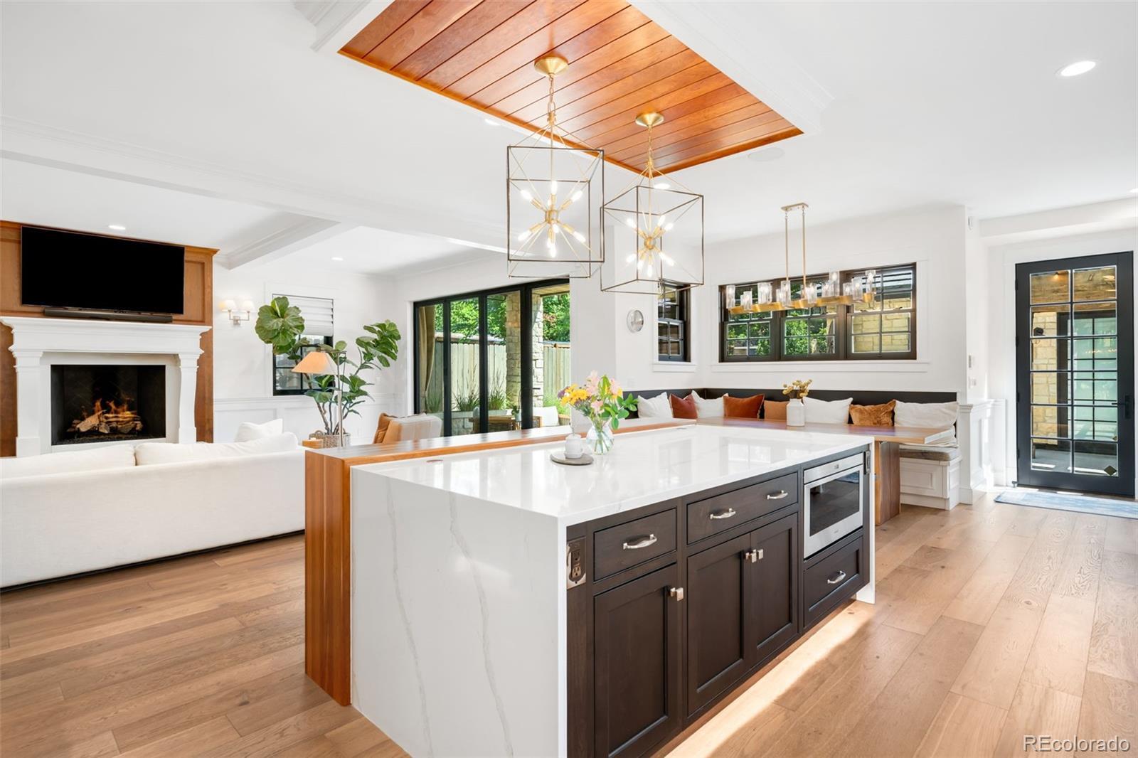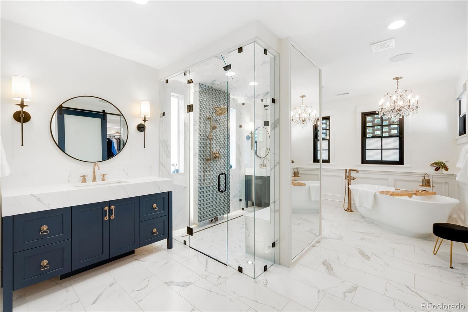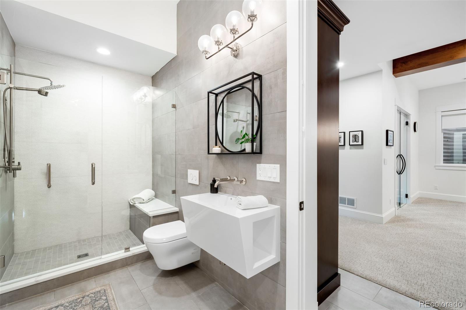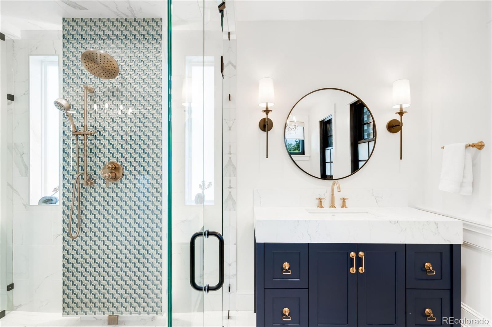Striking modern architecture meets elevated functionality in this East Wash Park stunner, designed for those who appreciate luxury, space, natural light, and architectural detail. Situated on a prominent corner lot just blocks from South Gaylord Street, this limestone residence blends architectural presence with refined modern living. Spanning over 6,000 square feet, the home is defined by dramatic lines, custom craftsmanship, and walls of glass that dissolve the boundary between indoors and out. The main level showcases 10-foot coffered ceilings, a statement floating staircase, and seamless indoor-outdoor flow to a covered patio with overhead heating and built-in gas fireplace. The kitchen features Sub-Zero and Wolf appliances, dual quartz islands, and thoughtful custom cabinetry. Upstairs, four bedrooms include a serene primary suite with steam shower, soaking tub, walk-in closet, and built-in morning bar. A third-floor flex suite with full bath opens to a west-facing rooftop deck with skyline views—ideal for guests, au-pair, home office, gym or party room. Downstairs, 11-foot ceilings elevate the fully finished basement, which offers a large recreation room, wet bar, gym, guest bedroom, and full bathroom. Originally completed in 2021 by respected local luxury builder Cline Design Group, the home has since been elevated with over $200,000 in upgrades including bespoke window coverings throughout, a fully integrated AV and Control4 smart-home system, and a Culligan whole-house water filtration system with reverse osmosis. 240V outlet in the oversized garage provides EV charging capabilities. Every detail, such as the full limestone exterior facade and cement tile roof, speaks to quality and intention, offering a residence that balances timeless design with contemporary sophistication in one of Denver’s most established neighborhoods.