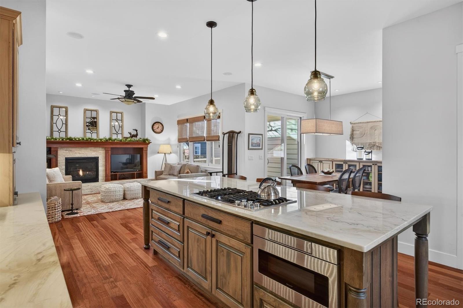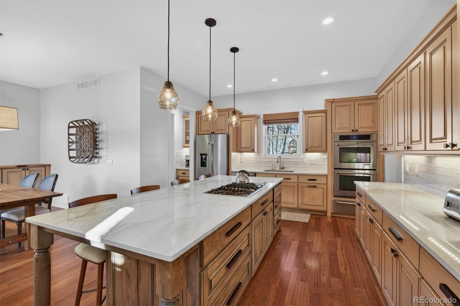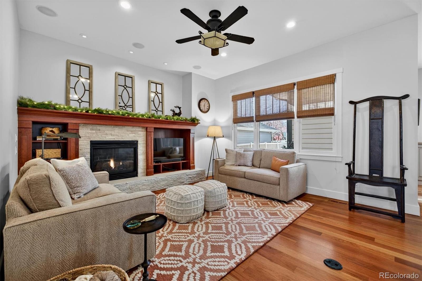 Pride of ownership is evident throughout this meticulously maintained Craftsman-style residence, ideally situated on a corner lot fronting a serene community park in sought-after Bradburn Village, just 20 minutes southeast of Boulder. Bradburn is known for its walkable shops, dining, neighborhood events, and resort-style amenities, including trails, a pool, and tennis courts. Offering over 5,300 finished square feet, this home includes a private two-bedroom, one-bath carriage house with its own exterior entrance, ideal for extended family, guests, multigenerational living, or long-term rental potential. A wraparound front porch creates a welcoming first impression. A newly installed cedar fence (2025) encloses the private backyard, featuring a built-in fire pit, a refreshed paver patio, and a discreetly integrated dog run. // The interior features soaring ceilings, refinished hardwood floors (2024), designer lighting, and crisp baseboard detailing throughout. The remodeled chef’s kitchen features custom Shaker cabinetry, stainless steel appliances, and a quartzite island that opens seamlessly to the living and dining areas for effortless entertaining. The living room features a gas fireplace with a natural stone surround. A formal dining room and main-floor office (or optional bedroom) complete the main level. // Upstairs, the reimagined primary suite offers a spa-inspired bath with Carrara marble, soaking tub, walk-in shower, and a generous walk-in closet with private access to the carriage house. Two additional bedrooms, a full bath, loft, and upper-level laundry provide functional and flexible living space. // The finished basement includes a bedroom, bathroom, recreation room, den, and custom bar, ideal for sports enthusiasts, entertaining, or relaxing. // Additional upgrades include: new furnace (2025), new roof (2024), new dryer (2025), poly-aspartic garage floor coating (2025), newer windows, newer carpet, and newer water heater.
