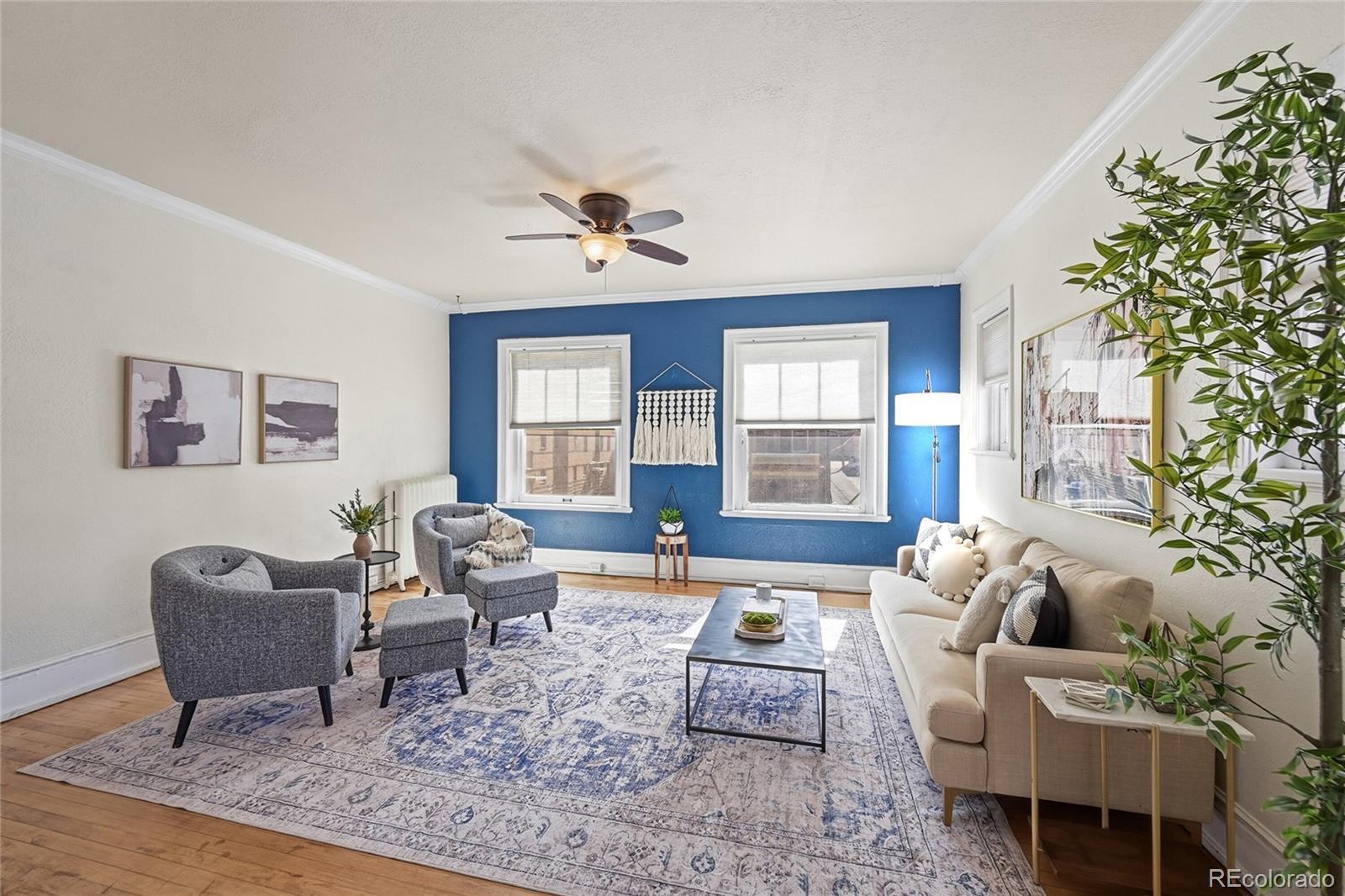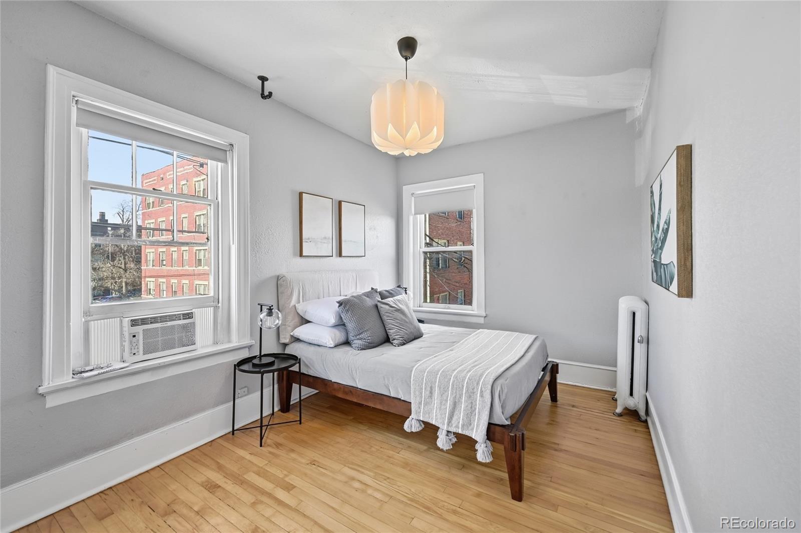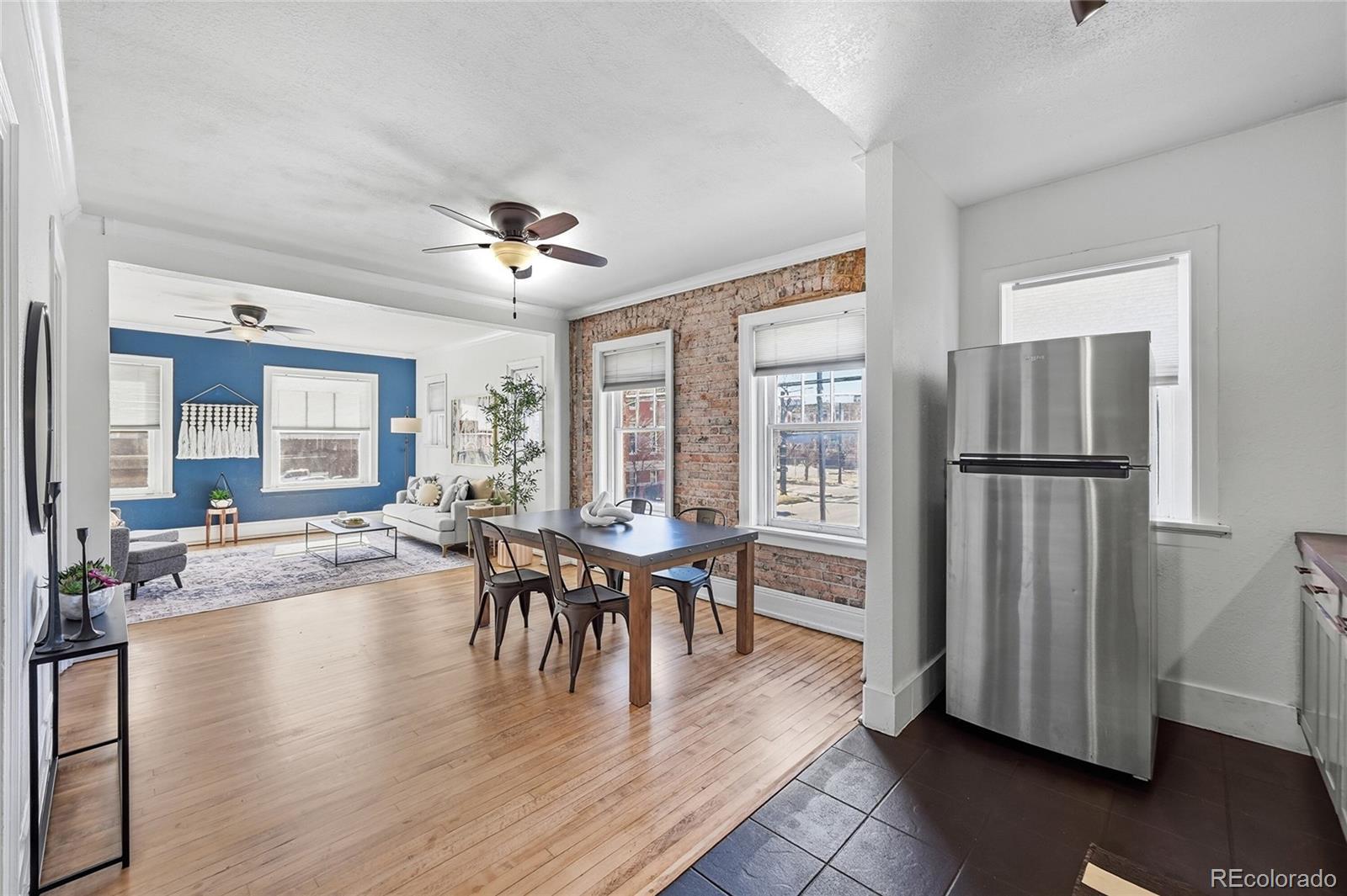 Capitol Hill living shines in this stylish yet timeless south-facing corner residence. Perched on the second floor, this light-filled home blends historic 1920s charm with effortless modern updates. Sunlight pours through expansive windows, illuminating rich hardwood floors, soaring ceilings and an open-concept layout designed for easy living. The spacious living area flows seamlessly into a bright dining room, where exposed brick adds warmth and character. In the kitchen, a newer countertop pairs beautifully with a freshly tiled backsplash and stainless steel appliances, while under-cabinet lighting creates both ambiance and everyday functionality. Two inviting bedrooms offer flexible space for peaceful retreats, guests or a dedicated home office, all wrapped in a soothing neutral palette with timeless trim. The chic bathroom features an updated vanity, built-in cabinetry and ample storage for a clean, elevated feel. Additional basement storage provides secure space for bikes and seasonal items. With a central location just moments from concert venues, vibrant nightlife, Downtown and major roadways, this Capitol Hill gem offers the perfect balance of charm, comfort and convenience.