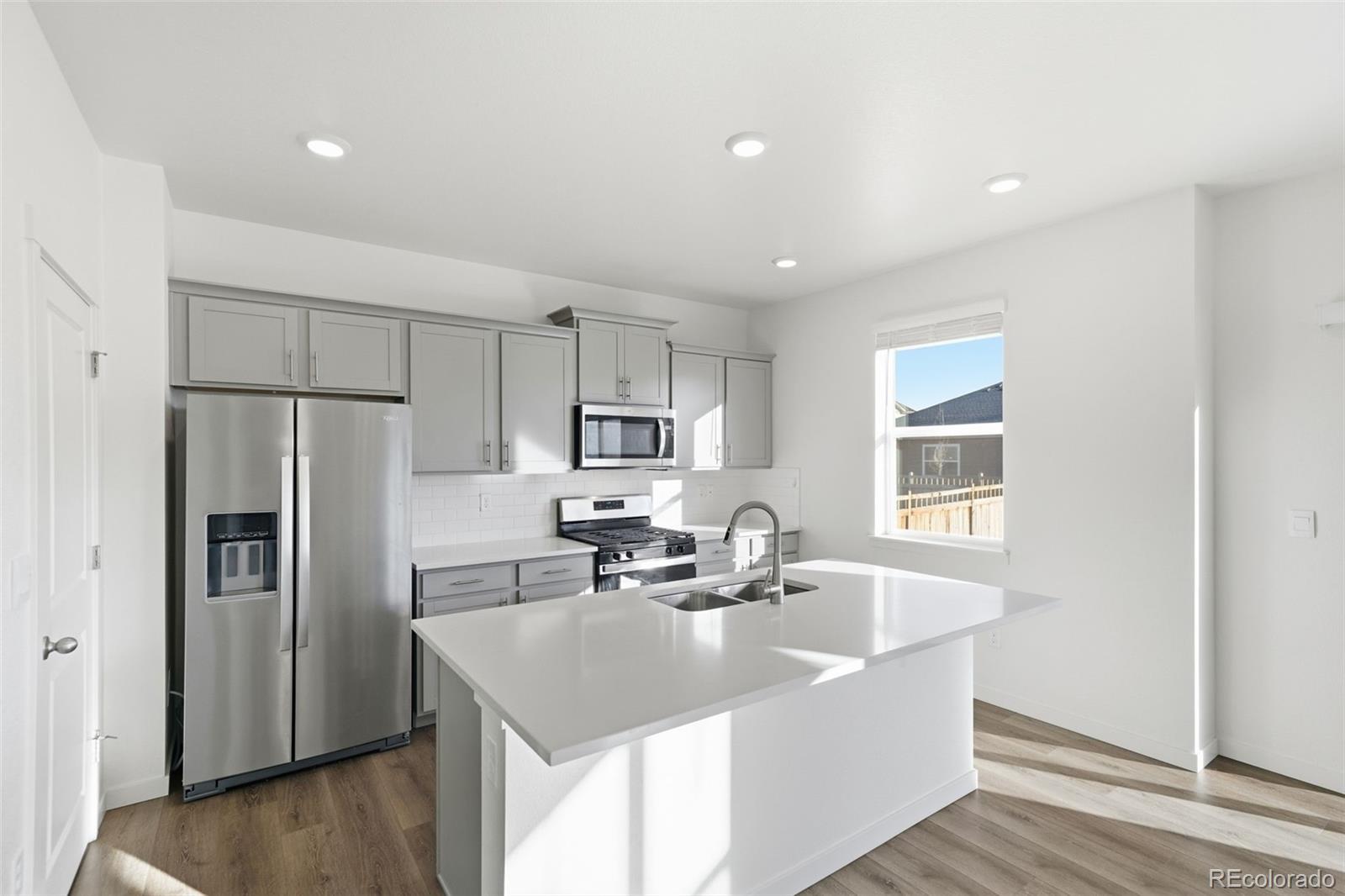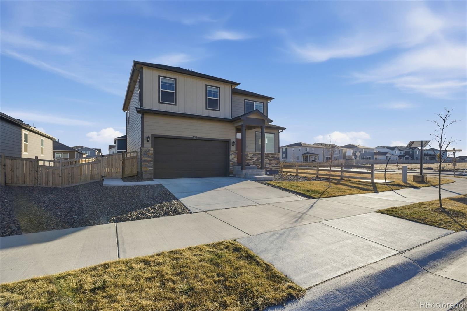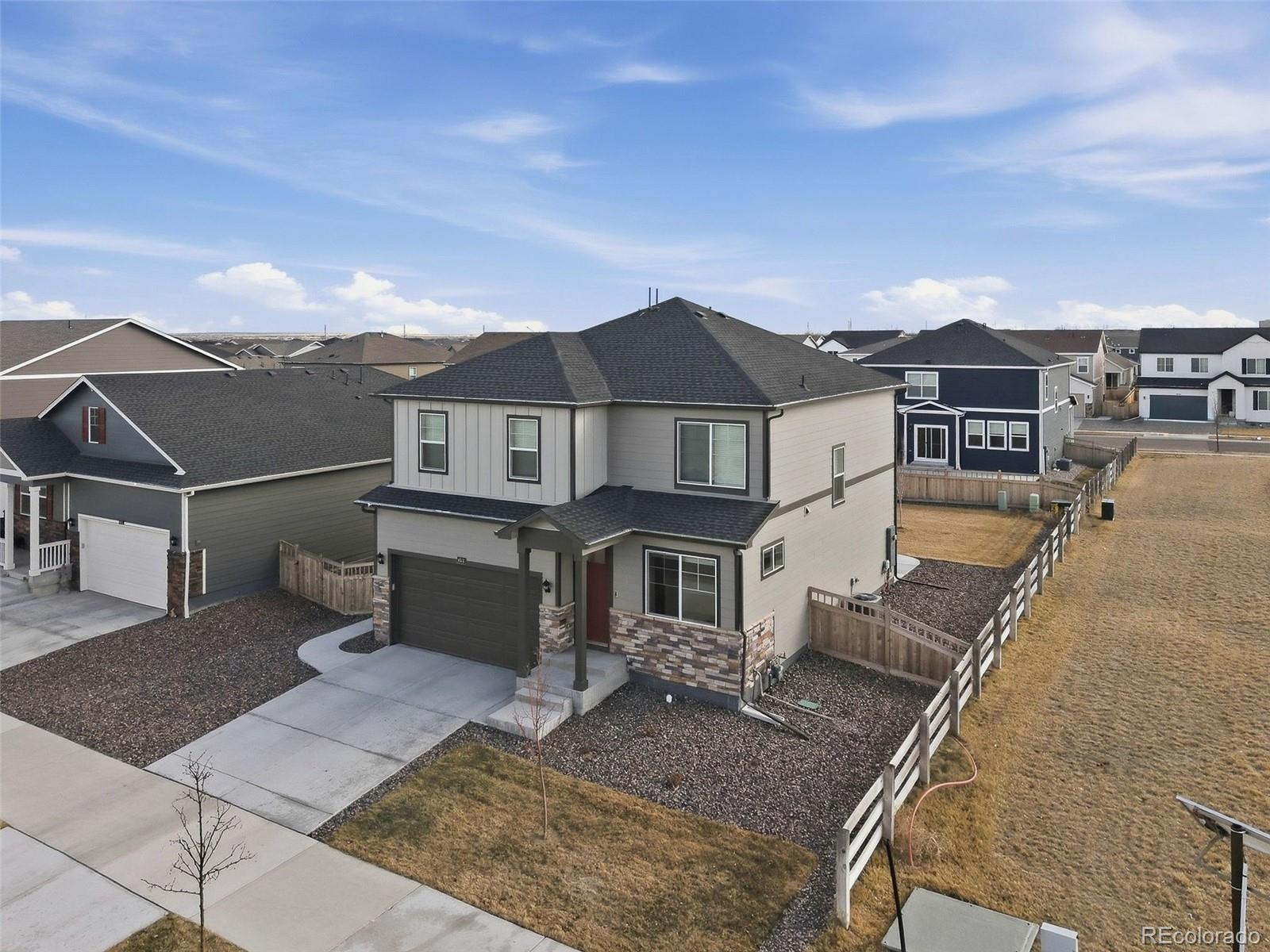 Welcome to 4634 Longs Peak Street in the highly desirable Brighton Crossings community in Brighton, Colorado. Situated on a two-story corner lot adjacent to Donelson Park, this 4-bedroom, 2.5-bath home built in 2024 offers modern design, smart technology, and an unbeatable location. The popular Bellamy floor plan features an open-concept main level with luxury vinyl plank flooring, quartz countertops, gray cabinetry, stainless steel appliances, a spacious pantry, and a large center island that flows seamlessly into the dining and living areas—perfect for everyday living and entertaining. Upstairs, all four bedrooms are conveniently located along with the laundry room. The spacious primary suite includes a private en-suite bathroom. Additional features include central air conditioning, a tankless water heater, radon mitigation system, tall walkable crawl space for extra storage, two-panel interior doors, neutral finishes, window coverings, and an electric vehicle charger in the garage. Front and rear yard landscaping are already complete with sprinkler system. Residents of Brighton Crossings enjoy access to the Venture Center and community pool, fitness center, splash park, dog park, parks, trails, and open spaces just steps away. This move-in-ready home combines comfort, efficiency, and community living in one of Brighton’s most sought-after neighborhoods.