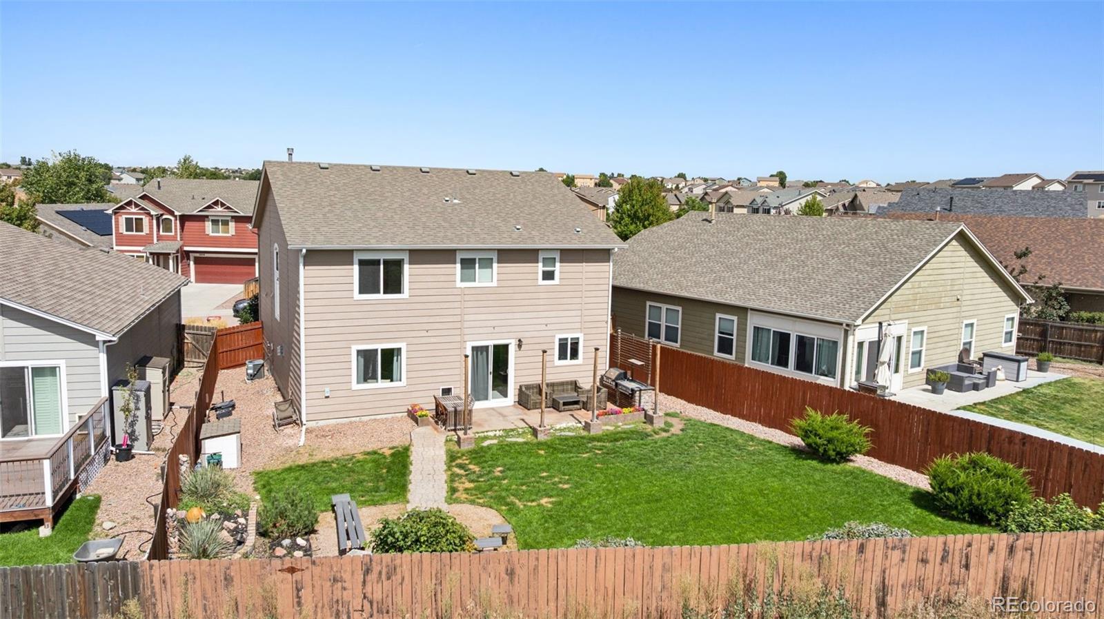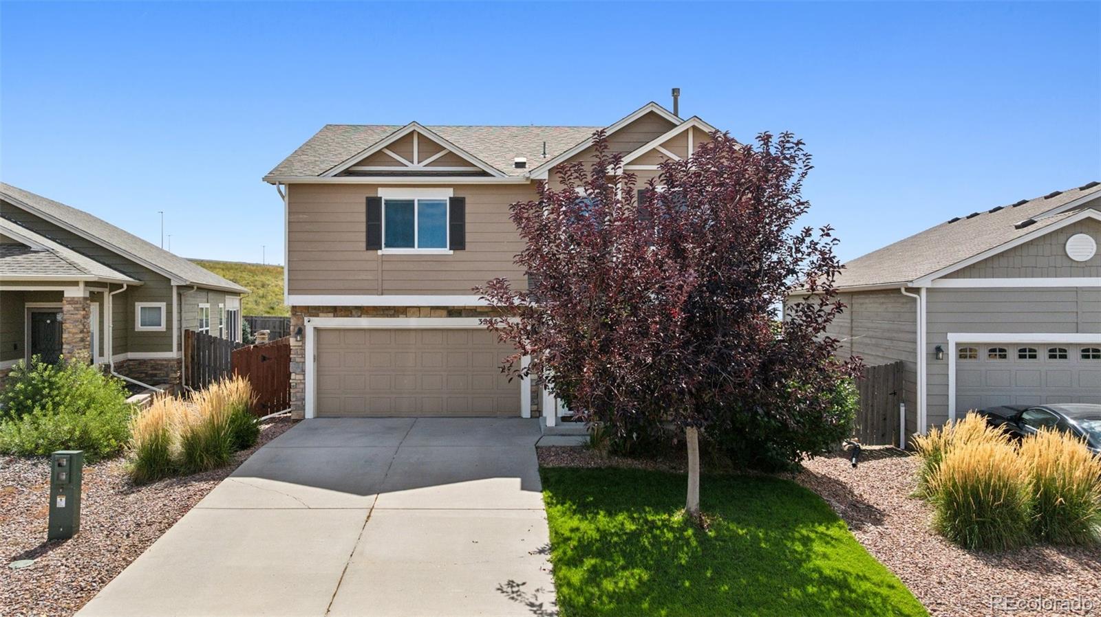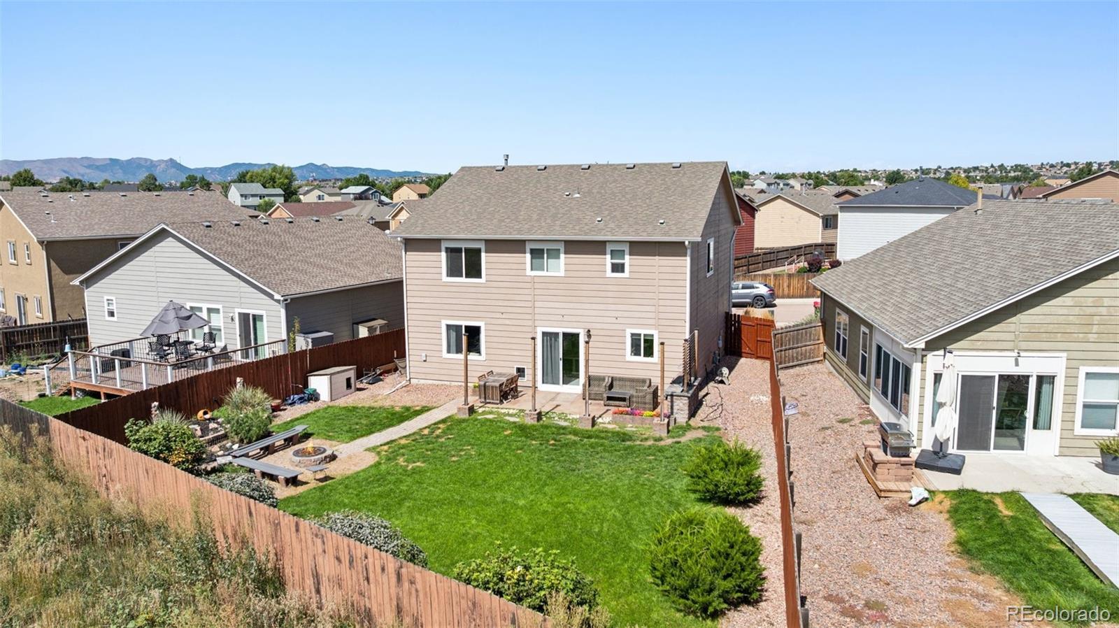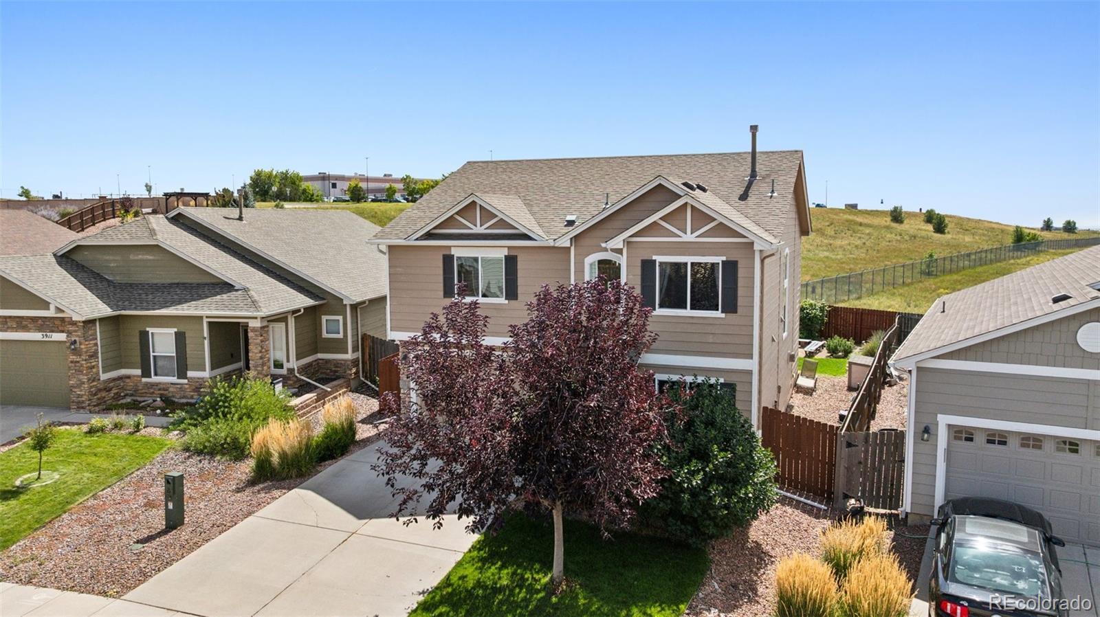 Stylish 2-Story Backing to Open Space in Mule Deer Crossing! This beautifully remodeled 3 bedroom, 2.5 bath home with a 2-car garage in District 49 offers modern touches throughout. The main level features luxury vinyl flooring, a private office, and a welcoming living room with a cozy fireplace. The updated kitchen shines with solid-surface counters, stainless steel appliances, custom pantry, island, and spacious dining area with walkout access to the fenced backyard with new grass—perfect for summer gatherings. Upstairs, enjoy an oversized family room, convenient laundry room, and a luxurious primary suite with a 5-piece bath, water closet, and custom built-in closet. Two additional bedrooms and a full bath complete the upper level. Ideally located near Peterson Air Force Base, parks, trails, schools, medical facilities, shopping, restaurants, and more—this home truly has it all!