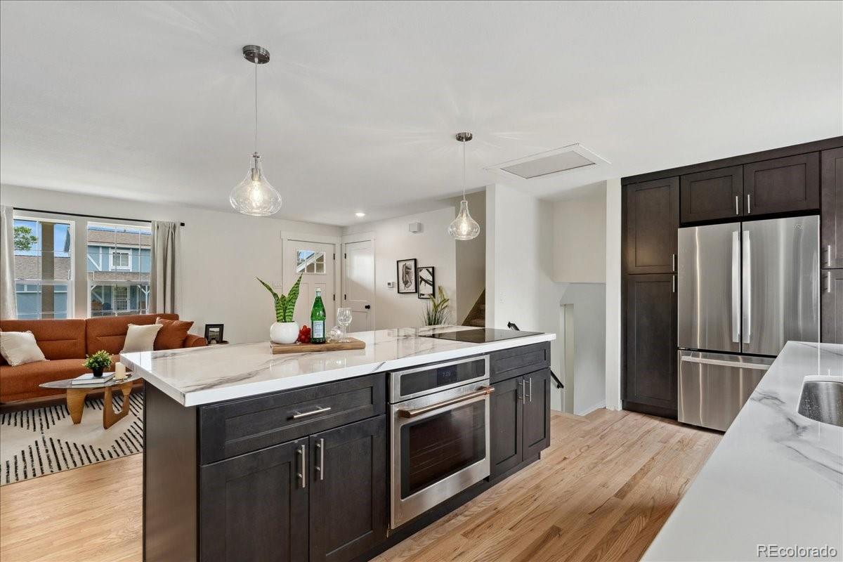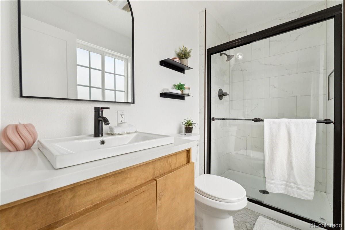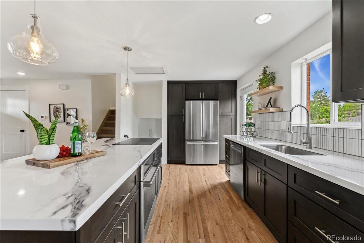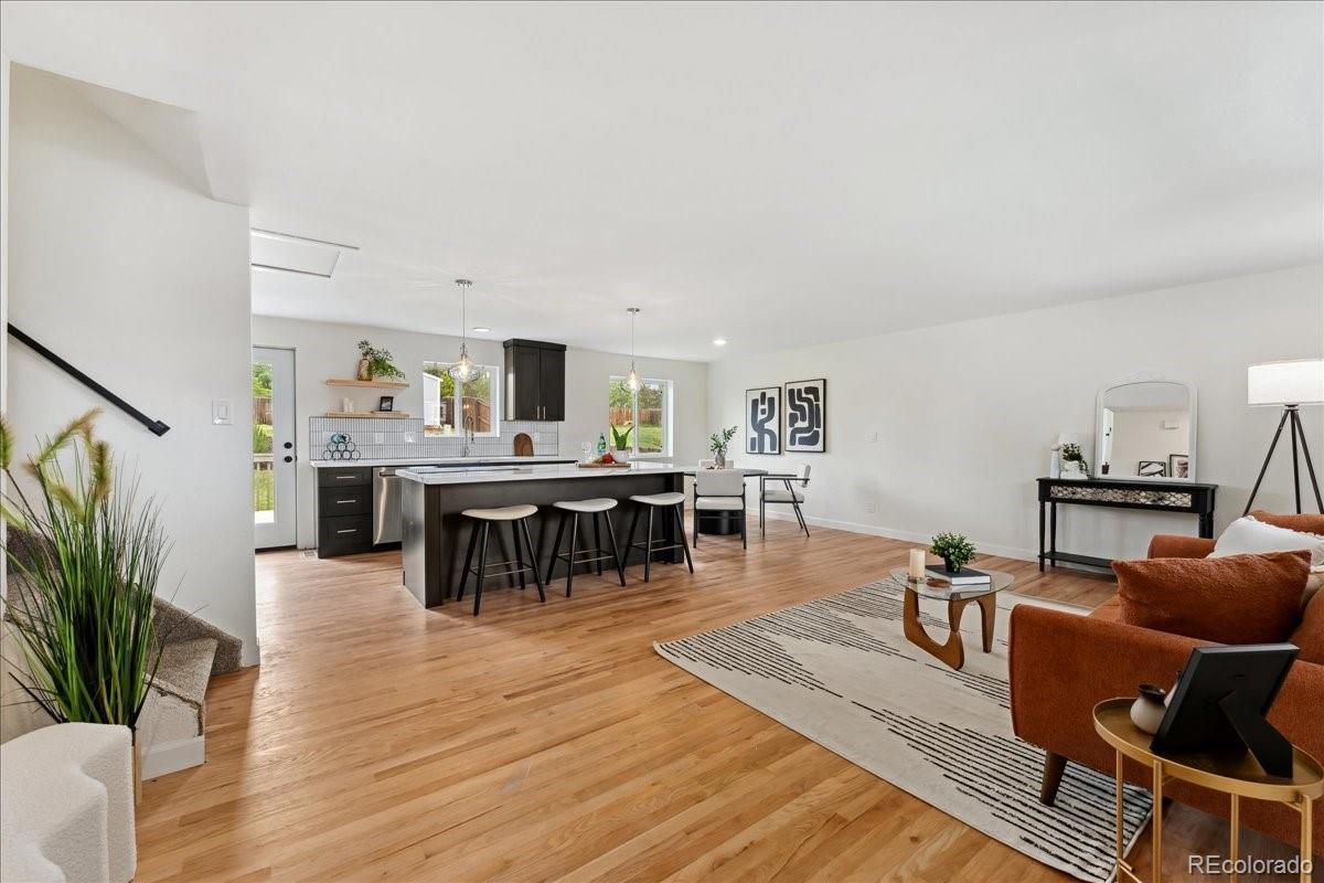 Welcome to one of the most beautifully updated homes in Sheridan Green! This 3-bedroom, 3-bath gem has been tastefully remodeled from top to bottom. The kitchen is the heart of the home, featuring a large center island, brand-new cabinets, counters, and backsplash, a separate cooktop and oven, and a custom pantry with a built-in refrigerator nook—an upgrade unique to this floor plan. Refinished hardwood floors add warmth throughout the main level, while brand-new carpet, doors, baseboards and fresh interior paint and texture give the entire home a clean, cohesive modern feel. Upstairs, the spacious primary suite includes an updated 3/4 bath with stylish finishes. You’ll also find two additional bedrooms and another fully updated full bath on this level—perfect for family, guests, or a home office. The lower level offers a generous family room with a cozy wood-burning fireplace, custom wall paneling, an updated half bath, and a separate laundry room. Head down one more level to find a bright, open basement space perfect for a playroom, home office, or gym, plus additional storage in the utility room. The electrical panel was recently replaced, along with nearly all switches and outlets. Outside, the home sits on over a quarter-acre lot with no neighbors behind you, offering privacy and space to enjoy. New mulch, plants, and landscaping add curb appeal, and three included storage sheds provide even more room for your gear and hobbies. Located just a short walk from Westminster Park and a quick drive to Broomfield Community Park, this home also offers easy access to a wide variety of restaurants less than 10 minutes away in either direction. With thoughtful upgrades throughout and unmatched charm, this home truly stands out in the neighborhood. Come see why it’s one of Sheridan Green’s finest! Additional financing incentives available with Caleb Mackey of Loan Haus! Call him at 720-601-0321.