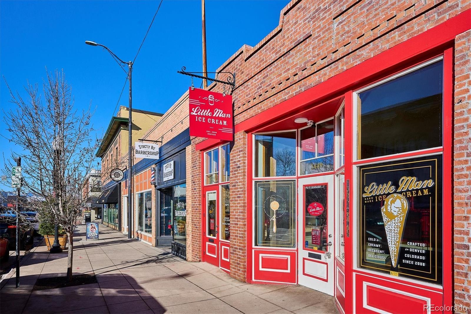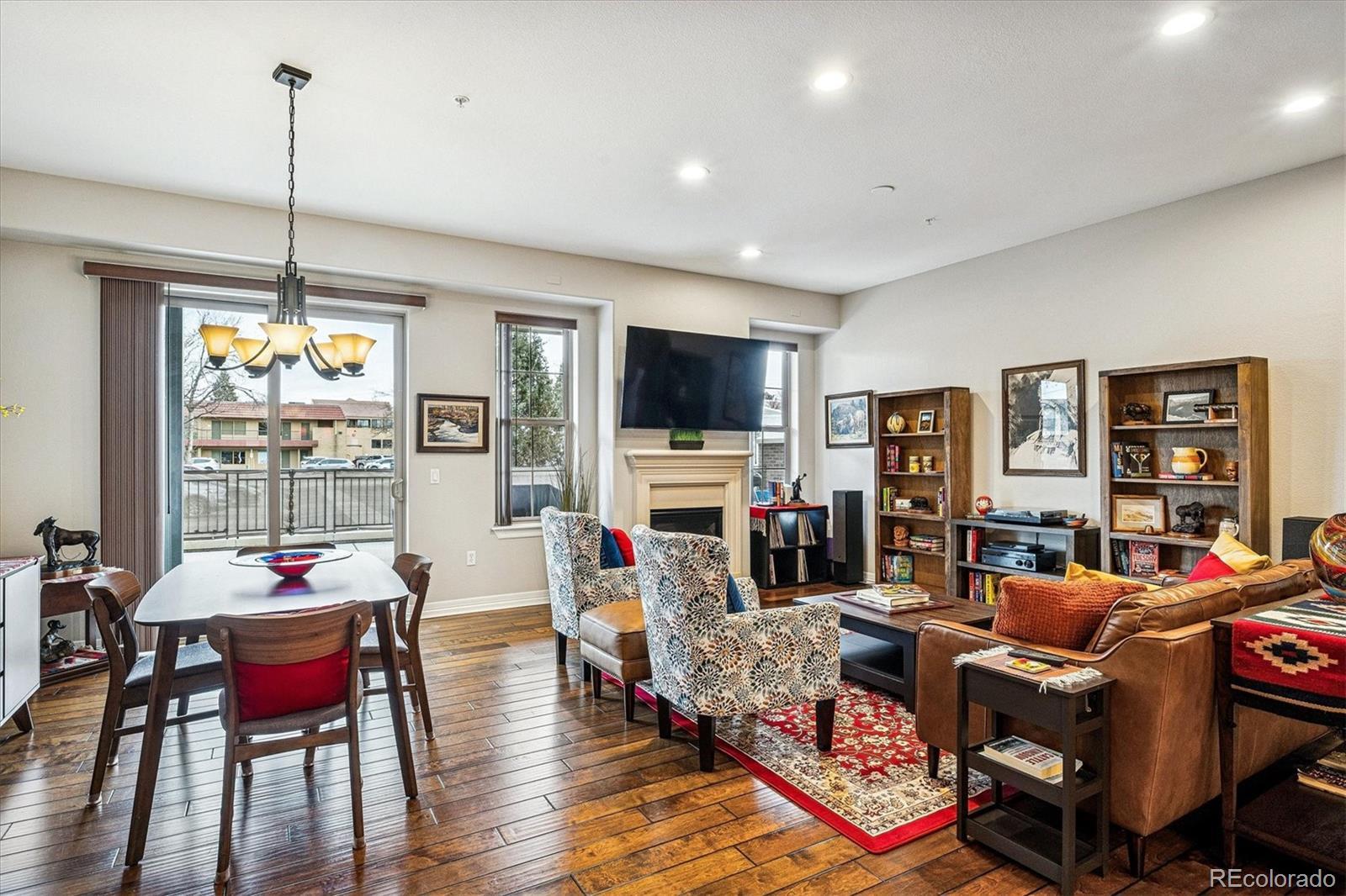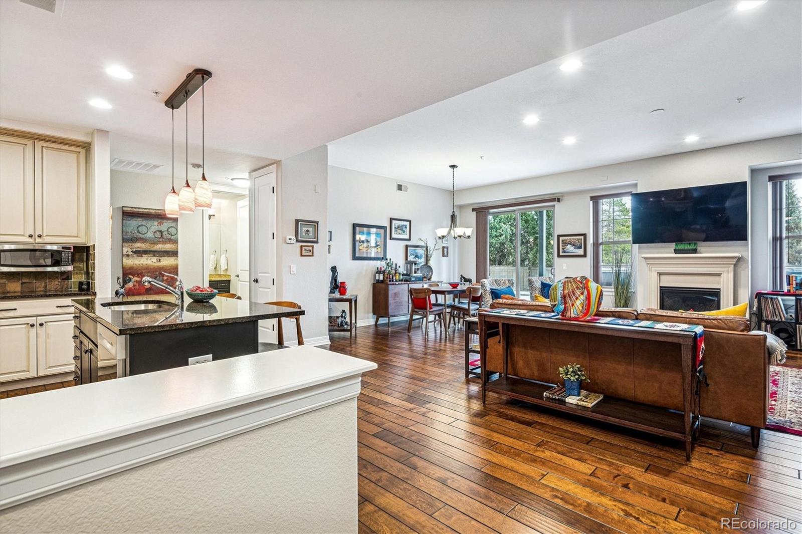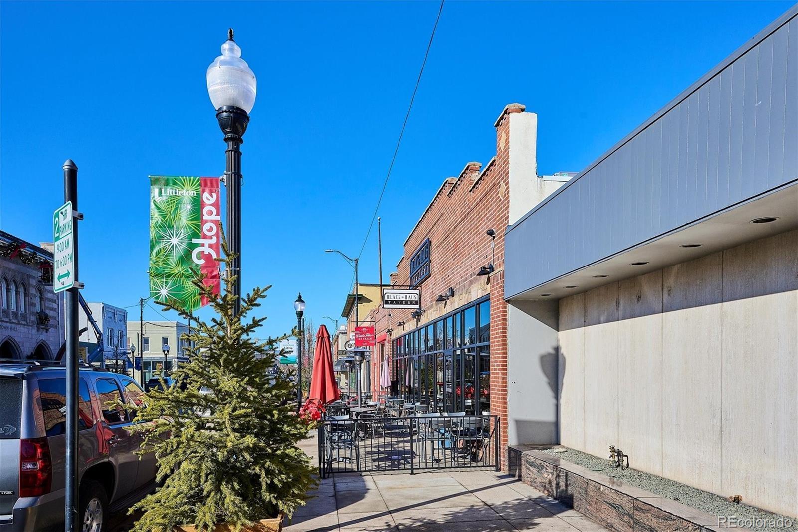 Exceptional ground-floor condo in the heart of downtown Littleton, located just blocks from Main Street on quiet, highly desirable Nevada Street with minimal through traffic. Walk to shops, restaurants, the light rail station, and the Platte River Trail—this is one of the best locations downtown has to offer. The home is move-in ready and impeccably maintained with recent updates including a new KUCHT gas range, stainless Frigidaire dishwasher, new living room blinds, new carpeting in both bedrooms, new window shades in the primary bedroom, and a newly replaced Siemens electrical panel. Hardwood floors span the living, kitchen, and dining areas, enhancing the open floor plan and abundant natural light. The kitchen features granite countertops, quality cabinetry, a large center island, and pantry, opening seamlessly to the dining and living areas—ideal for everyday living and entertaining. The primary suite includes a spacious walk-in closet with custom shelving and a well-appointed five-piece bath with granite countertops and neutral tile. A nicely sized laundry room with upper cabinets provides excellent storage; washer and dryer included. A standout feature is the expansive private patio—rare for the building, with only a handful of units offering outdoor space of this size. Two reserved underground parking spaces, a storage unit, elevator access, and professional management complete the offering. Condos in this location and condition rarely become available—an outstanding opportunity to enjoy the downtown Littleton lifestyle.