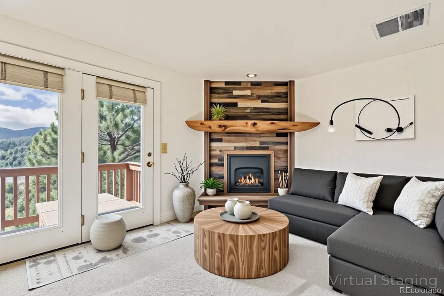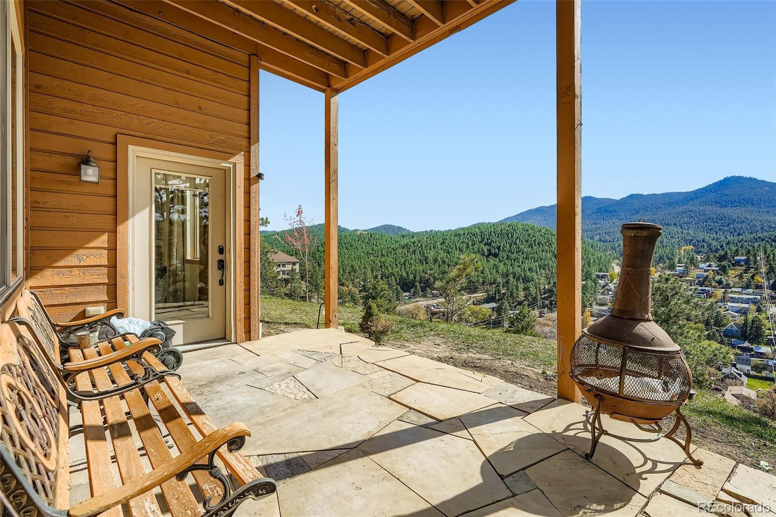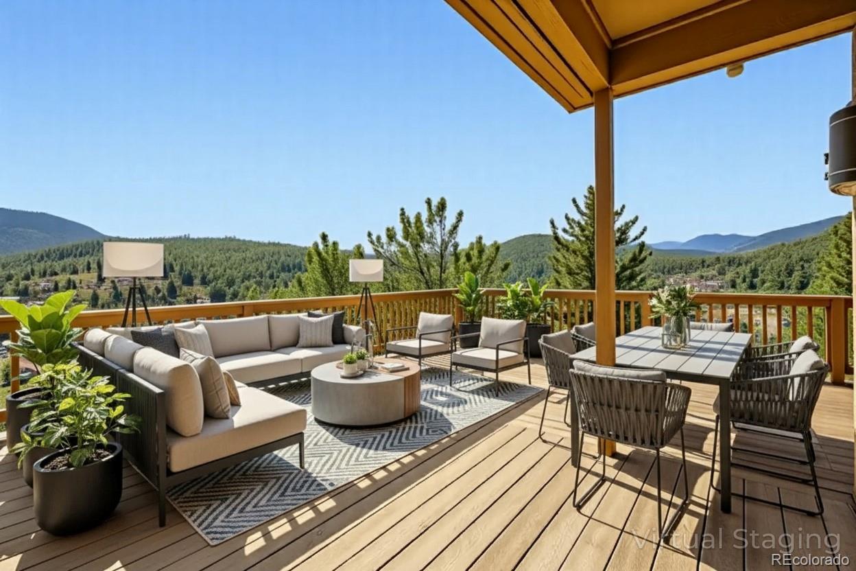 Click the Virtual Tour link to view the 3D walkthrough. Discounted rate options and no lender fee future refinancing may be available for qualified buyers of this home. Welcome to this stunning Evergreen mountain-side home, where breathtaking views and luxurious living combine seamlessly. The bright living room features a stone fireplace, and the formal dining room and kitchen with bar seating and a breakfast nook create a perfect space for entertaining or everyday living. A dedicated exercise room adds convenience, while the spacious primary suite offers a sitting room with its own fireplace and bar, a private balcony, and an ensuite bath with dual sinks, a jetted two-person soaking tub, a walk-in shower, and a massive walk-in closet with built-in storage. Upstairs, enjoy a dedicated office space and two additional bedrooms, while the basement provides another expansive living area, a kitchenette, a dedicated theater room, and an additional bedroom. Step outside to the wrap-around deck to take in the phenomenal mountain views and surrounding natural beauty. Located in Evergreen, this home offers access to hiking trails, parks, local dining, and shopping, combining serene mountain living with convenience and lifestyle amenities. This muti-generation home has it all! ***yard equipped with Invisafence***