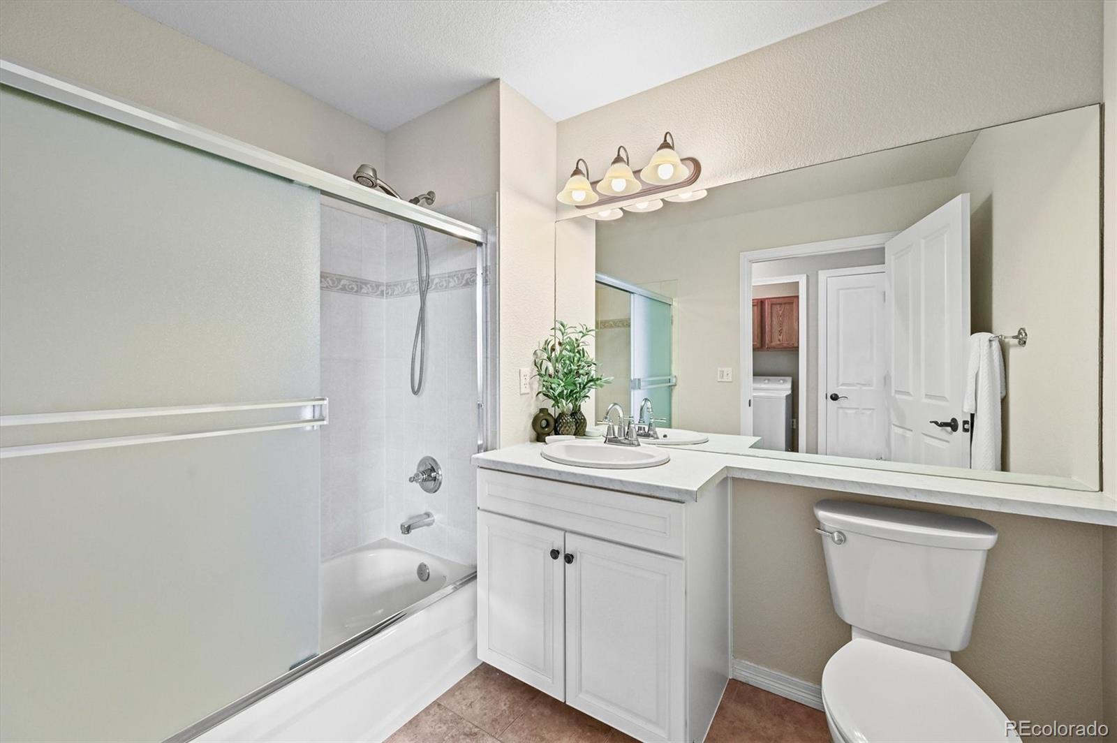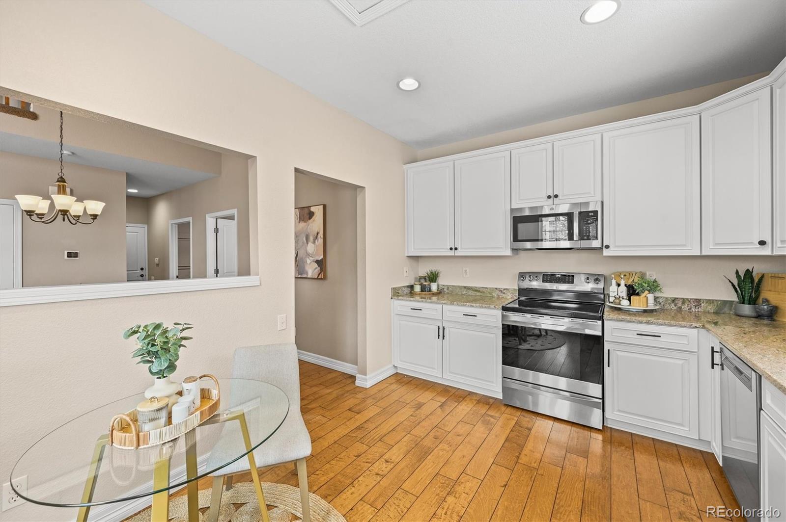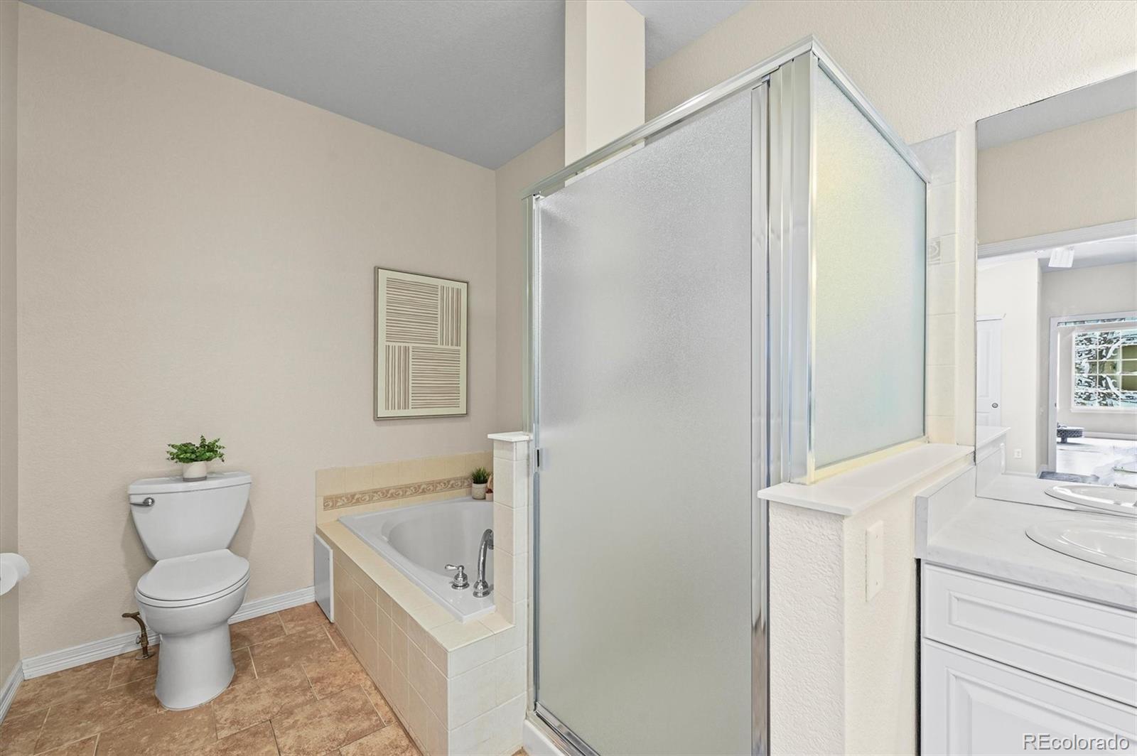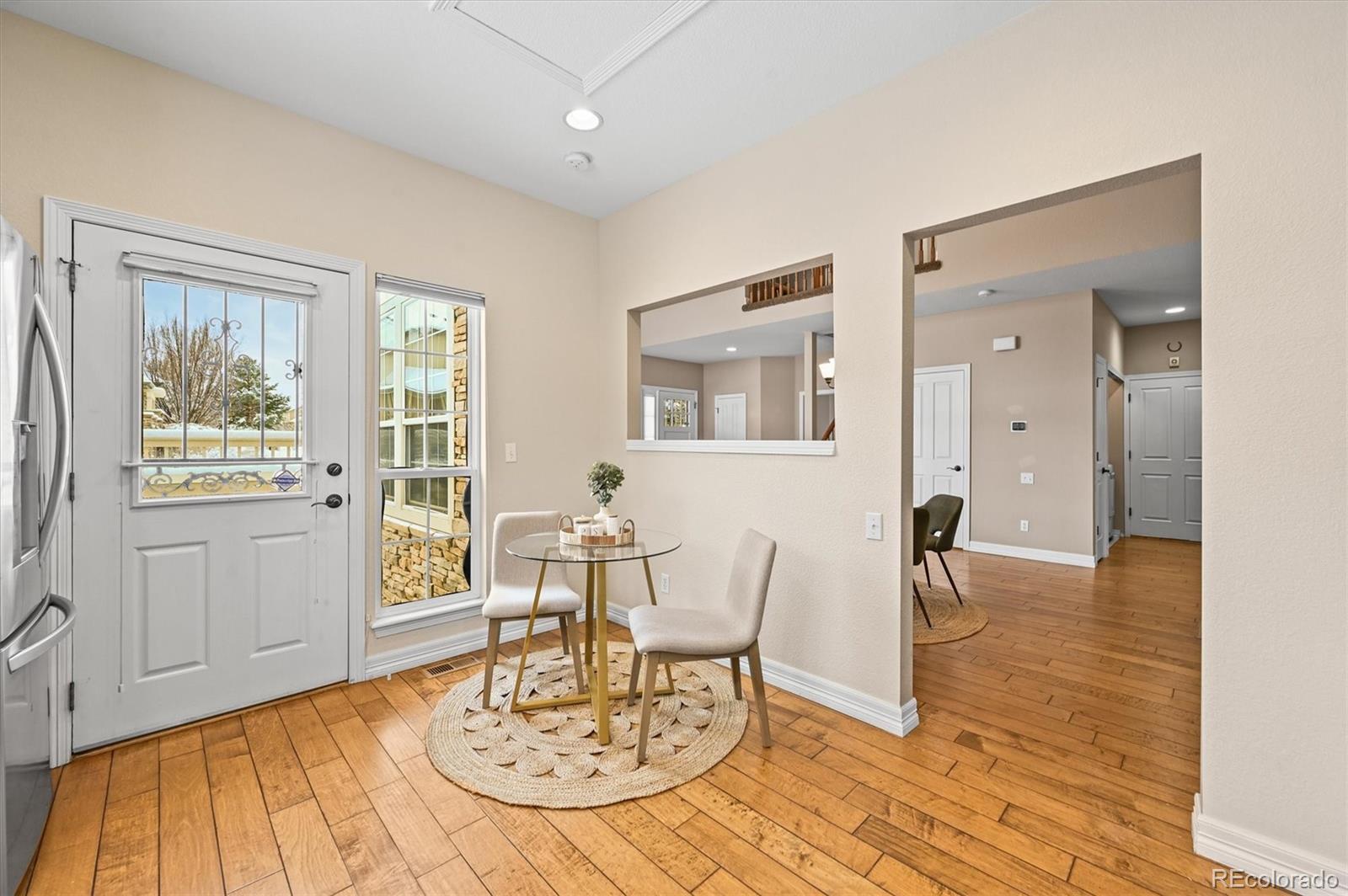 This beautifully maintained end-unit townhome offers a rare combination of space, natural light, and convenience, complete with an attached two-car garage and access to outstanding community amenities. The main level features engineered hardwood flooring throughout, creating a warm and cohesive flow. The living room is highlighted by vaulted ceilings, a gas fireplace, and an inviting openness that seamlessly connects to a generous dining area, ideal for everyday living and entertaining. The updated kitchen is thoughtfully designed with stainless steel appliances, granite countertops, recessed lighting, and a small eating space that offers flexibility for casual meals. Direct access to the private patio provides an effortless extension of the living space, perfect for outdoor relaxation. The main-floor primary suite offers comfort and functionality with plush carpet, two closets including a large walk-in with organizer, and a spacious five-piece bath featuring a jetted soaking tub. A secondary bedroom with walk-in closet, a full bath, and a convenient laundry closet with washer and dryer complete the main level. Upstairs, a bright and open loft with carpeting provides flexible space ideal for a home office, sitting room, or play area, complemented by a half bath. The open basement presents an excellent opportunity to expand the living space to suit your needs, already equipped with egress windows, a utility sink, and a radon mitigation system. Ideally located near trails, parks, shopping, and dining, this home also enjoys access to the amenities at 4 rec centers throughout Highlands Ranch.