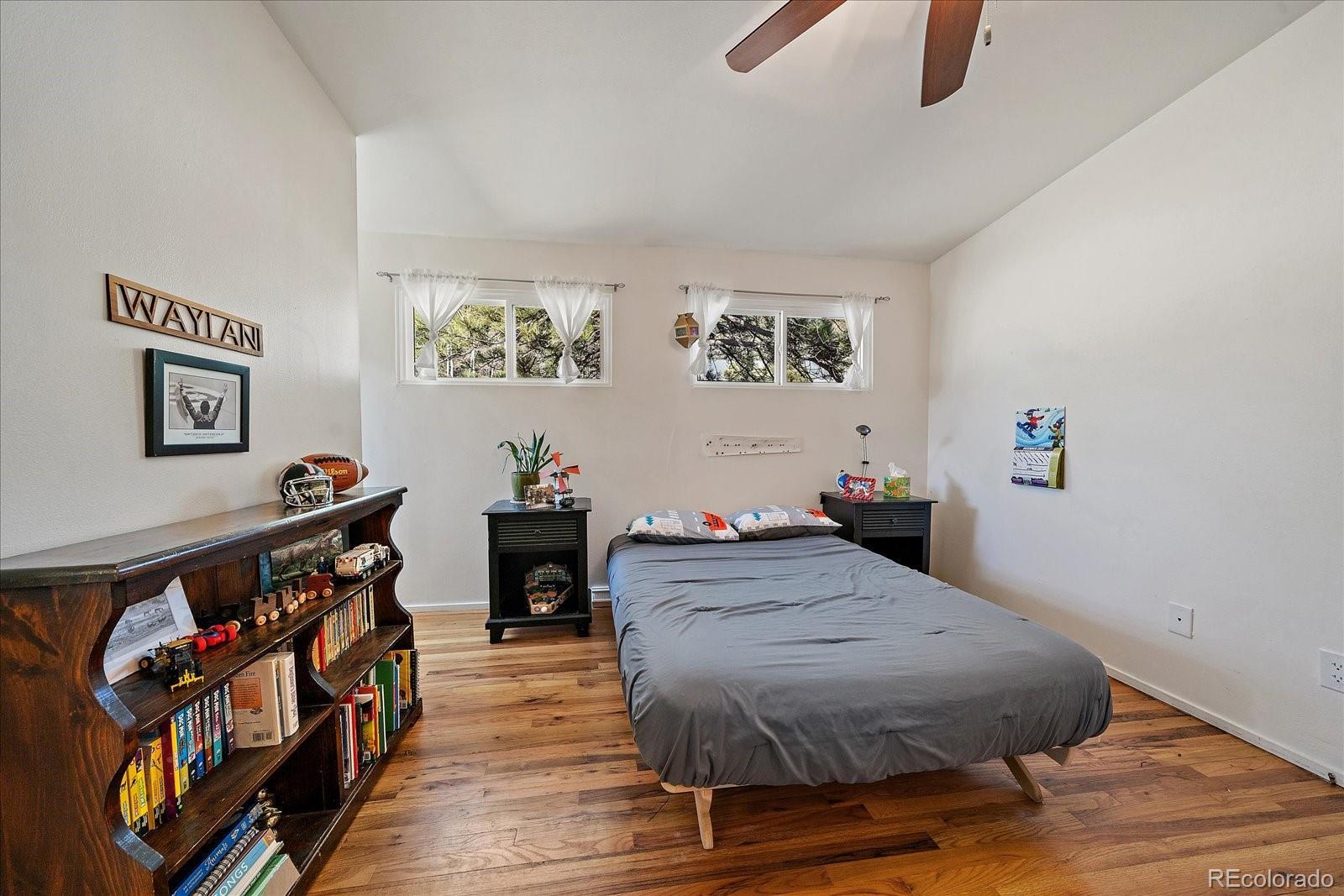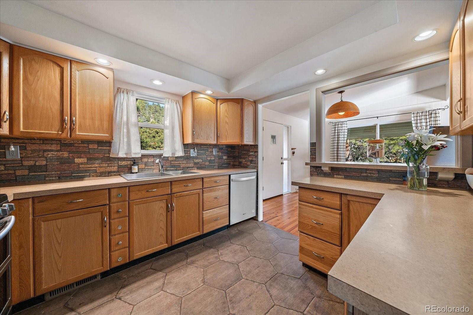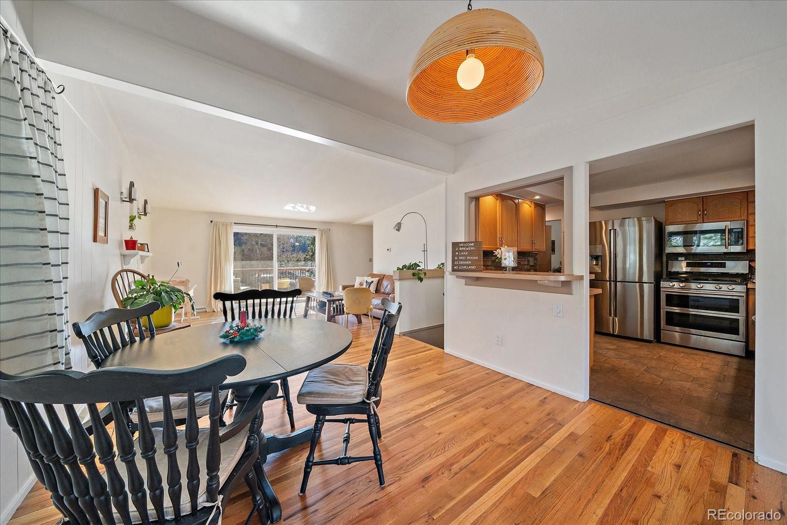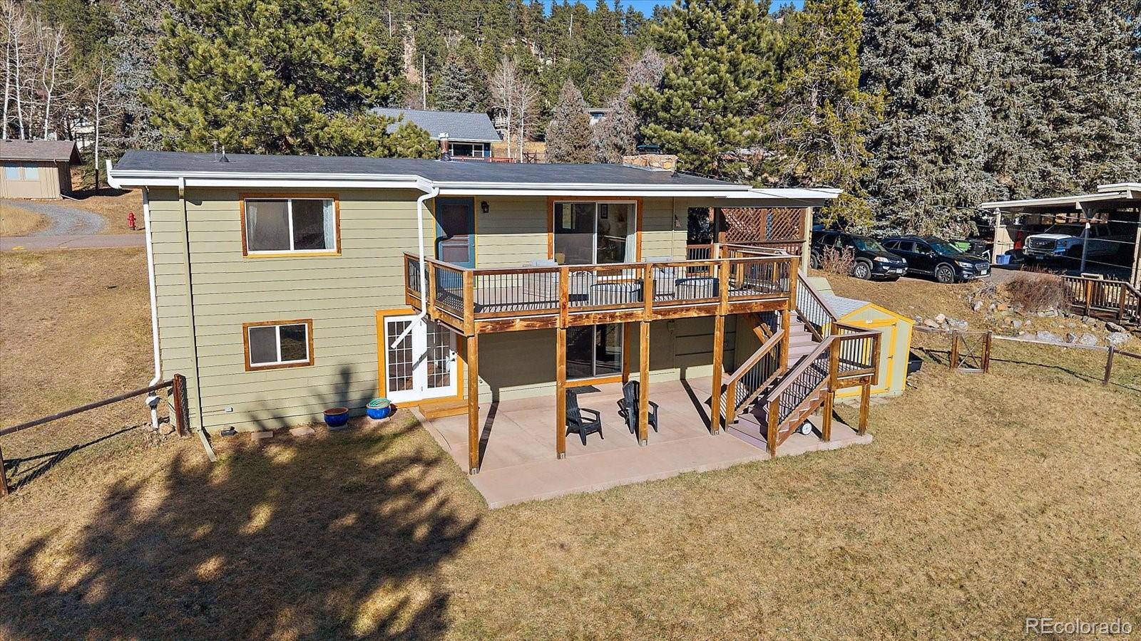 Prime location in the heart of Hiwan with a charming home. This offering has a little bit of everything - a large flat yard, an updated home and versatile spaces. A covered porch welcomes you into the home where a large great room awaits. Gleaming wood floors, wood-burning fireplace and a large enteraining area complete the great room. The totally updated kitchen offers stainless appliances, gas range with dual ovens, pantry and plenty of counter space. You will be able to cook but still feel like part of the action as the spaces are open and flowing. Two primary suites are on this stairless main floor. The first offers sweeping views of the backyard as well as the distant hills. This room has a private en-suite bath. The secondary bedroom laso has a private full bath. The great room opens onto the large maintence-free deck that can serve as a natural expansion to the great room. The deck has stairs that lead you to the covered patio below. The lower level offers versaitles spaces that access the back yard. A newly remodeled family room is ideal for TV watching or overflow guests and is adjacent to the 3/4 bath. A barn-door leads to the 3rd bedroom that has plenty of natural sunlight. A large game room/bonus space is great for hobbies, toys or flex area. Laundry is located in the corner and can easily be walled off. The fenced back yard is an oasis for pets, throwing a ball or hosting guests. Home is in move-in ready condition with newer roof, windows and more. Walk to local restaurants, park or theatre. This is easy-mountain-living at its finest.