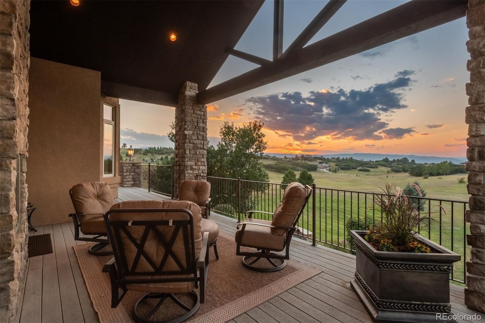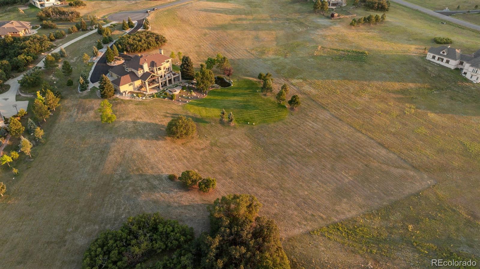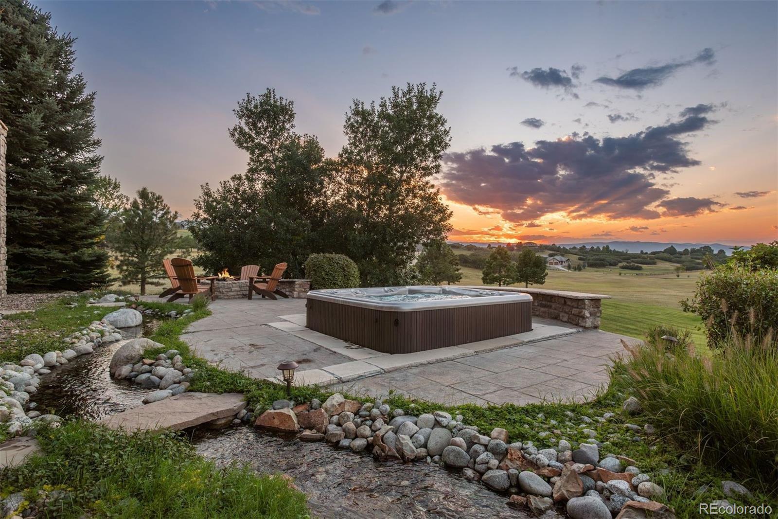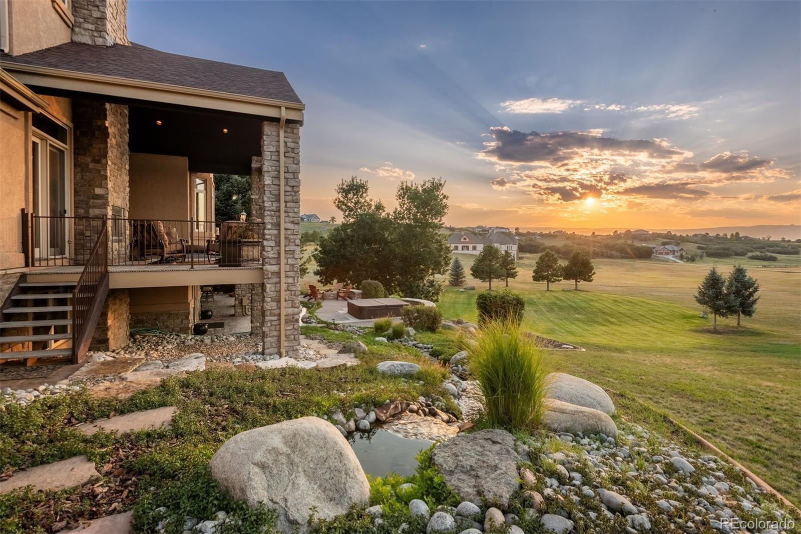 Experience unmatched serenity and Colorado beauty in this stunning Keene Ranch estate, privately tucked at the end of a quiet cul-de-sac on nearly 5 acres. Surrounded by rolling hills and expansive mountain views, this home offers rare privacy while still minutes from Castle Rock and all its conveniences. A charming front courtyard and side patio welcome you inside, where stone accents, wide-plank hardwood floors, and soaring ceilings create timeless warmth. The chef’s kitchen features a 6-burner Viking range, slab granite island, warming drawer, and open flow into the cozy family room—ideal for everyday living or entertaining. Formal living and dining spaces, a main-floor office with patio access, and a spacious laundry room add comfort and function. Outdoor living shines with a large covered deck offering a fireplace, Trex decking, and space for dining while enjoying breathtaking sunsets. The walkout patio below includes a hot tub, new gas burner (2024), firepit, and a peaceful pond with a recirculating stream. The primary suite is a true retreat with a private balcony and spa-inspired bath. Three secondary bedrooms include an ensuite and a Jack-and-Jill layout. The finished walkout basement expands your living space with a home theater, wet bar, gym, second office, and updated paint (2023–2024). Recent updates include a 50-year roof (2016), new water heater (2023), septic repairs (2023), and a new well pressure tank and filtration system (2025). An oversized 6-car garage with custom storage and open acreage provides room for horses, RVs, or future outbuildings. Peaceful, private, and beautifully maintained, this Keene Ranch property embodies the best of Colorado acreage living and Douglas County luxury real estate.
