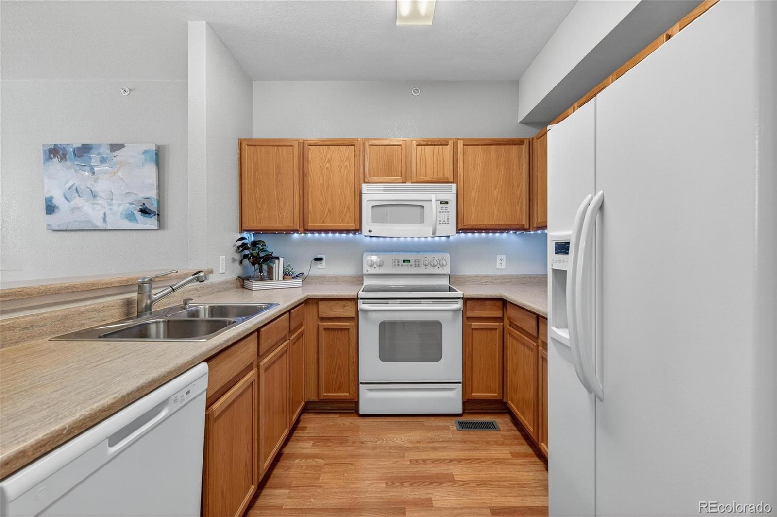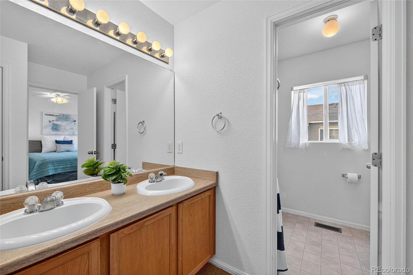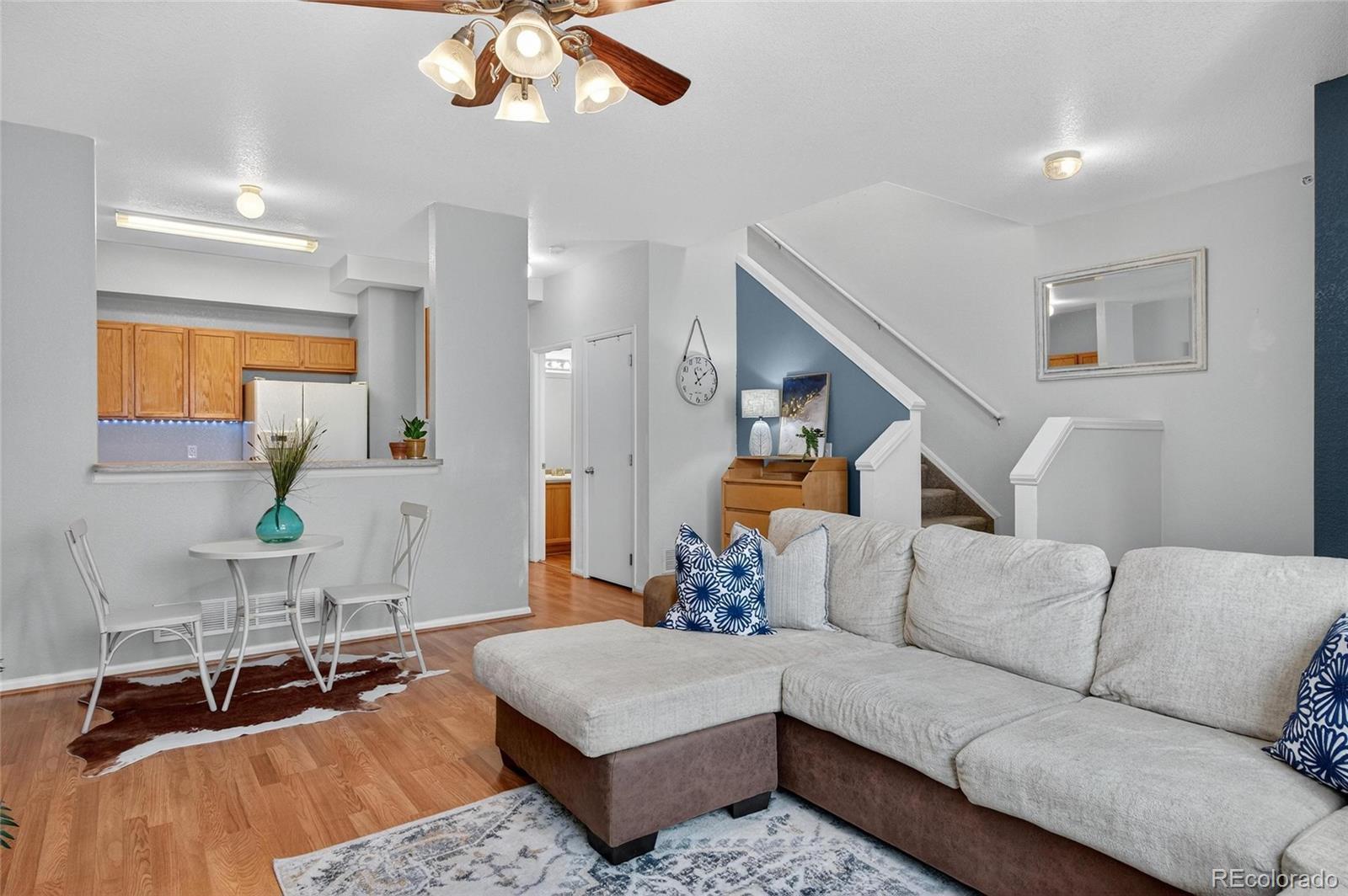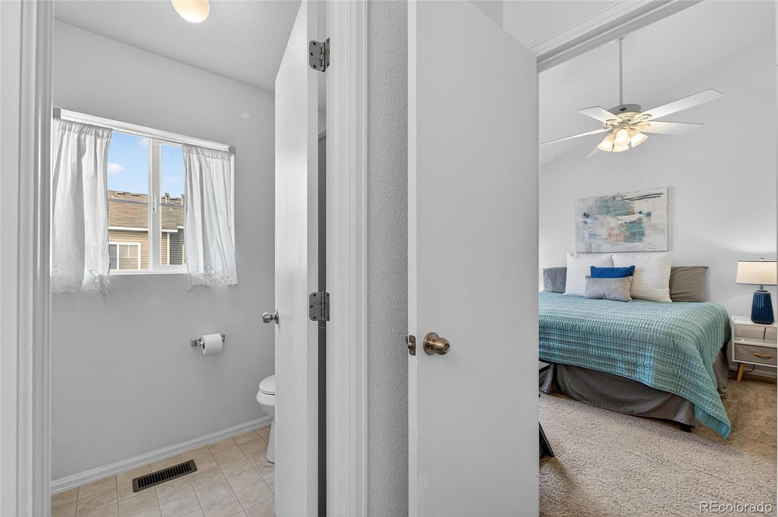 Welcome home to this beautiful townhome showcasing 2 bed/2.5 bath, 1,201 sq. ft., and a 2 car attached garage. The main floor boasts a spacious kitchen with ample cabinet space, the perfect powder bath, and adjoining dining area that flows effortlessly into the spacious living room. Upstairs the spacious secondary bedroom offers ample closet space with easy access to the full hallway bath and convenient upstairs laundry. The sizable primary bedroom boasts a walk-in closet and 5 piece ensuite bath complete with separate shower/tub and toilet. Enjoy quiet mornings on the front porch or a stroll on one of many nearby trails. No need to wait for a new build, this move-in ready home is available now and features affordable taxes and HOA! Fronterra Village is centrally located with great access to neighborhood parks, trails, playgrounds, shopping, dining, E-470, I-70, DIA and so much more!