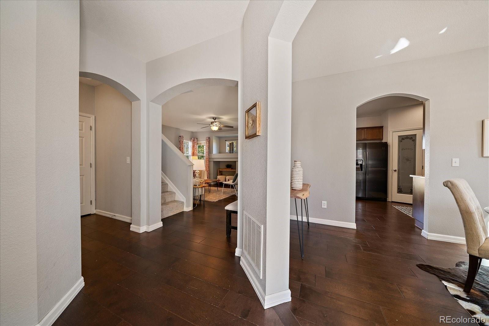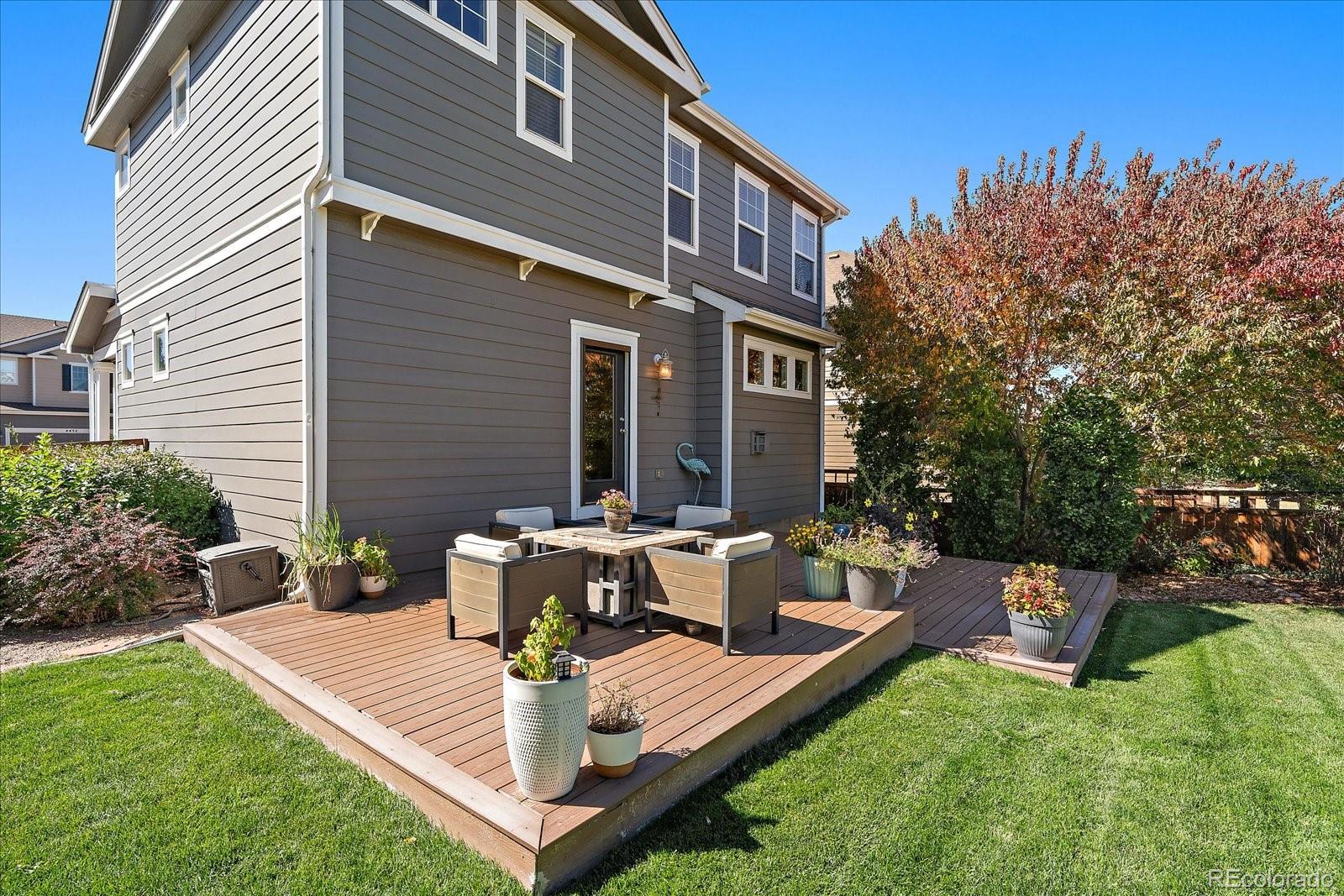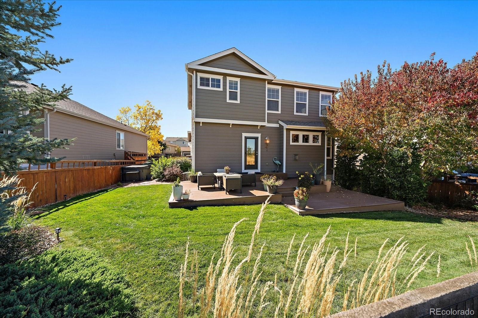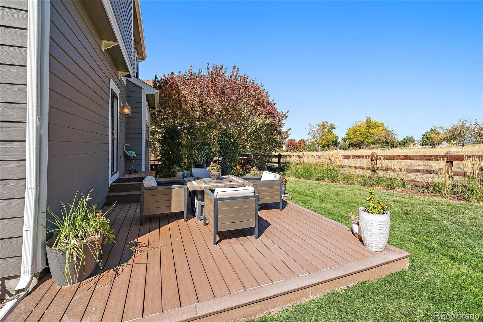 Discover this beautifully updated home in The Meadows, ideally situated on open space for great views. Thoughtful upgrades, including new carpeting, mean you can simply move right in and enjoy. The main level features hardwood floors and a spacious dining area is perfect for gatherings, while the open-concept kitchen includes black stainless steel appliances, a pantry, and ample workspace. Relax in the inviting living room complete with a cozy gas fireplace. Upstairs, the primary suite offers a retreat with a soaking tub, dual vanities, tile flooring, and a generous walk-in closet. The secondary bedrooms won’t disappoint either with lots of light and walk-in closets. The full hall bath has been refreshed with dual sinks and updated tile. A bright loft area provides a flexible space with plenty of natural light and views. The finished basement includes a study plus abundant storage. This room also includes a closet and egress windows so could be used as a 4th bedroom. Stay comfortable all year round with dual furnaces and A/C units. Step outside to a Trex deck and gas firepit, or unwind in the hot tub tucked along the side yard—both included. Garage and basement shelving remain for added convenience. Newer Interior and Exterior Paint. Close to the The Grange pool and tons of amenities. https://meadowscastlerock.com/explore/parks-amenities/ This is a home that truly has it all—location, views, updates, and space. Don’t miss your chance to see it!