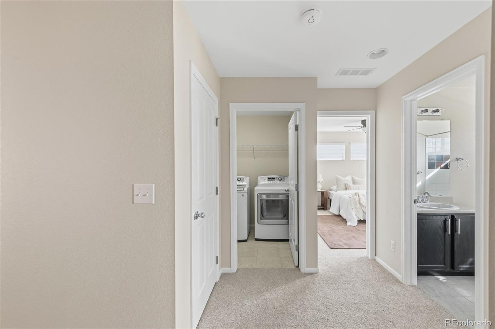 Nestled in Erie Commons just minutes away from Old Town Erie, this two-story residence marries thoughtful design with effortless lifestyle living. Offering a sunlit, open floorplan, the main level unfolds with hardwood flooring and new carpeting. An eat-in kitchen showcases granite countertops, a pantry, 42-inch cabinetry, butlers pantry/storage, a center island and black stainless steel appliances including a gas range. A formal dining area sets the stage for elegant gatherings, while an office with French doors offers a quiet work-from-home haven. Upstairs, the expansive primary suite is joined by a 5-piece bath with a soaking tub and a generous walk-in closet, complemented by two additional bedrooms and a convenient laundry room. Enjoy outdoor relaxation on a covered front porch or in a low-maintenance backyard with a stamped concrete patio and putting green. Upgrades include new carpet and a dual HVAC system, which along with the roof + water heater were all replaced in the last 3 years. Complete with a 3-car garage, this home sits moments from Erie Community Park, the library, rec center and community pool while offering seamless access for commuting to Boulder or Denver.