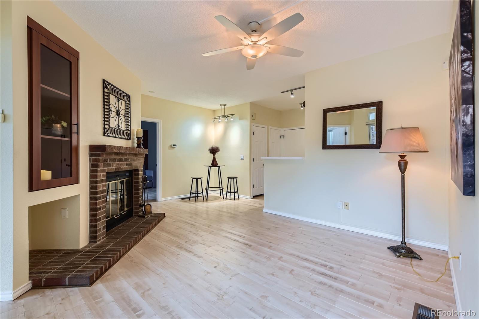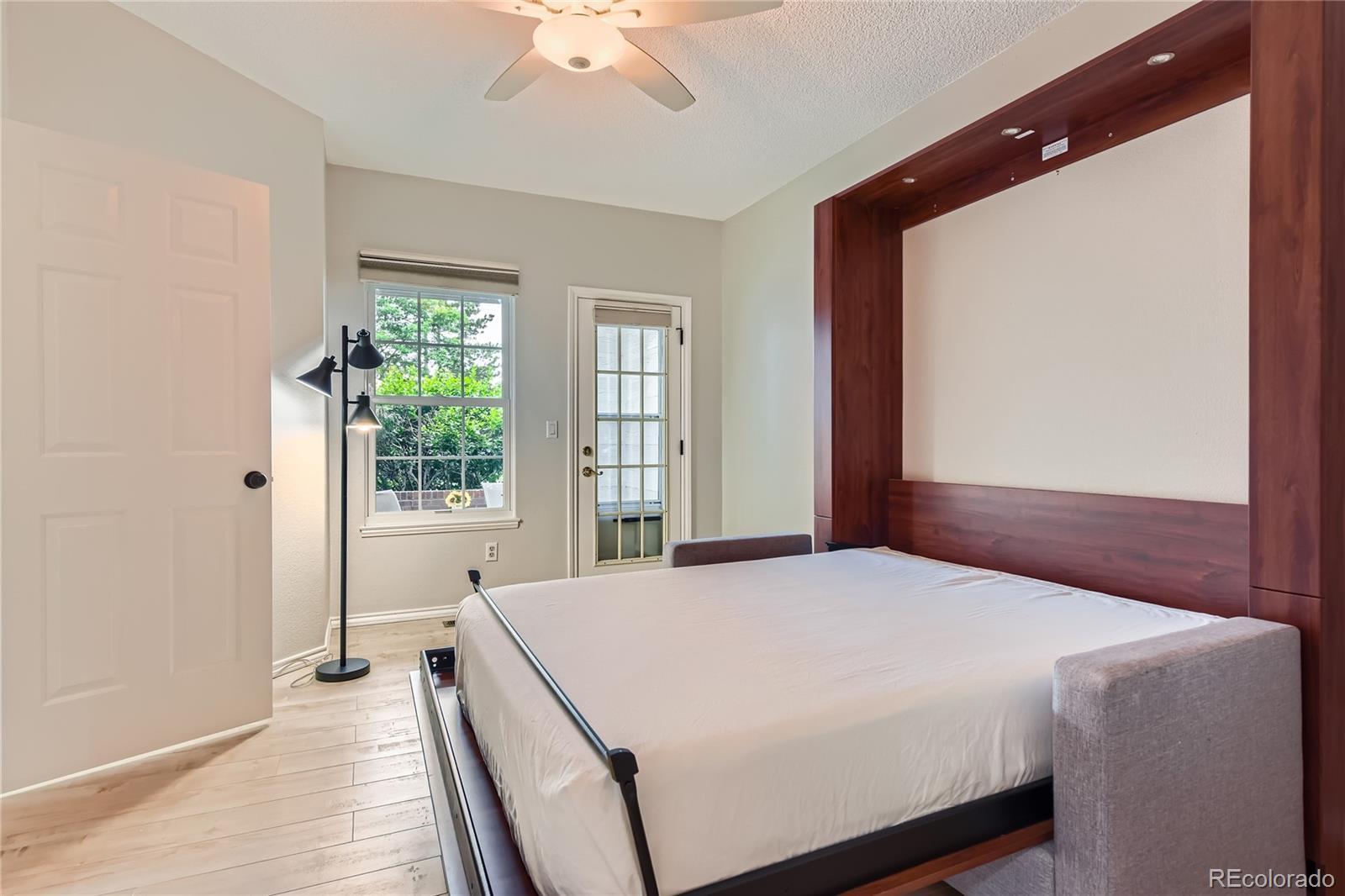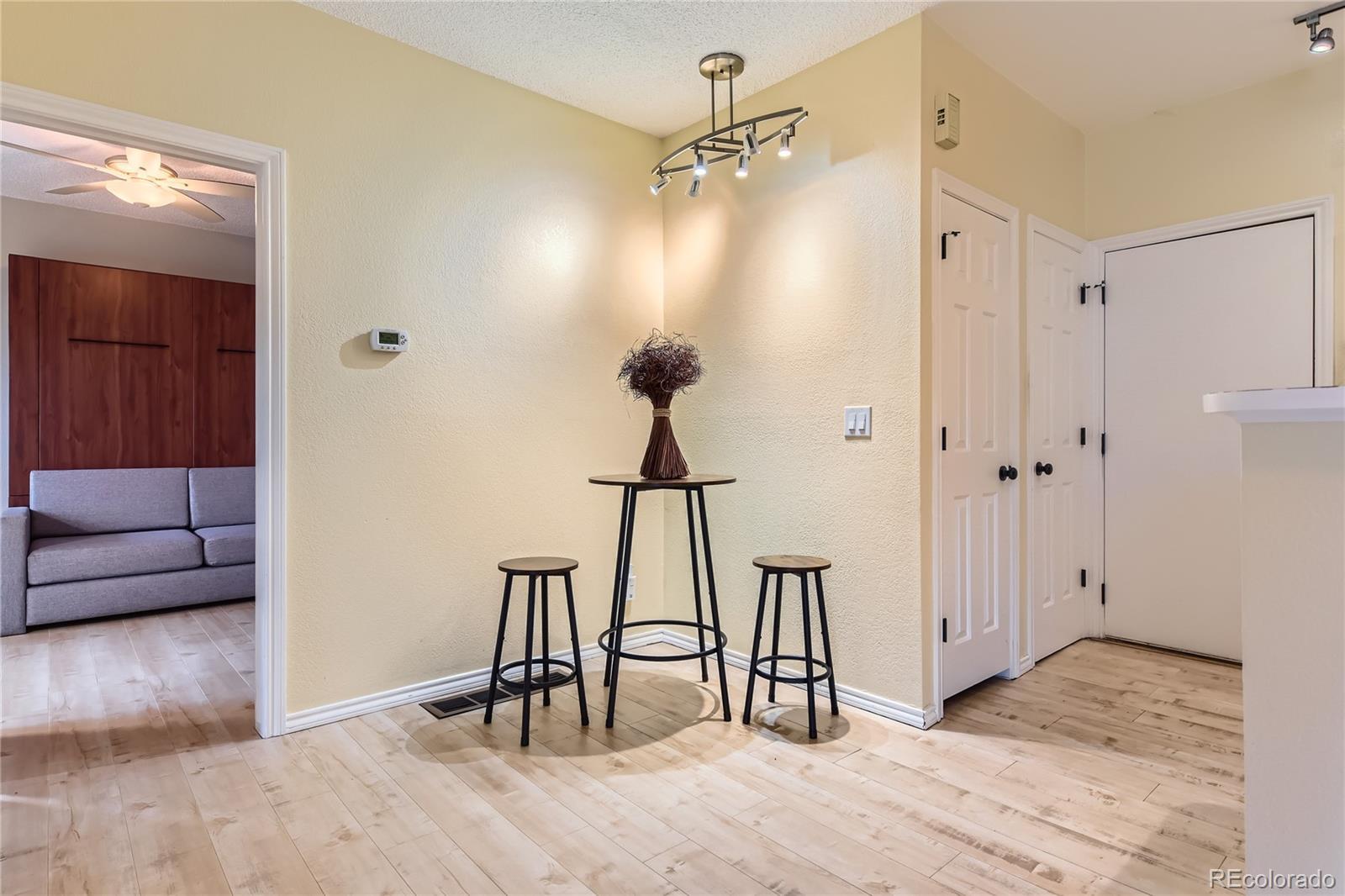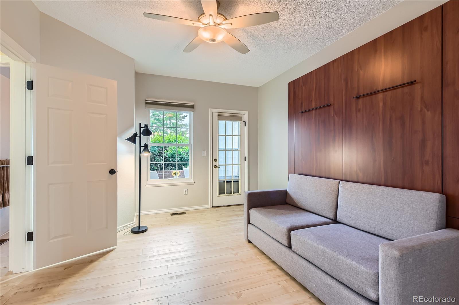 Immaculate, updated ground-floor 2 bedroom, 2 bath unit with a private patio, just steps from the pool! Attached garage with newer door and opener provides direct access into your home. Located just minutes from downtown Littleton in a beautiful well-maintained complex surround by Centennial Golf course. Enjoy modern living with newer windows complete with Hunter Douglas blinds and LVP flooring throughout. The updated kitchen boasts track lighting, crisp white cabinets, stainless steel appliances, and a large pantry with convenient pull-out shelving. The newer LG washer and dryer included. The living room offers comfort with a ceiling fan, a cozy wood-burning fireplace, and a built-in cabinet storage. The primary bedroom features a built-in Murphy bed, ceiling fan, and a spacious walk-in closet with an organizer. A private covered patio, accessible from the primary bedroom, is perfect for pets or relaxation. The en-suite full bath has newer tile, countertops, and a new light fixture. A large second bedroom includes double doors, built-in cabinet storage, closet organizer and a ceiling fan. This prime location offers easy access to light rail, walking and bike paths along the South Platte River, Centennial Golf Course, and walking distance to all of historic downtown Littleton's shopping and restaurants.